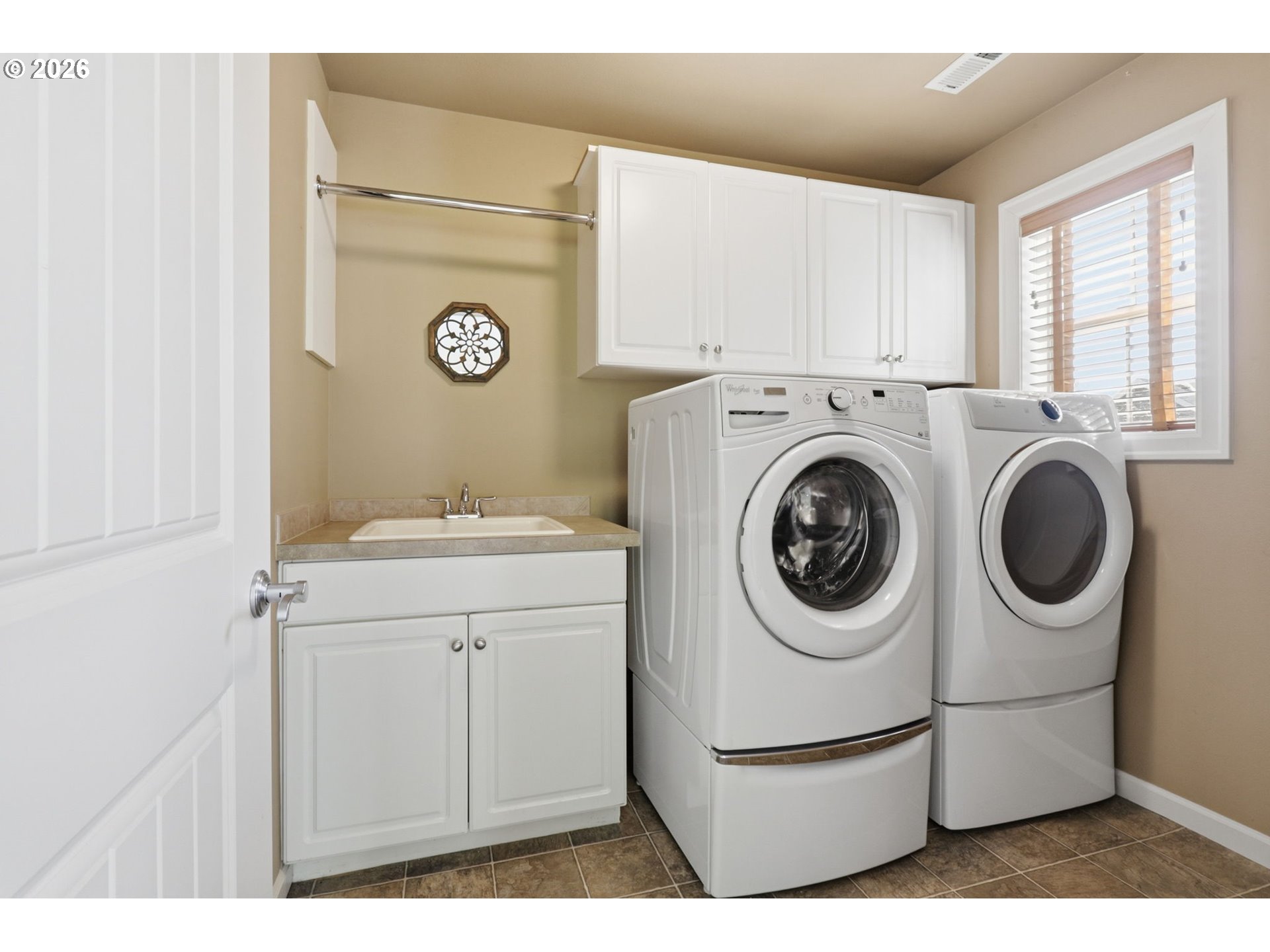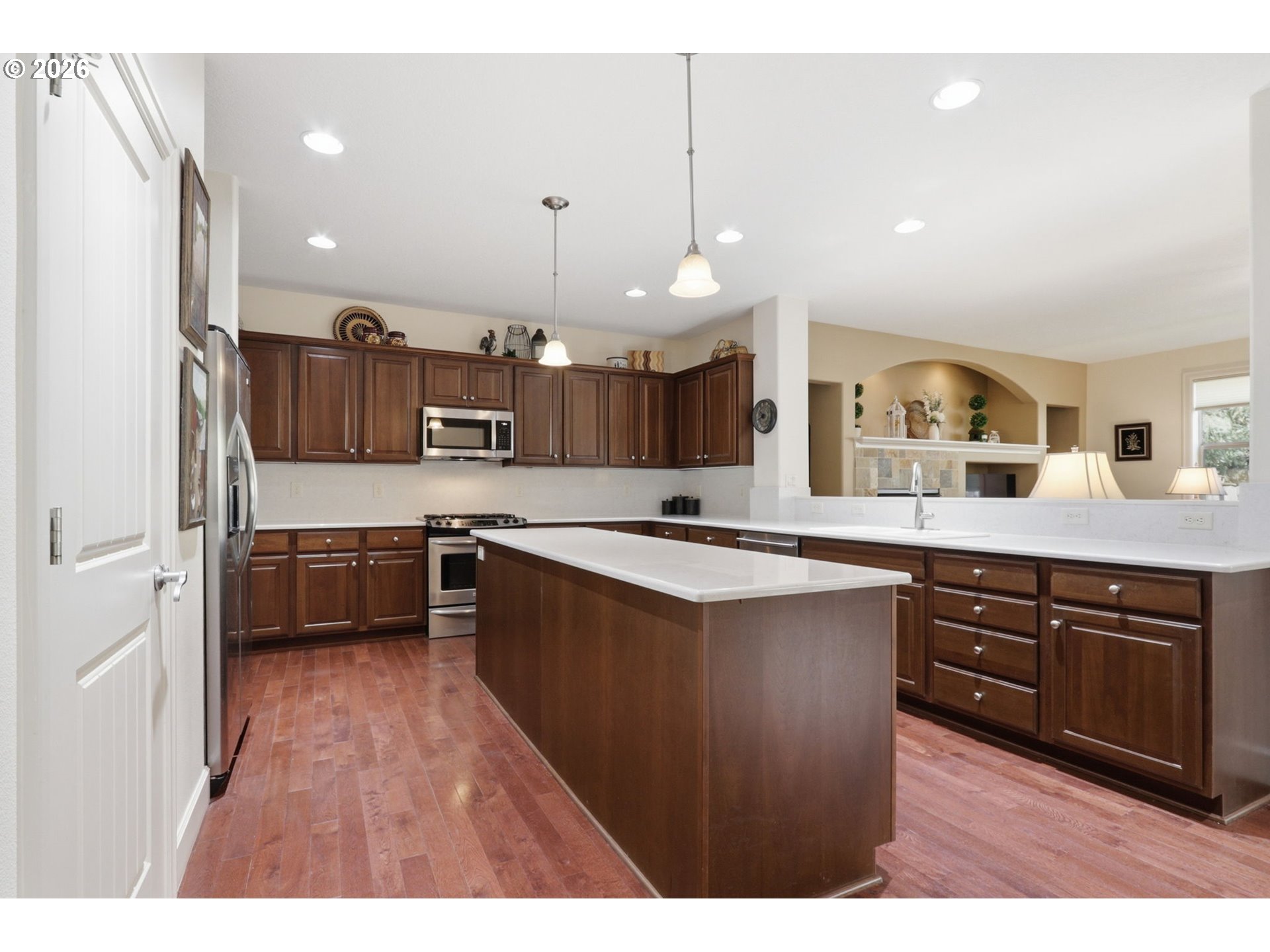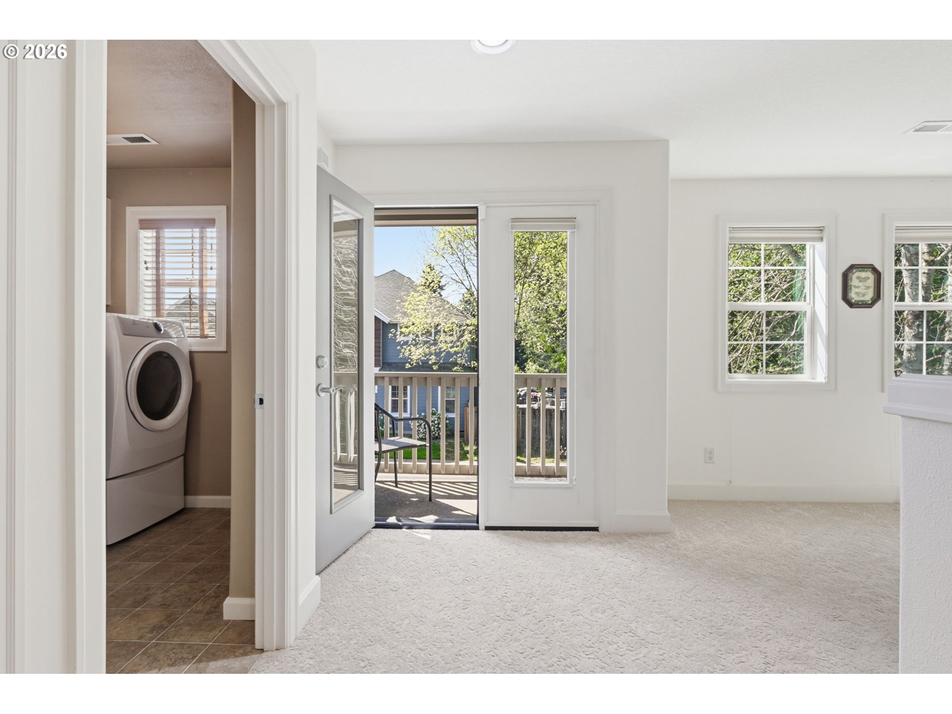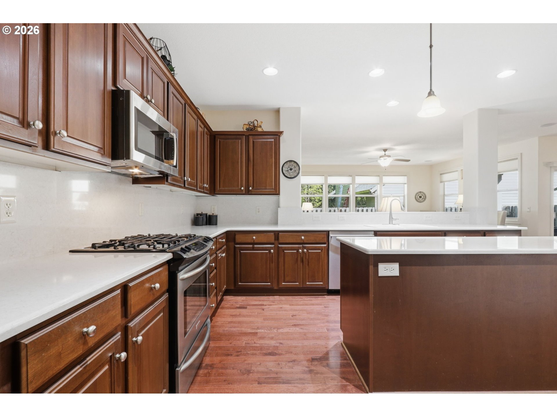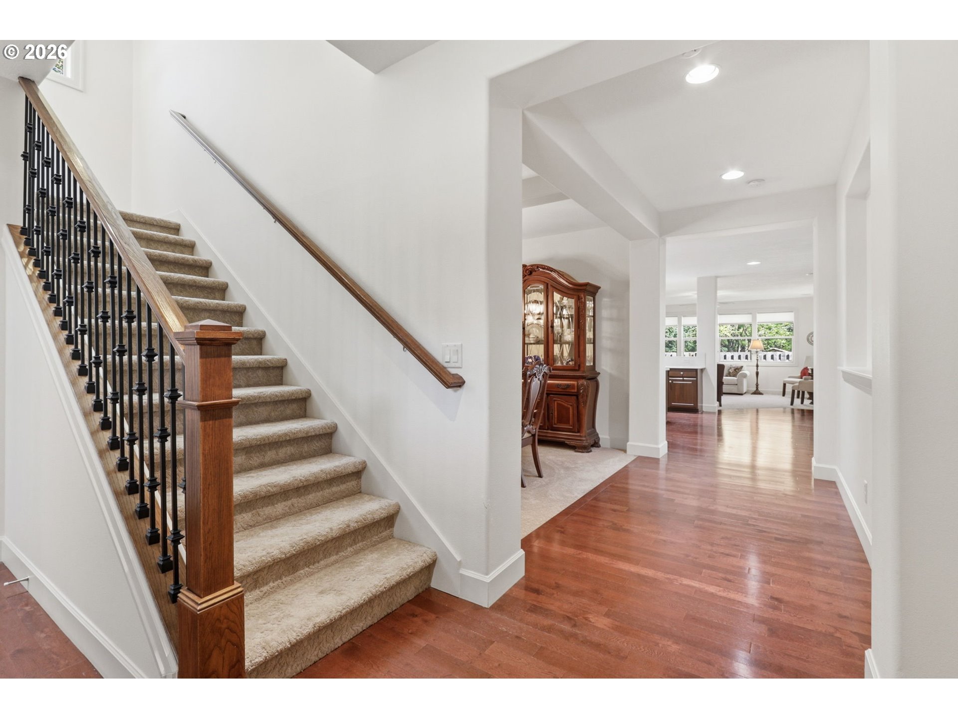 Beautifully maintained and showcasing true pride of ownership, this exceptional corner-lot home sits adjacent to greenspace on a private dead-end street in one of Tigard’s most desirable neighborhoods. Ideally located within walking distance to schools and just minutes from Cook Park, Bridgeport Village, and convenient highway access. Inside, you’ll find newer carpet and paint throughout, along with a spacious open kitchen designed for entertaining. Features include new quartz countertops, stainless steel appliances, a large island, and a pantry. Additional highlights include hardwood floors, a welcoming living room with built-ins, a fireplace with tile surround, and wood-wrapped windows. The formal dining room offers a box-beam ceiling and peaceful views of the adjacent greenspace. Upstairs, French doors open to a balcony, and a generous loft with vaulted ceilings provides additional living space with greenspace views. The upper level also includes a laundry room with cabinets and a sink, a hall bathroom with dual sinks, tile counters and floors. The expansive primary suite features vaulted ceilings, a spa-like bathroom with dual sinks, a soaking tub, a walk-in shower with tile surround, and a large walk-in closet with multiple windows.Outside, a slider off the nook leads to a large covered back patio and low-maintenance turf grass. Stay cool and comfortable all summer long with the central air conditioning system. A spacious 3-car tandem garage offers excellent flexibility for parking, a workshop, or home gym space.