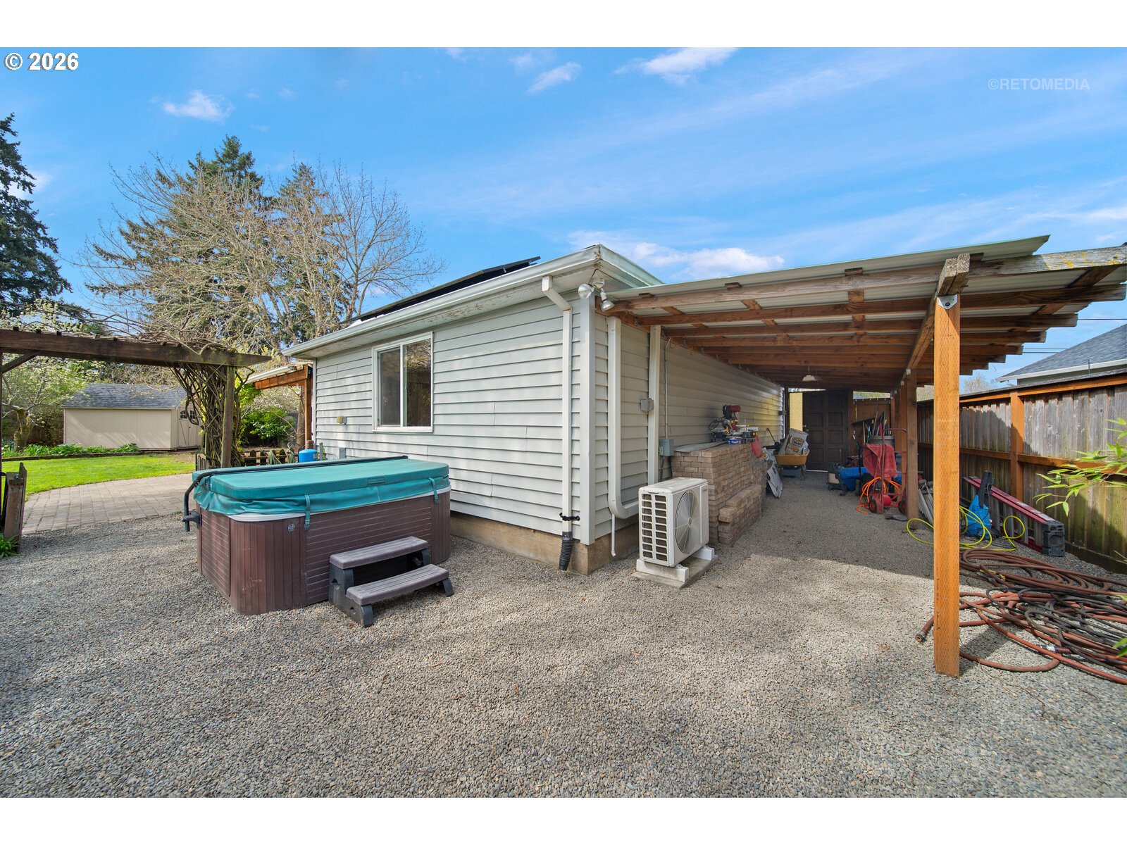 Welcome to this warm and inviting single-level home near downtown Hillsboro, offering 3 bedrooms, 2 bathrooms, and a beautiful blend of modern comfort and mid-century charm on a large, private lot.Inside, you’ll find stunning 1” maple hardwood floors and abundant natural light throughout. The cozy living room features a gas fireplace, while an elegant archway leads to the dining room with built-in shelving and continued hardwoods. The spacious kitchen offers generous counter space, ample cabinetry, a free-standing gas range, dishwasher, and stainless steel appliances.The primary bedroom is privately located on the opposite end of the home, complete with built-in shelving and wall-to-wall carpet. While not technically a suite, it has direct access to a full bathroom/utility room with tile flooring, a mud-set tile shower, and built-in cabinets. From here, step out to the covered patio for easy indoor-outdoor living.The backyard is truly special—large, fenced, and incredibly private with no visible neighboring homes. Enjoy a magical setting with two tool sheds, a smaller shed, chicken coop, raised garden beds, hot tub, and a cascading pond with goldfish and blooming lily pads. An irrigation well adds convenience.Energy efficiency shines with owned solar panels and double-pane vinyl windows. The oversized attached garage has been converted into a 34’ x 19’ climate-controlled studio with separate exterior access and durable flooring, easily convertible back if desired. A spacious driveway offers ample parking.Located close to shops, restaurants, coffee spots, bakeries, food carts, and local markets, this home is a peaceful retreat with everyday convenience—perfect for enjoying quiet mornings on the patio and cozy evenings at home. [Home Energy Score = 10. HES Report at https://rpt.greenbuildingregistry.com/hes/OR10246453]