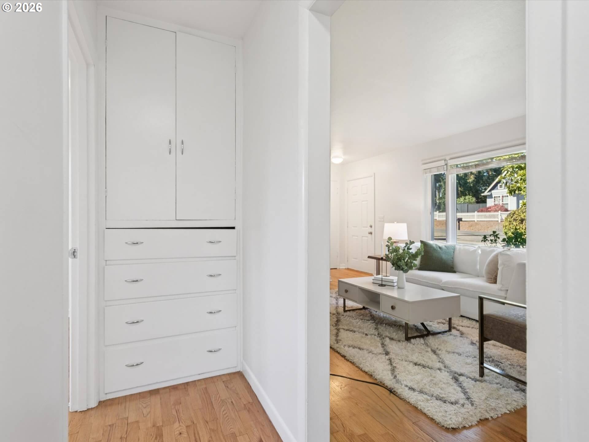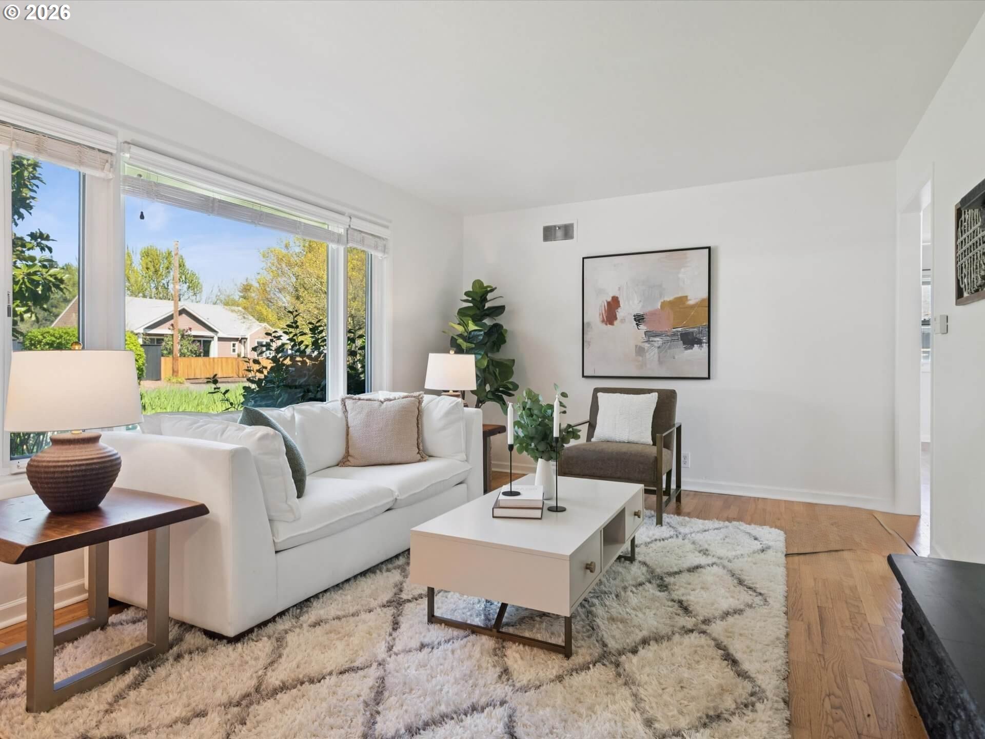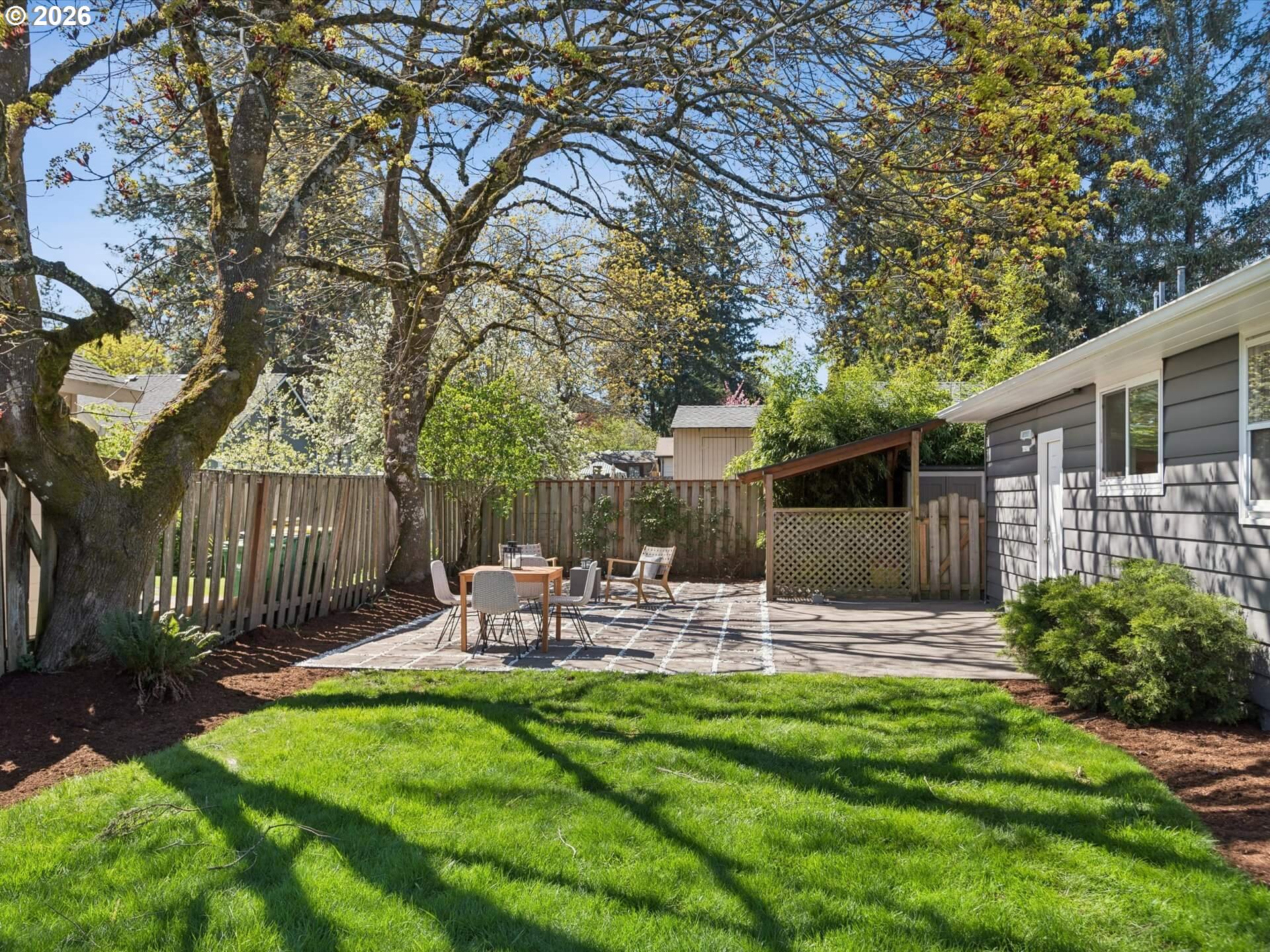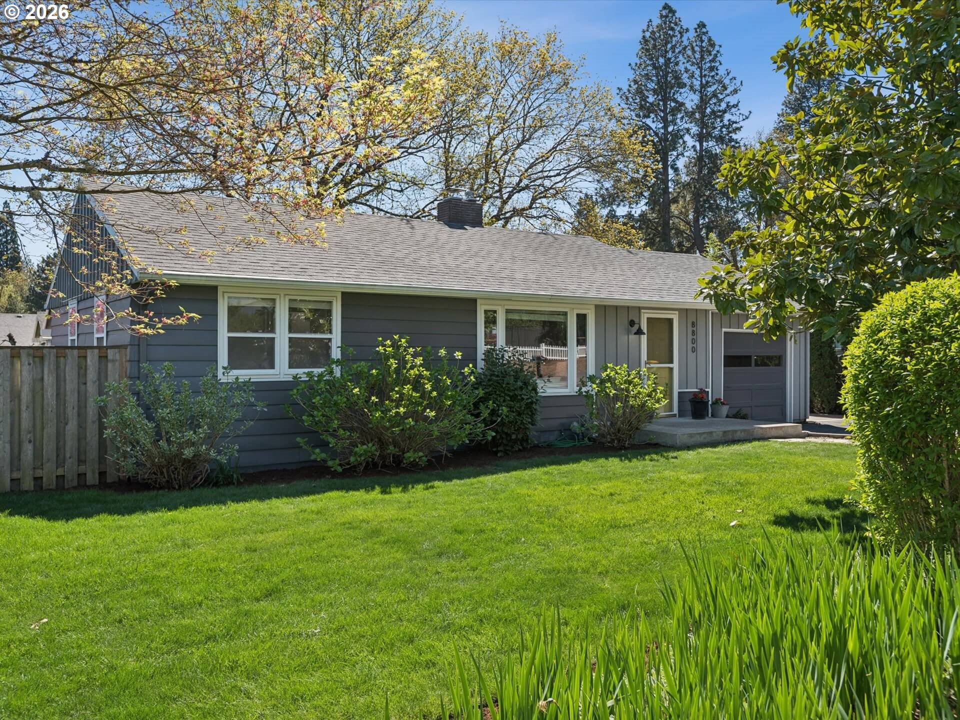 A mid-century beauty. Situated on an oversized lot on a quiet, dead-end street, this home is updated, dialed, and cute-as-can-be! Featuring hardwood floors throughout, new plumbing (2023), a new electric panel (2023), as well as AC, fresh paint – both exterior and interior, new light fixtures, and a newer gas furnace. A wood burning stove and built ins add to the charm and warmth of this home.The private, fenced yard lives like a retreat with lush, green grass, and established landscaping, including an apple tree, roses, and hydrangeas. The patterned pavers are perfect for BBQs and summer gatherings. Close to shopping, eateries, and parks, this home offers the perfect balance of convenience and tranquility. This one won't last!