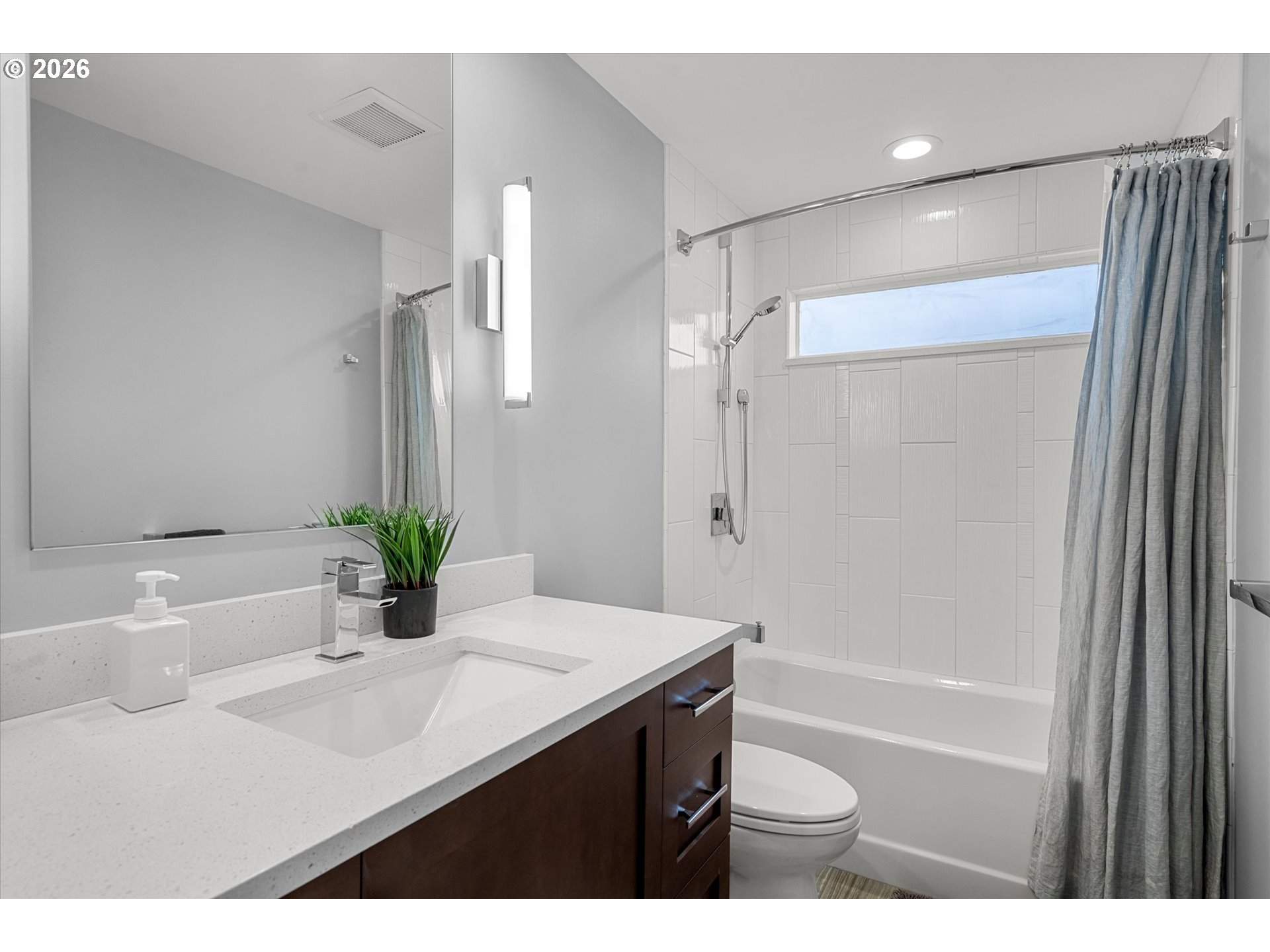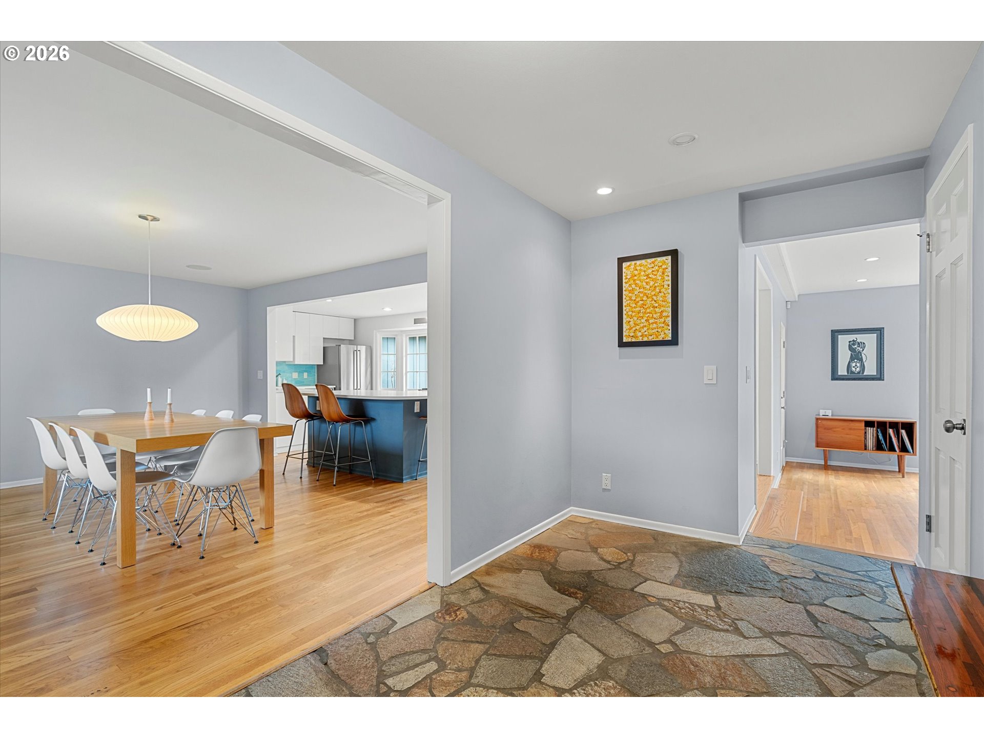 Heart of Raleigh Hills! Walk to Portland Golf Club, Jesuit, OES, and the brand-new Raleigh Hills Elementary. A classic mid-century one-level ranch that's been thoughtfully opened up over the years for a great open, circular floorplan. The living room features a white brick gas fireplace and expansive picture windows that fill the space with natural light, complemented by warm hardwood floors throughout. The newly remodeled kitchen includes a large L-shaped island, quartz countertops, brand-new appliances, and updated lighting. It flows seamlessly into the dining and living areas with direct access to the backyard deck. Both bathrooms have been newly remodeled with modern updates. Fully fenced backyard with mature hedges, gardening beds, and a private paved area ready for a hot tub. Just minutes away from RedTail Golf Course and nearby parks such as Raleigh Park and Swim Center, Raleigh Scholls Park, and Tualatin Hills Nature Park. The neighborhood offers a peaceful, welcoming environment with wide streets, oversized lots, and mature landscaping.