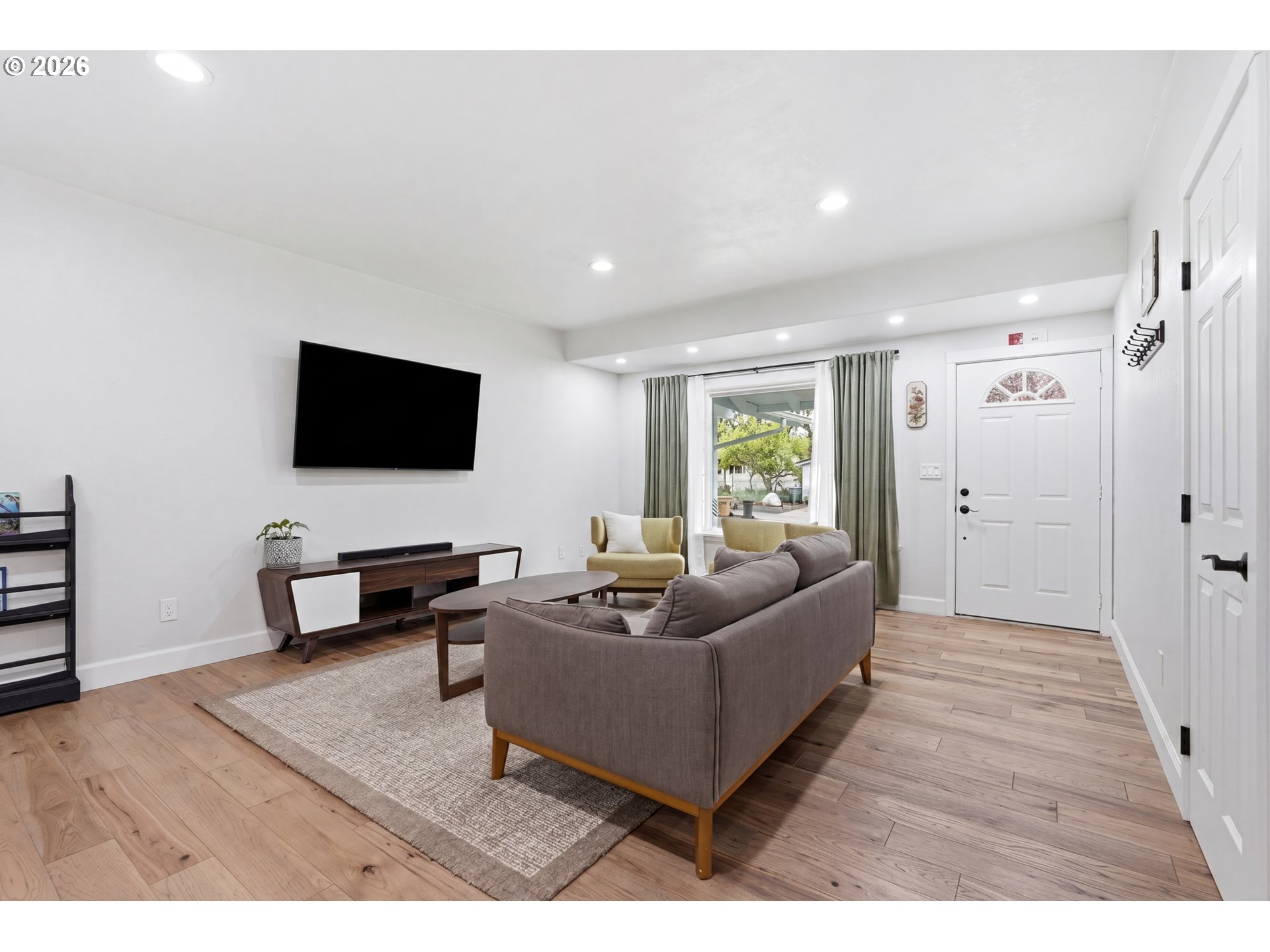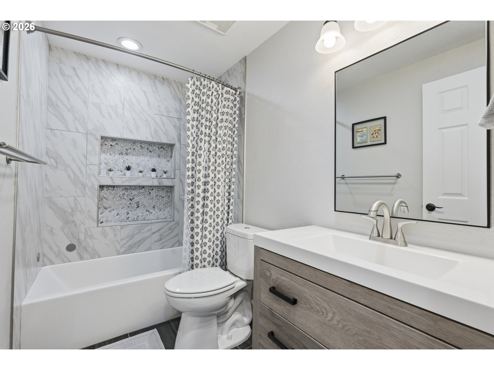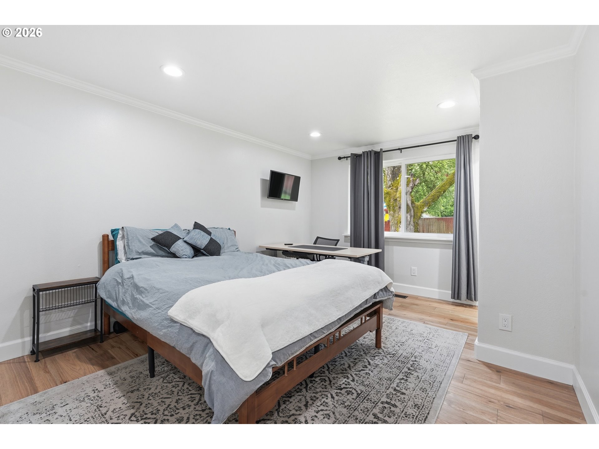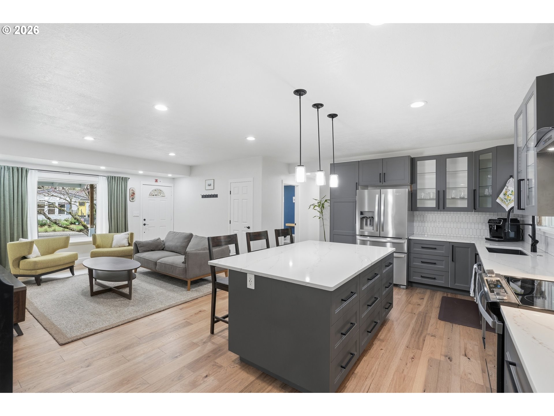 Beautifully renovated one-level ranch designed for easy living, featuring rare dual primary suites and seamless indoor-outdoor flow. High ceilings and engineered flooring throughout create a light-filled, open feel from the moment you step inside. At the center of the home, the spacious kitchen is designed to impress, with stainless steel appliances, quartz countertops, an expansive island, pantry, and soft-close cabinetry—perfectly suited for both everyday living and effortless entertaining. The open-concept living and dining areas connect naturally, with direct access to the backyard deck, creating an easy extension of your living space. With 3 full bathrooms and generously sized bedrooms, the layout offers flexibility for a variety of living situations. The two primary suites each feature their own ensuite bathrooms. The main primary includes a walk-in closet with built-in shelving and French doors that open directly to the back deck—ideal for quiet mornings or unwinding in the evening. Outside, the fully fenced and level backyard is thoughtfully designed for both relaxation and play. Enjoy a spacious deck for entertaining, raised garden beds, a play structure, and a storage shed—everything you need for functional, year-round outdoor living. Enjoy a prime Tualatin location just minutes from local shops, restaurants, and parks, with easy highway access for added convenience. Come see it for yourself!