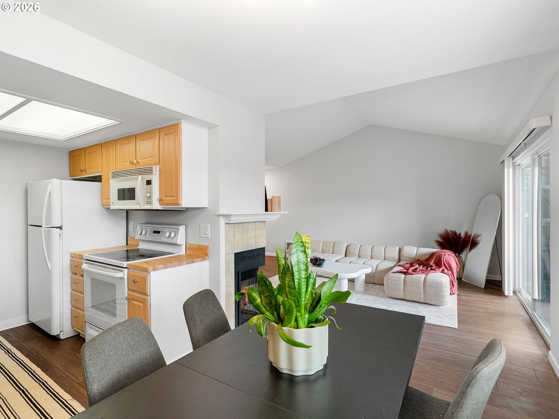 Coveted top floor, end-unit location, this beautifully updated 1-bedroom, 1-bath condo in the heart of Murrayhill offers 753 square feet that truly lives large. Open floorplan with vaulted ceilings and sliding door to the covered patio, bring in natural light while a cozy wood-burning fireplace creates the perfect space to unwind inside. Updates to the flooring, kitchen, bathroom, hot water heater and more, make this unit move in ready! Hard to find additional storage inside the condo include a coat closet at the entrance, storage room on your covered deck, walk-in closet in the bedroom, and a dedicated laundry area with shelving. Well managed HOA covers water, sewer, trash, exterior maintenance(and more!) and includes sought after amenities like an outdoor pool and spa, gym, and party room. HOA recent updates to the complex include roofs, gutters, downspouts, exterior paint, windows, and more. Ideally situated just minutes from Murrayhill’s shops, restaurants, parks, and top conveniences, with quick access to major freeways for an easy commute—this location offers the perfect balance of neighborhood charm and everyday accessibility. OPEN HOUSE Saturday 3/21 11am-1pm.