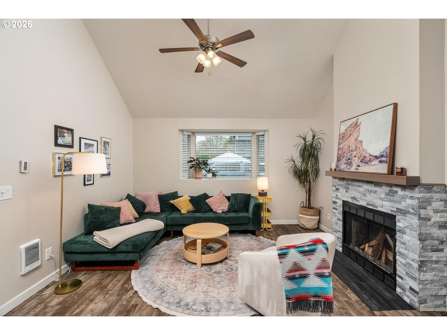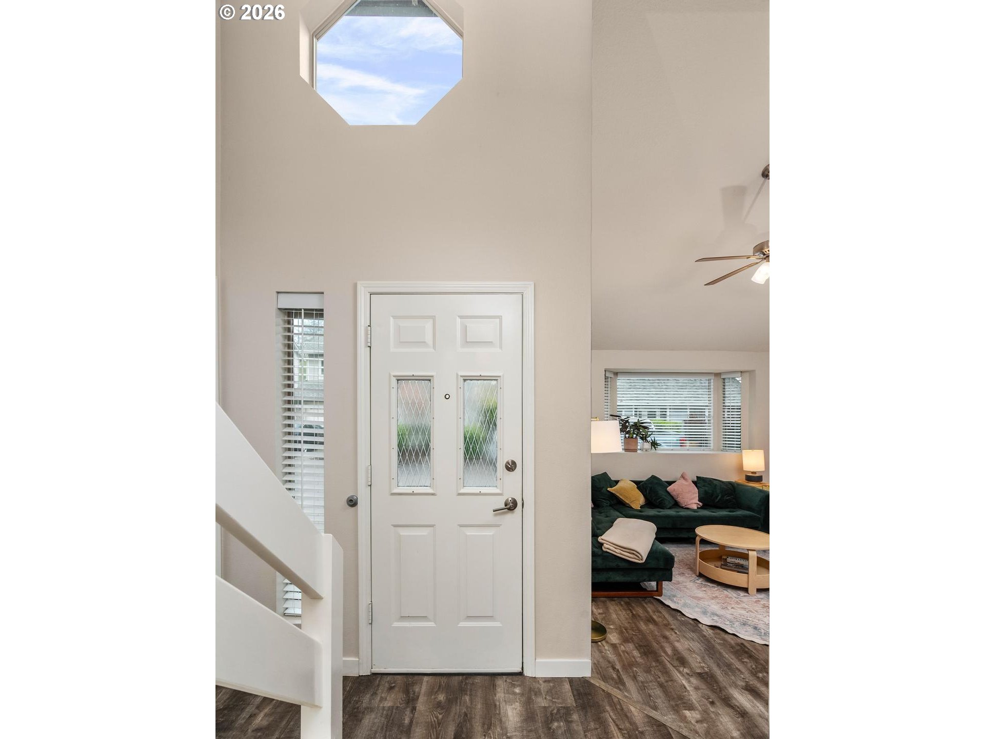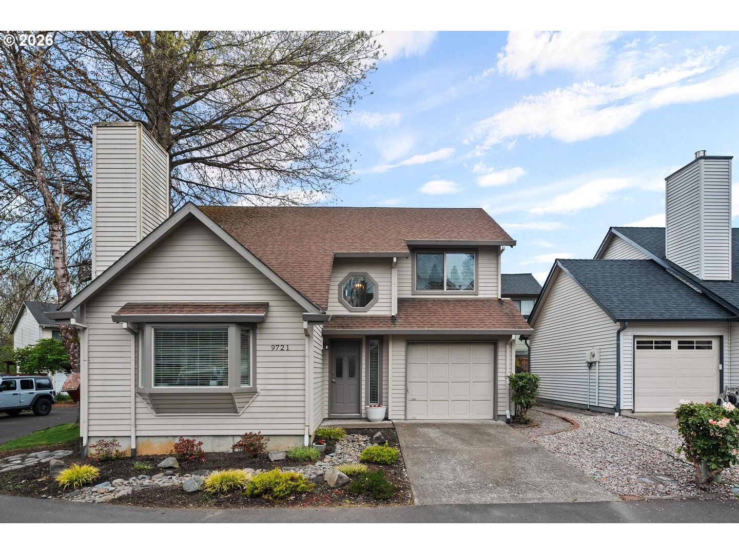 Tucked on a quiet corner lot in a well-kept Tigard community, this detached two-story home offers an ideal blend of comfort and value. Vaulted ceilings in the main living areas create an open, airy feel filled with natural light, anchored by a cozy wood-burning fireplace. The updated kitchen features quartz counters, a pantry for storage, and stainless steel appliances with the refrigerator included, while refreshed bathrooms continue the modern feel throughout. Upstairs, a spacious loft provides flexibility for a home office, workout area, or creative space. The bedrooms offer a comfortable and private retreat, both with vaulted ceilings that enhance the sense of space, including a generously sized primary with ample closet storage. The washer and dryer are also included for added convenience. Enjoy a private fenced paver patio, attached one-car garage, and the ease of low HOA dues and property taxes. Located just minutes from Old Town Tigard, you’ll love the convenience to shops, dining, and everyday amenities in a quiet, highly walkable neighborhood.