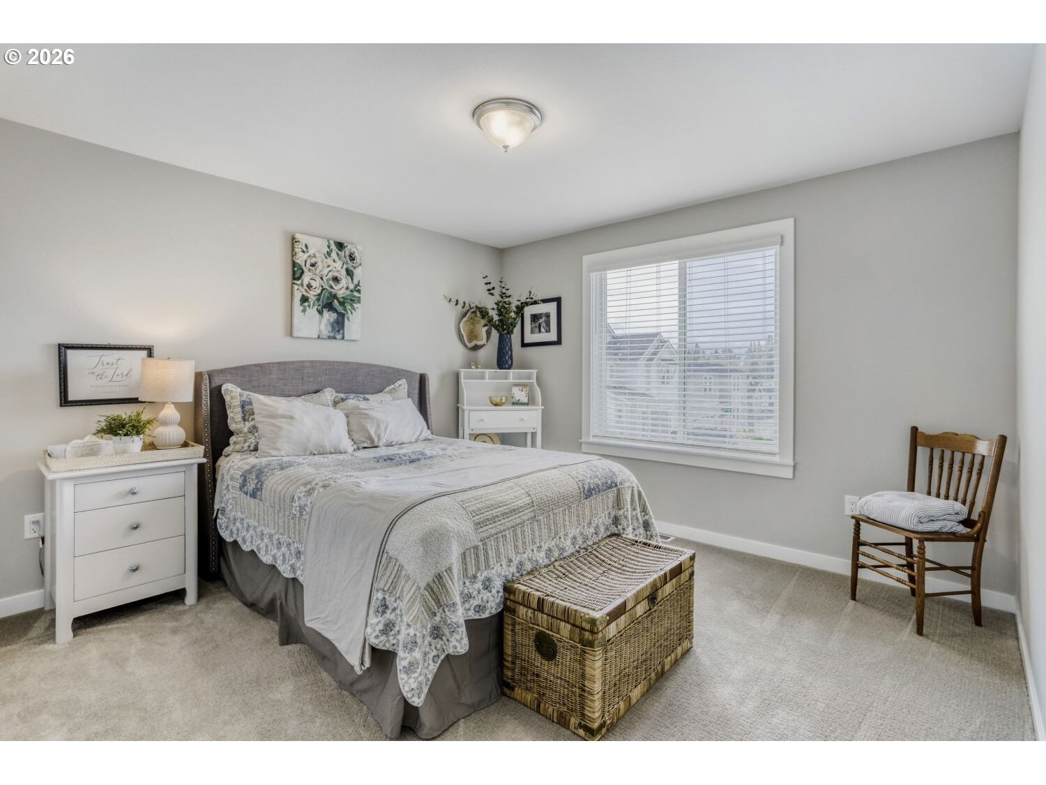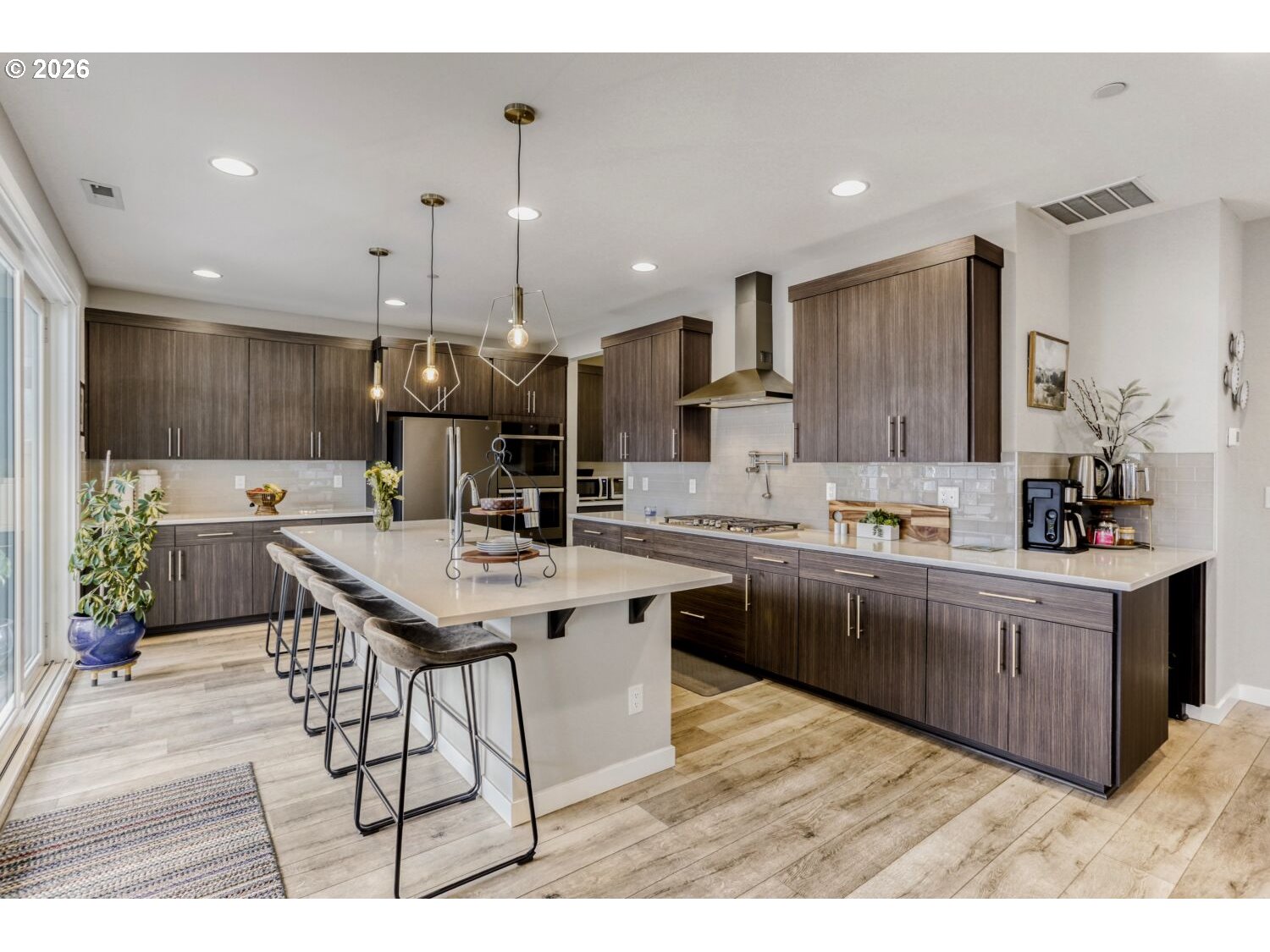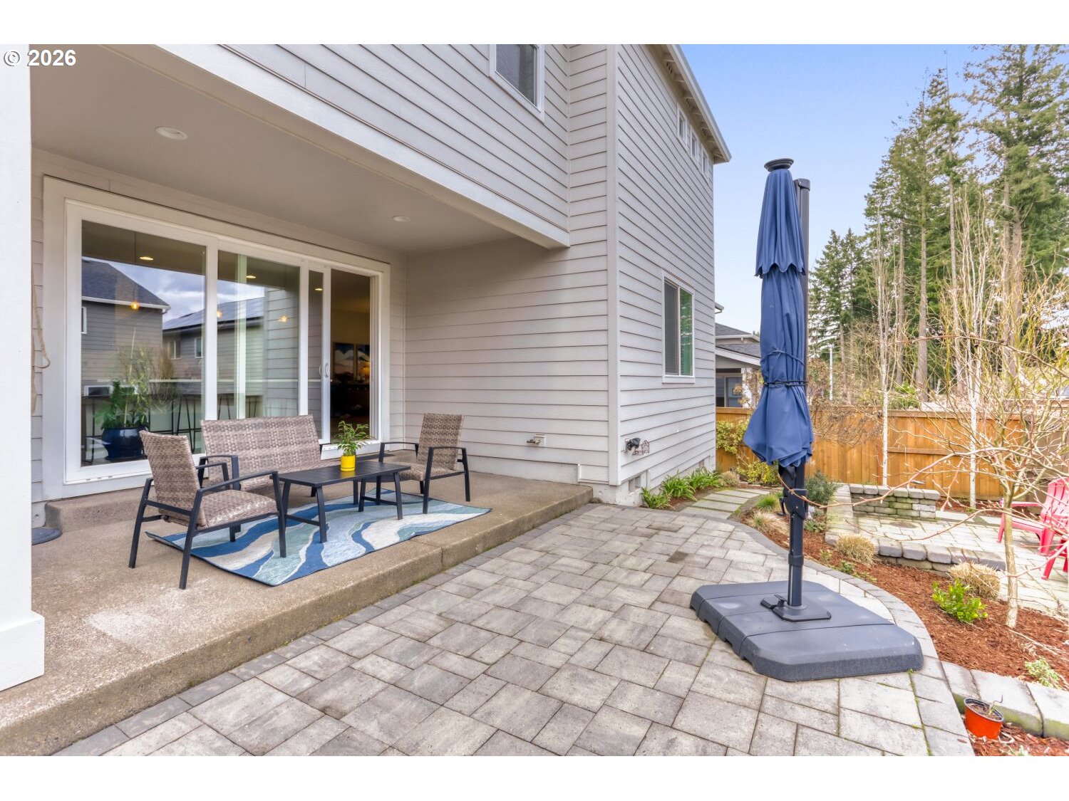 This 3,086 sq ft home offers 5 bedrooms and 3 full baths, including a main-level bedroom and bath ideal for guests or multigenerational living. The open kitchen features quartz countertops, a stainless farm apron sink, pot filler, double wall ovens, slide-out cabinetry, a coffee bar, a large pantry, and a butler’s pantry for added storage and prep space. An expansive sliding door off the kitchen opens to the outdoor patio, creating an easy indoor-outdoor flow. Luxury vinyl plank flooring runs throughout the main level. Upstairs, you’ll find four carpeted bedrooms, two full baths, and a convenient laundry room complete with washer, dryer, sink, and cabinetry. The primary suite enjoys views of Mt. Hood and includes a tiled ensuite with dual sinks, a walk-in shower, linen closet, and separate his-and-hers closets. Quartz countertops are featured in all bathrooms. Home also has a residential interior fire sprinkler system designed to enhance safety and potentially reduce insurance costs. HOA maintains all of front landscaping.