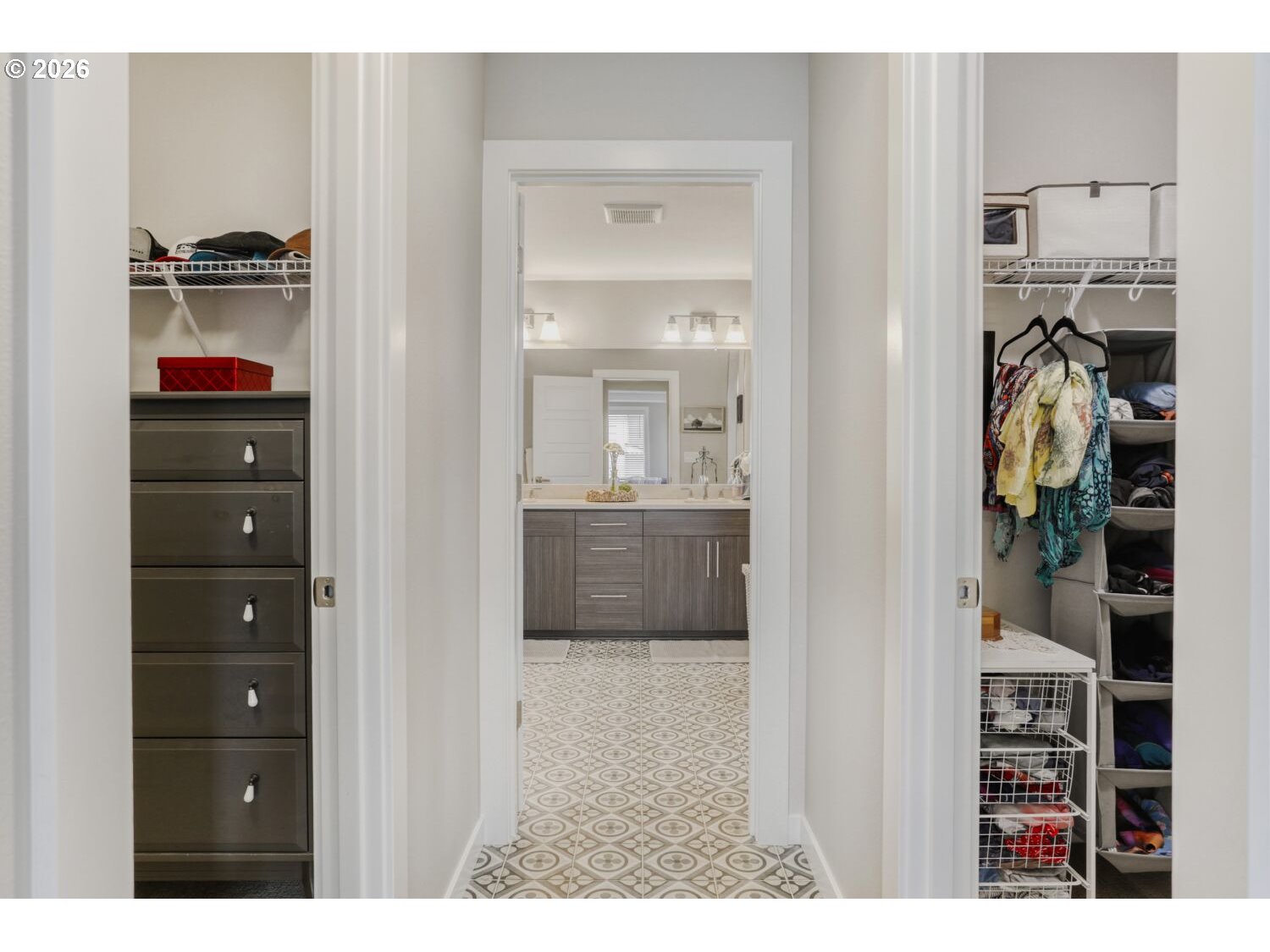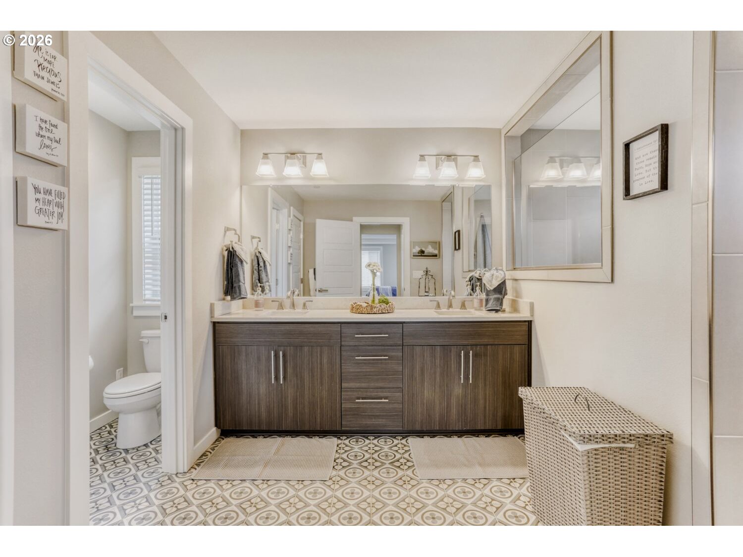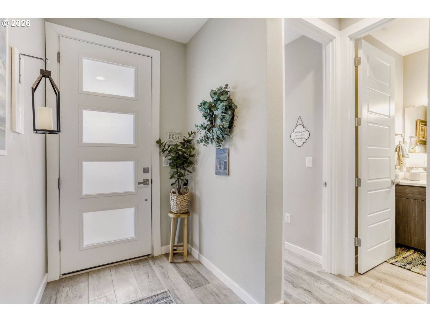 This 3,086 sq ft home offers 5 bedrooms and 3 full baths, including a main-level bedroom and bath ideal for guests or multigenerational living. The open kitchen features quartz countertops, a stainless farm apron sink, pot filler, double wall ovens, slide-out cabinetry, a coffee bar, a large pantry, and a butler’s pantry for added storage and prep space. An expansive sliding door off the kitchen opens to the outdoor patio, creating an easy indoor-outdoor flow. Luxury vinyl plank flooring runs throughout the main level. Upstairs, you’ll find four carpeted bedrooms, two full baths, and a convenient laundry room complete with washer, dryer, sink, and cabinetry. The primary suite enjoys views of Mt. Hood and includes a tiled ensuite with dual sinks, a walk-in shower, linen closet, and separate his-and-hers closets. Quartz countertops are featured in all bathrooms. Home also has a residential interior fire sprinkler system designed to enhance safety and potentially reduce insurance costs. HOA maintains all of front landscaping.