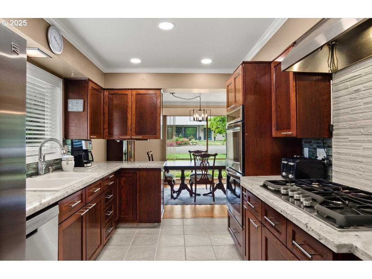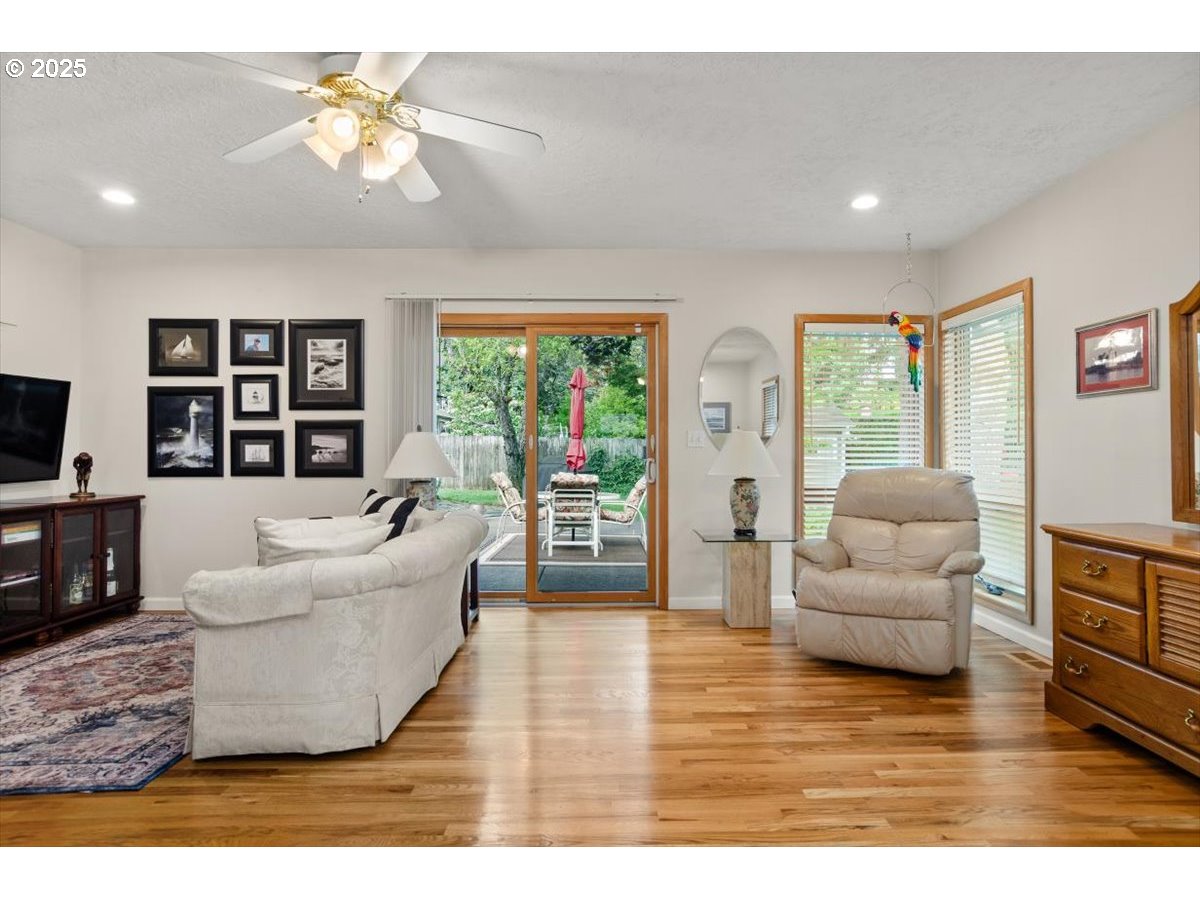 Discover timeless Mid-Century Modern style with one-level living and over 2,400 square feet of comfort, including separate living or guest quarters offering an incredible opportunity for multi-generational living with a kitchenette, bathroom with double sinks and walk-in shower, backyard access, and private exterior entrance. The home showcases hardwood floors, built-ins, original tile, crown molding, and french doors. Lovingly cared for and thoughtfully improved, updates include a high-efficiency gas furnace and central A/C (2023), roof (2018), exterior paint (2017), hot water tank, electrical panel, and most windows replaced. The stunning kitchen boasts granite countertops, double ovens, newer appliances including a 5-burner gas cooktop, refreshed cabinetry, pantry, eating bar, and tile flooring. A spacious living room with a 2-sided gas fireplace flows seamlessly into the dining room with floor-to-ceiling windows and abundant natural light, while a cozy family room off the kitchen offers slider access to the backyard. The large .31-acre lot provides privacy with a fenced backyard, patio, three sheds, and a level lawn perfect for entertaining, kids, and pets, plus a long driveway with plenty of parking space and room for a 38’ RV or boat. Appliances included, move-in ready convenience! Located on a quiet dead-end street and situated in unincorporated Washington County with lower property taxes! Ideally located within walking distance of Red Tail Golf Course, Harman Swim Center and Park and local schools, with easy access to Washington Square Mall, Highway 99, 217, shopping, restaurants, and all the daily necessities. Schedule your tour today and make this special home your own!