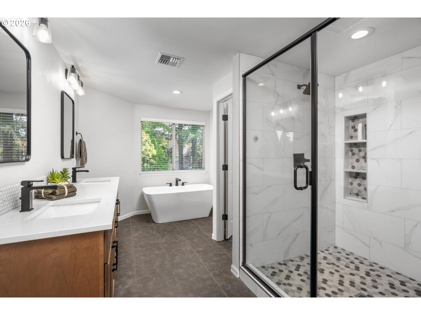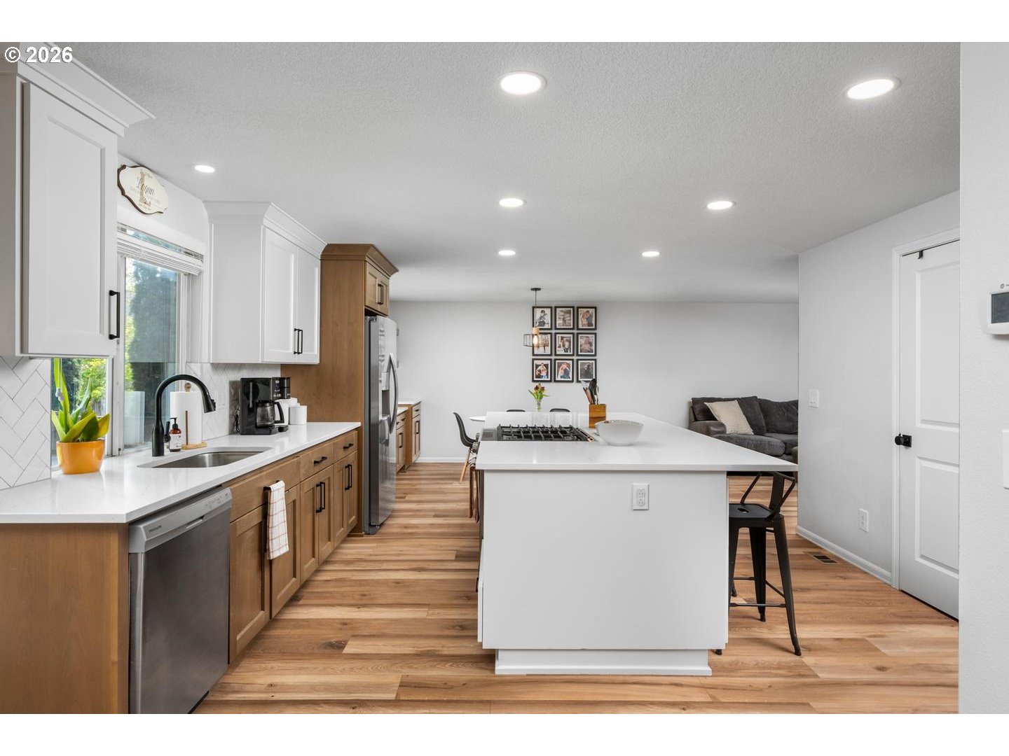Open House: Friday 4/17 4-6pm. Best of both worlds! Renovated to perfection with an open concept layout and a big sunny backyard. It's a must see renovation in Beaverton's sought after Sexton Mountain neighborhood. New interior finishes throughout & the thoughtfully expanded kitchen make this home extremely unique. You will love the bright, open living spaces, luxury vinyl plank flooring & the well appointed kitchen featuring quartz counters, pantry, big island & eating bar. Designed for everyday living & entertaining, the seamless indoor-outdoor flow from the kitchen & family rooms to a flat fenced backyard with patio is perfect for play, pets, or gatherings. The open dining area with built-in bar adds an extra touch for hosting. The spacious primary suite with walk-in closet & spacious spa inspired bathroom offers a peaceful sitting area or an ideal office nook. The upper level is complete with a big hall bathroom & laundry room. Located just minutes from Sexton Mountain Elementary, Mountainside High School & all South Beaverton conveniences, this move-in ready home is better than new construction!