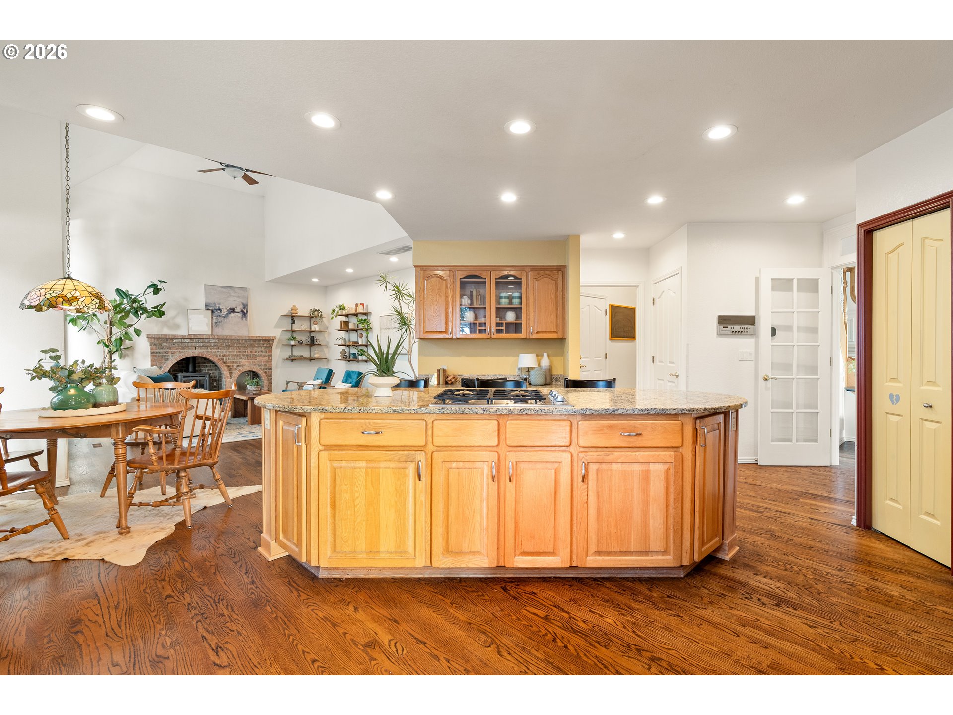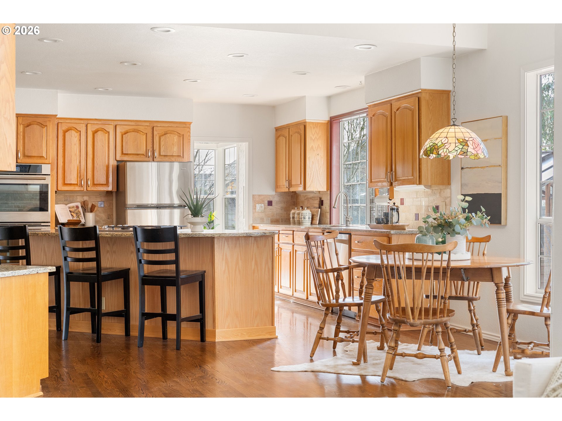 Start your next chapter in this timeless South Beaverton home situated on a generous corner lot backing to Steeplechase Park, where mature trees provide privacy and tranquility. Thoughtfully cared for, the residence offers space, calm, and a strong connection to its natural surroundings. The welcoming entry leads into light-filled living where hardwood floors, tall ceilings, and generous proportions create an airy ambiance and effortless flow. The layout is intuitive yet flexible, ready to adapt to everyday needs. At the heart of the home, the kitchen and family room come together as one expansive gathering space. A large cook’s island and breakfast nook anchor the space, while the two-story family room brings volume, natural light, and a gas stove for warmth. From the dining room, step down into a sunken living room centered around a wood-burning fireplace — an inviting place to unwind. A dedicated office with built-ins and a wet bar adds flexibility for work-from-home or creative use. Upstairs, four comfortable bedrooms are positioned for quiet separation from the main living areas. The serene primary suite offers vaulted ceilings, abundant light, a walk-in closet, soaking tub, and heated bathroom floor. The spacious deck sets the stage for indoor-outdoor living, complemented by a greenhouse and shed for added function. Tiered, raised garden beds await your green thumb. An attached three-car garage provides ample room for vehicles, storage, and hobbies. Well-maintained systems and a smart thermostat add modern comfort and efficiency. Close to parks, trails, and everyday conveniences, this home artfully balances privacy, design, and enduring livability.