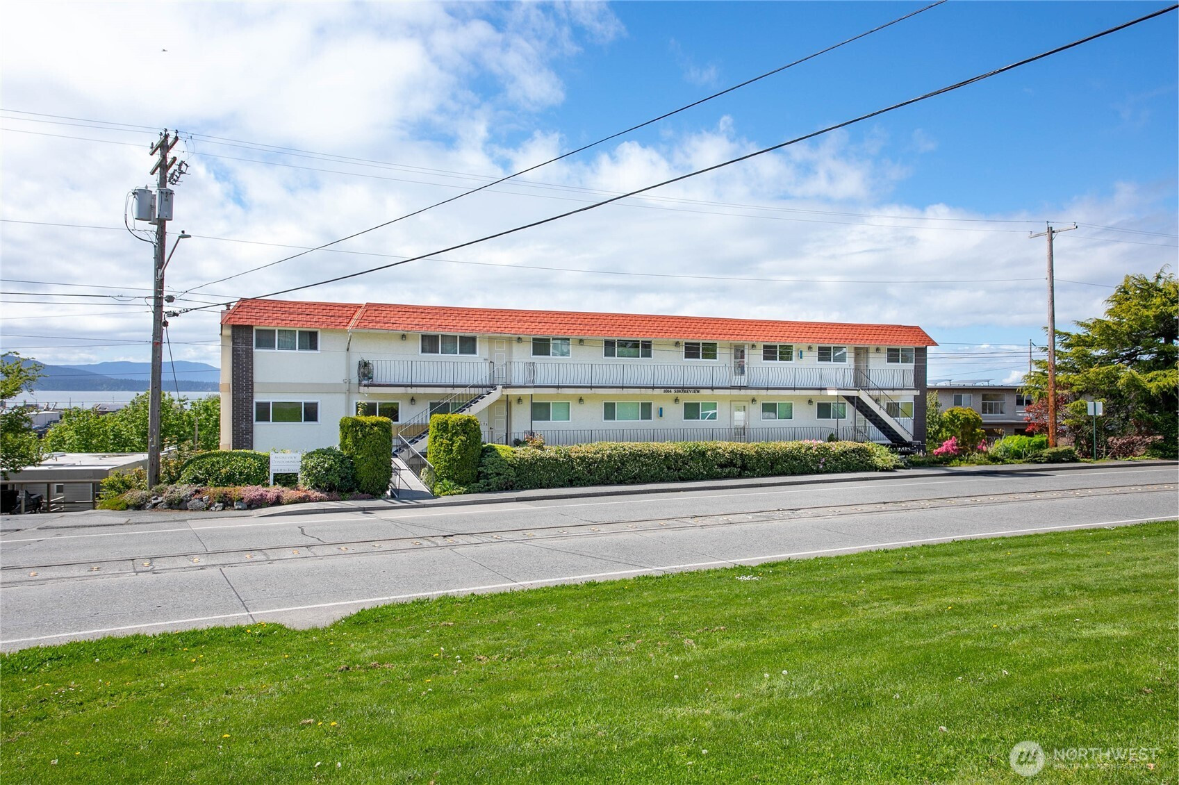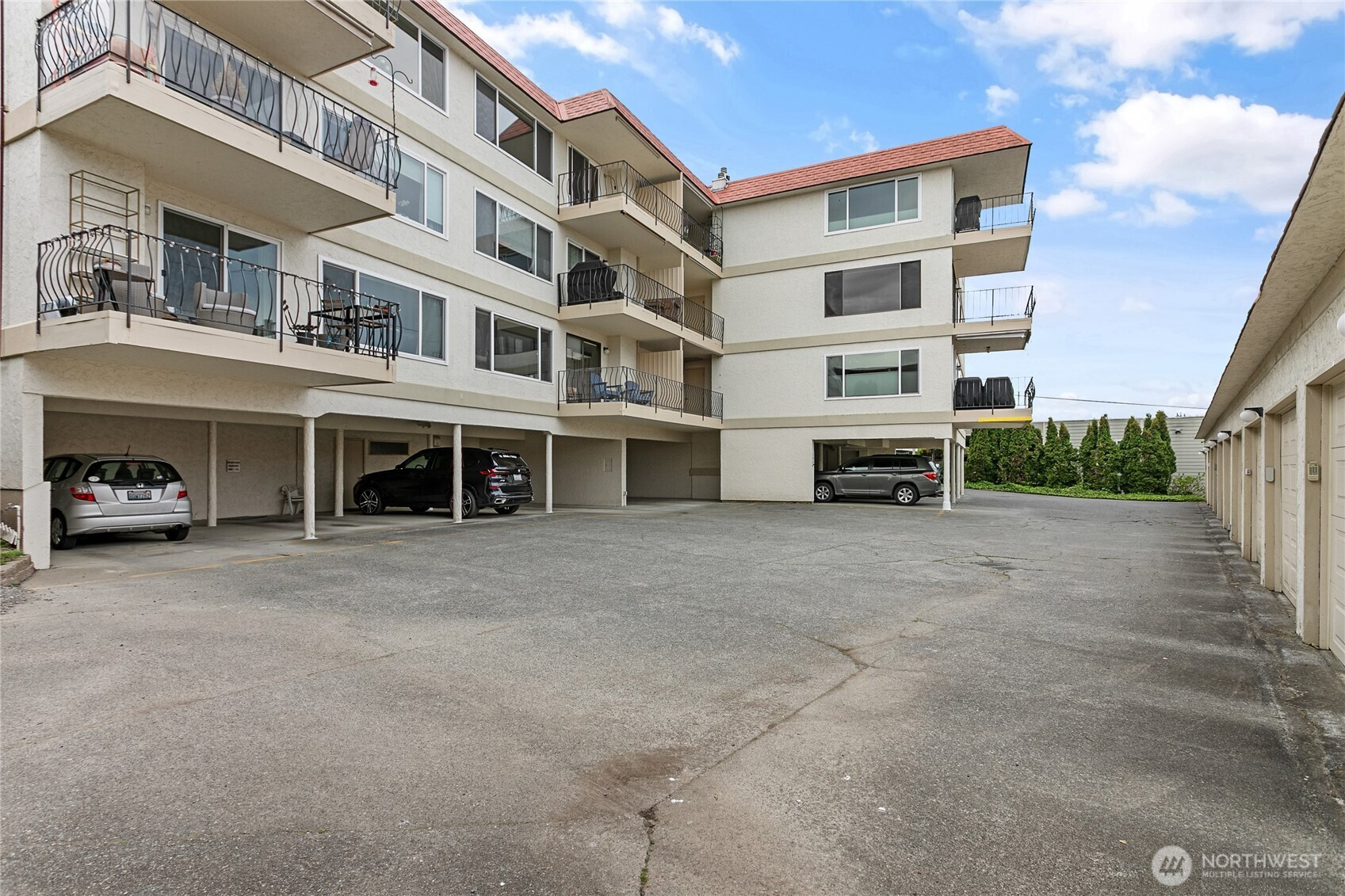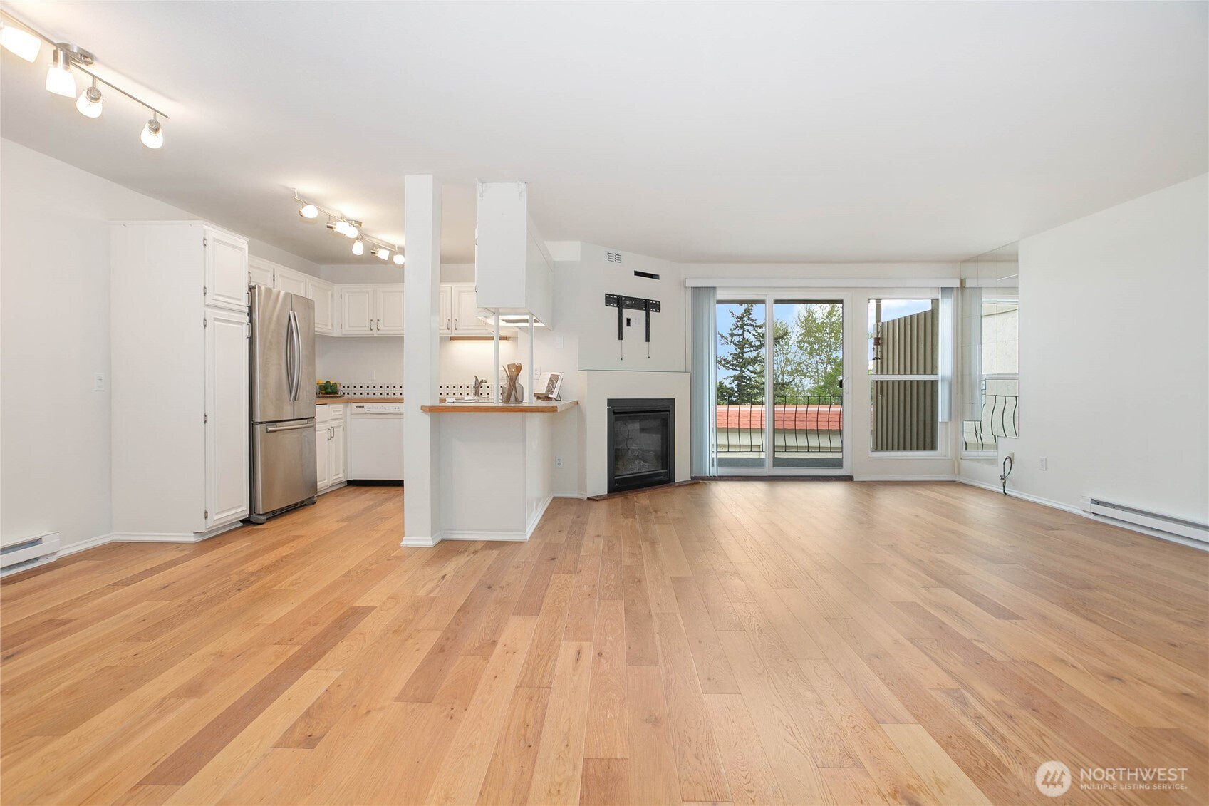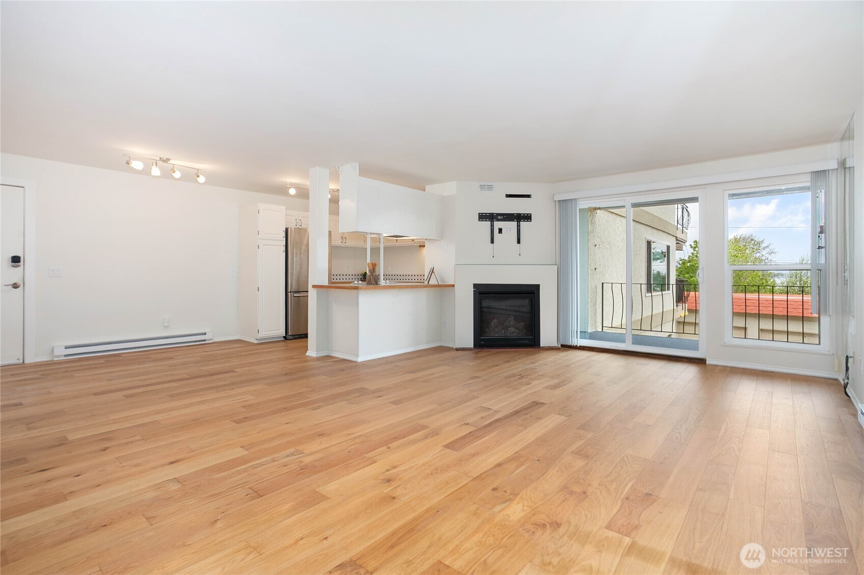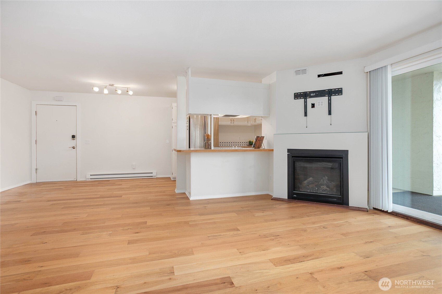 Enjoy breathtaking sunsets and peaceful water views from this beautiful Fairhaven condo! Offering 1,056 SF of comfortable living space, this 2-bedroom, 1-bath home features an open concept layout that seamlessly connects the kitchen and living room, ideal for both everyday living and entertaining. The inviting living area is anchored by a cozy gas fireplace and opens to a private deck through a sliding glass door, creating the perfect setting to relax and take in the stunning scenery year-round. Recent updates include fresh interior paint and engineered hardwood floors installed within the last four years, adding warmth and a modern touch throughout. Thoughtful improvements such as additional insulation beneath the flooring provide enhanced comfort and sound reduction from the carport below. The spacious full bathroom is well-appointed with dual sinks and generous counter space. This secure, well-maintained building offers elevator access for convenience, along with reserved carport parking and two dedicated storage spaces, ideal for all your gear and seasonal items. Located in the heart of Fairhaven, you’ll love the easy access to charming shops, local restaurants, waterfront parks, and an extensive network of scenic trails. Whether you’re looking for a full-time residence or a low-maintenance getaway, this condo offers the perfect blend of comfort, views, and an unbeatable location.