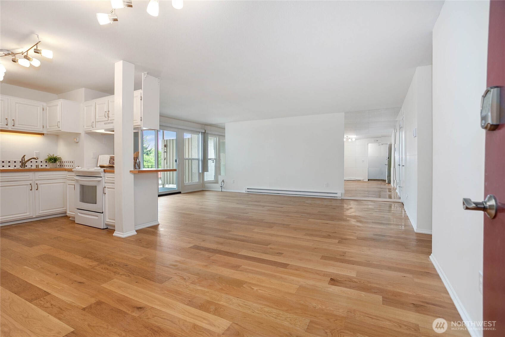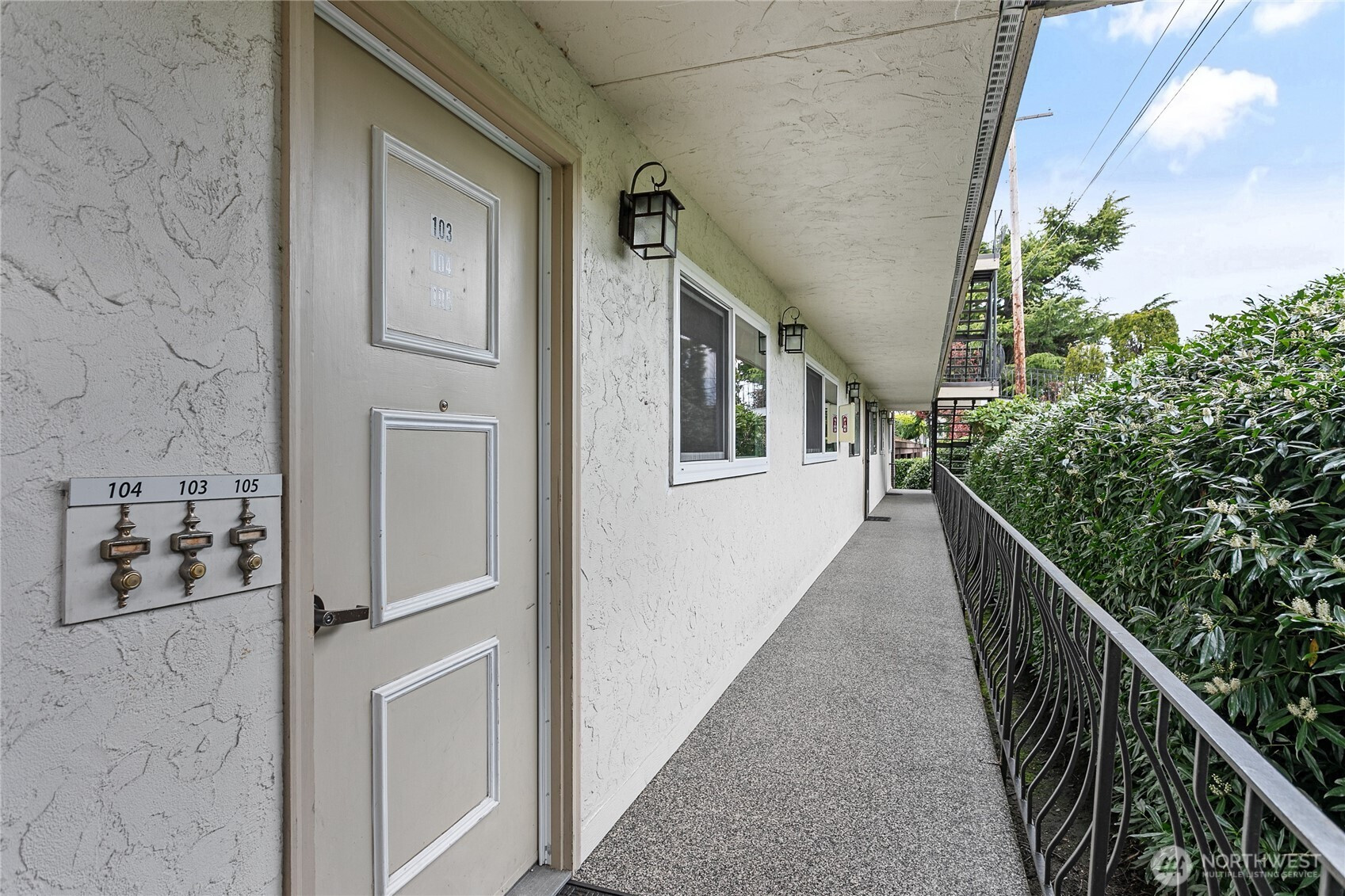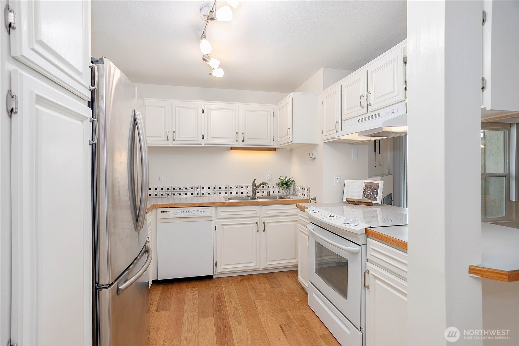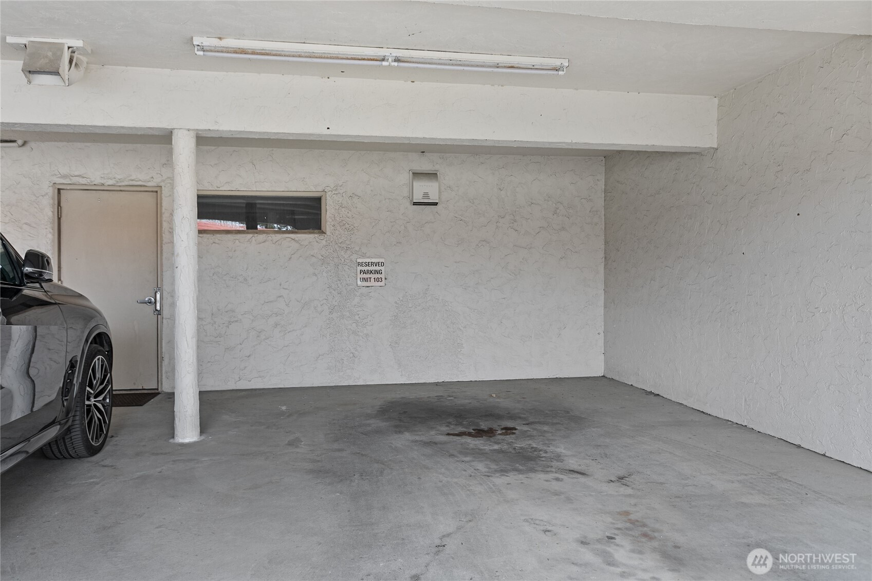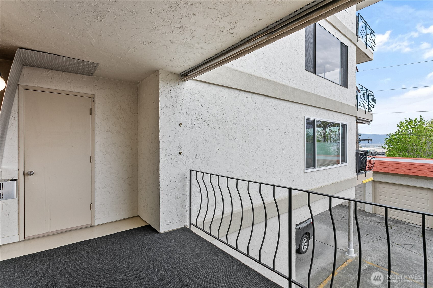 Enjoy breathtaking sunsets and peaceful water views from this beautiful Fairhaven condo! Offering 1,056 SF of comfortable living space, this 2-bedroom, 1-bath home features an open concept layout that seamlessly connects the kitchen and living room, ideal for both everyday living and entertaining. The inviting living area is anchored by a cozy gas fireplace and opens to a private deck through a sliding glass door, creating the perfect setting to relax and take in the stunning scenery year-round. Recent updates include fresh interior paint and engineered hardwood floors installed within the last four years, adding warmth and a modern touch throughout. Thoughtful improvements such as additional insulation beneath the flooring provide enhanced comfort and sound reduction from the carport below. The spacious full bathroom is well-appointed with dual sinks and generous counter space. This secure, well-maintained building offers elevator access for convenience, along with reserved carport parking and two dedicated storage spaces, ideal for all your gear and seasonal items. Located in the heart of Fairhaven, you’ll love the easy access to charming shops, local restaurants, waterfront parks, and an extensive network of scenic trails. Whether you’re looking for a full-time residence or a low-maintenance getaway, this condo offers the perfect blend of comfort, views, and an unbeatable location.