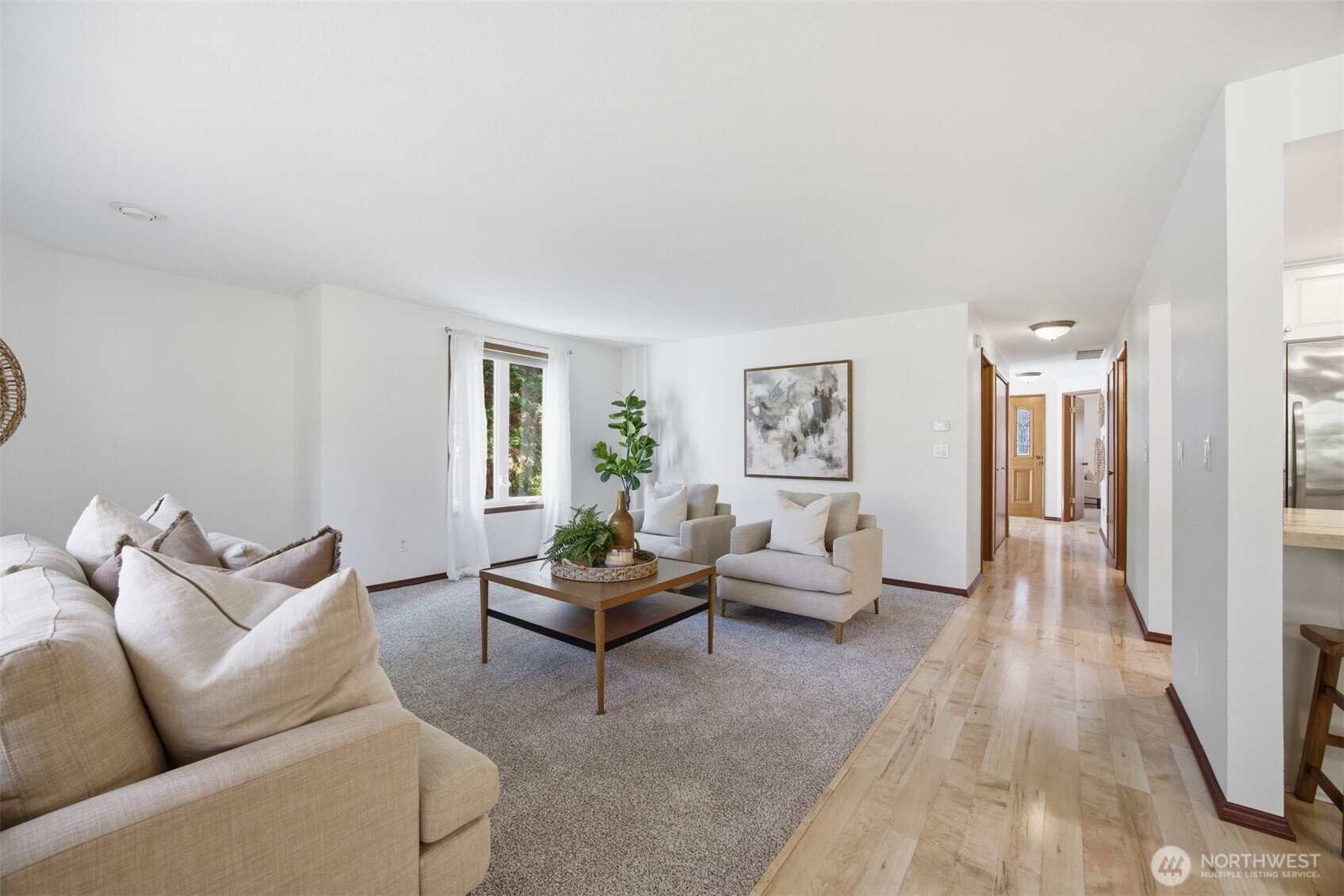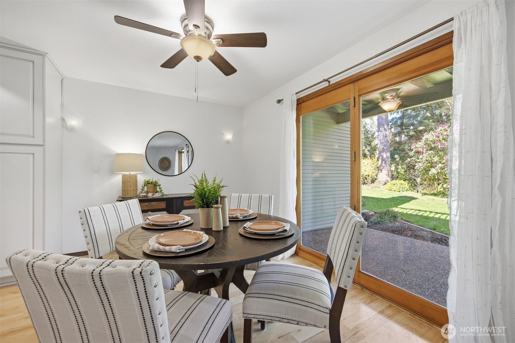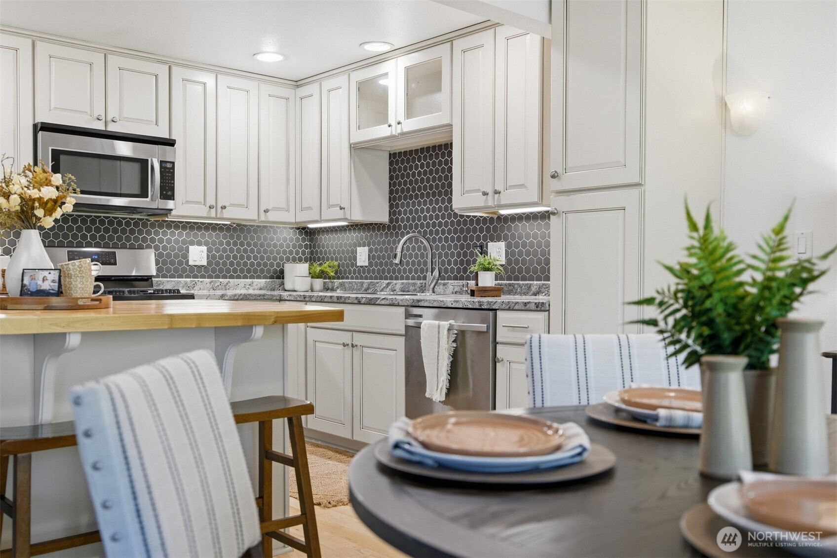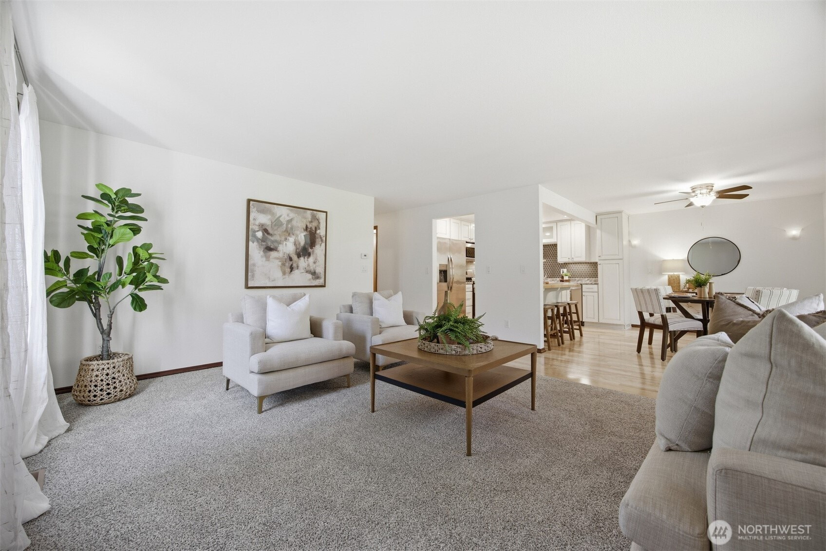 Nestled in the heart of Lynden, this ground level end unit offers the kind of walkability & privacy that's hard to find. Steps from the bus route, shopping, & restaurants, the location delivers real convenience while still feeling tucked away. Extra natural light & a park-like backdrop make this one stand out from the moment you arrive.Inside, the open layout connects a remodeled kitchen with new appliances to the living & dining area, all flowing out to a private patio that overlooks a serene setting with a creek below. Brand new carpet & fresh paint throughout means it's truly move-in ready. The primary suite is tucked away with a large walk-in closet & en suite bath, offering a quiet retreat at the end of the day. The second bedroom is flexible, working equally well as a den, office, or guest room. Washer & dryer are in-unit in their own utility room, & pets are welcome.A detached single car garage plus an assigned parking space give you more storage & convenience than you'd expect. The community clubhouse rounds it out. Whether you're a first-time buyer, downsizing, or simply looking for low-maintenance living in a great location, this one is worth a look.