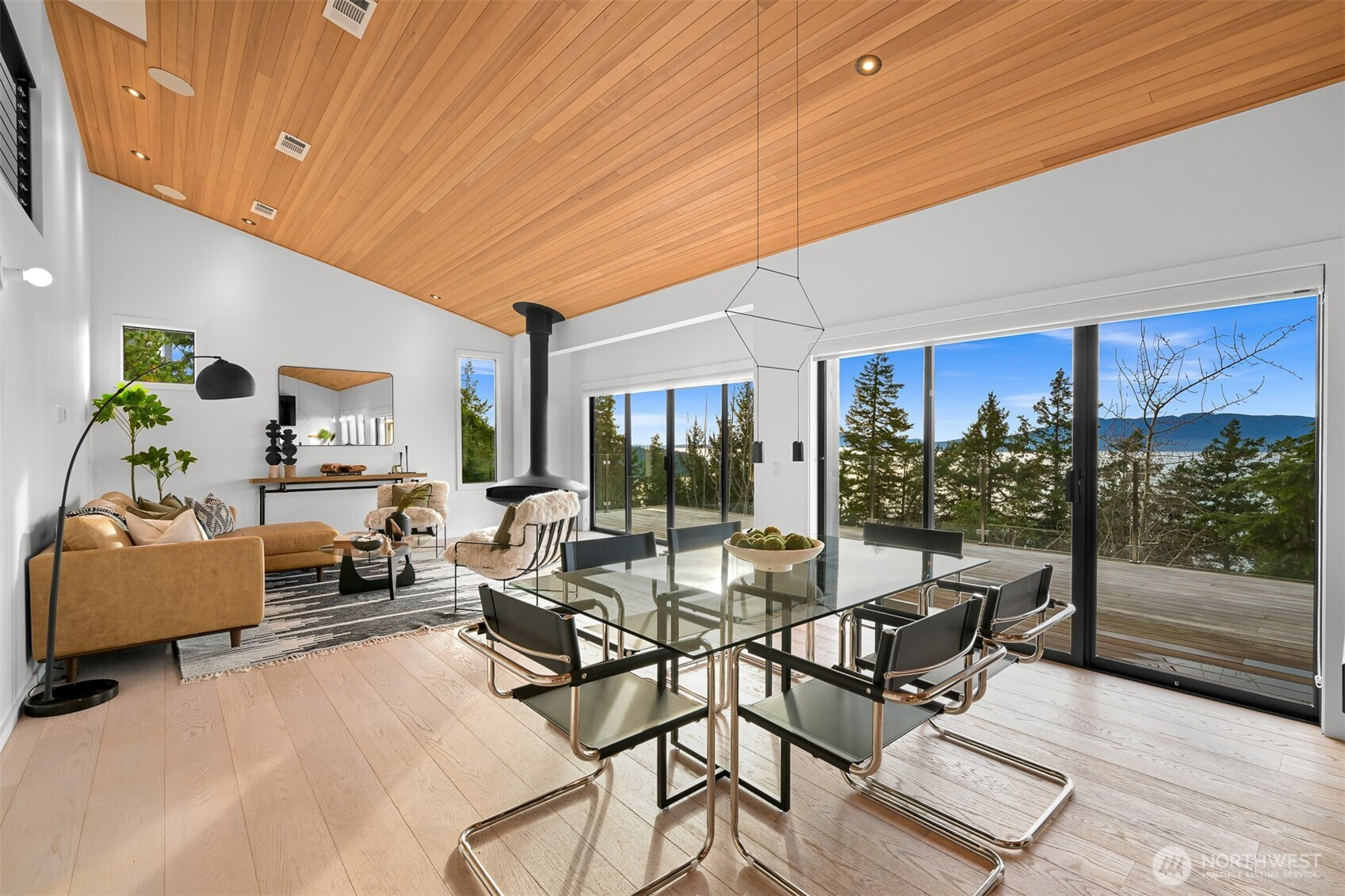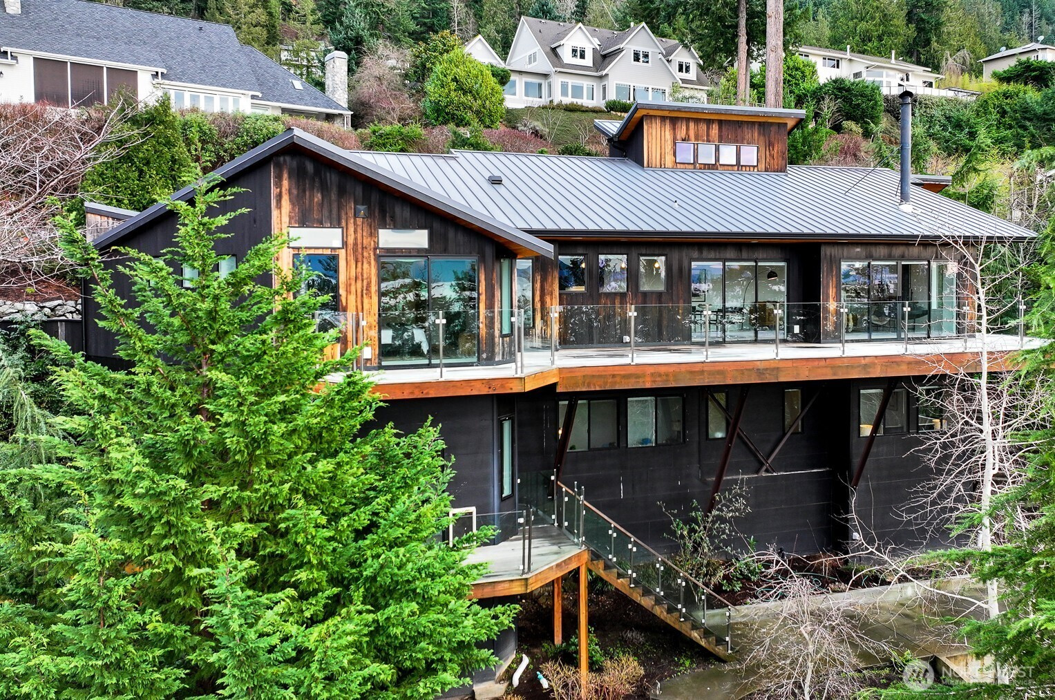 (503) 893-8874Perched above iconic Chuckanut Drive in one of Bellingham’s most coveted gated community,, this one-of-a-kind modern home captures sweeping water views of the San Juan Islands and an unmistakable sense of calm. Soaring hemlock wood ceilings and refined architectural details create a striking yet welcoming living space filled with natural light and anchored by a dramatic suspended fireplace from France and expansive hardwood decks enclosed with sleek glass railings. Thoughtfully designed for both luxury, comfort & versatility, the home features in-floor radiant heating, built-in patio heaters for year-round enjoyment, and seamless indoor-outdoor flow. Two expansive primary suites offer spa-like en-suite bathrooms and walk-in closets, while a loft overlooks the main living area, enhancing the home’s open, airy feel. The lower level includes a bonus room with a separate entrance, offering both a bedroom and office, ideal for guests or flexible living. A fully fenced, terraced grounds invites entertaining and play, complete with a fire pit and play area & space with plumbing for a future hot tub. Located within a gated community with tennis courts just steps away, the home also includes a garage with electric car charging, laundry rooms on both levels, and the rare advantage of single ownership. An exceptional home blending modern design, premium materials, privacy, and iconic Pacific Northwest beauty just minutes from downtown Bellingham.