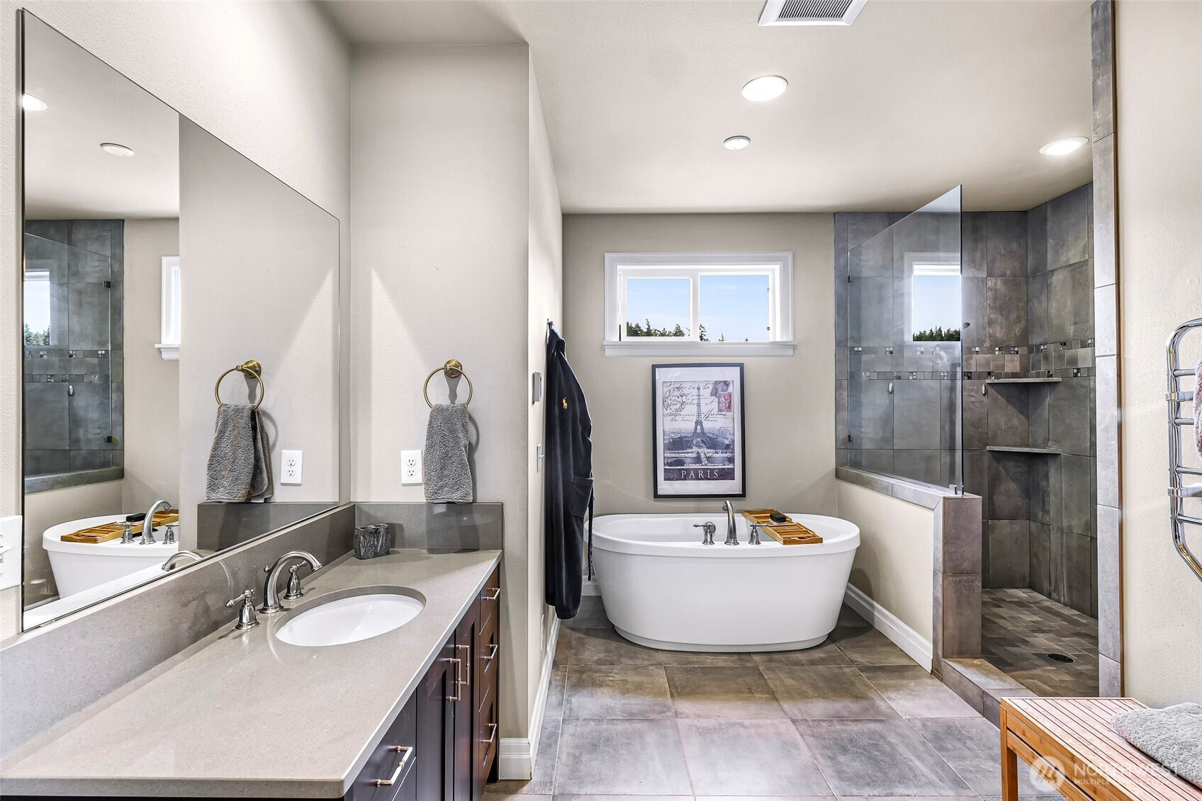 Introducing the Woodlands & Edgemoors newest custom-built home W/a masterful floor plan.The main floor welcomes you W/stunning high ceilings, living room,formal dining,chefs kitchen W/SS appliances,quartz counters & large island perfect for entertaining.The main level primary wing features a spa-like ensuite, fireplace & deck access.Main level office, laundry room & spacious 3 car garage.Upstairs showcases two additional large bedrooms both with ensuites, & a spacious loft/flex room overlooking the main living areas.Downstairs to the 1300+sq ft 1bedroom ADU W/full kitchen/bathroom & own garage & entry.The north-facing house length deck W/hot tub has incredible territorial views. Over a half-acre lot close to Fairhaven, beach's & trails