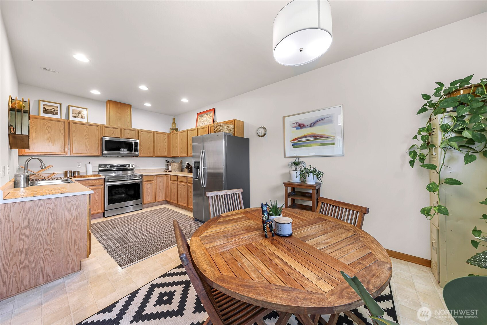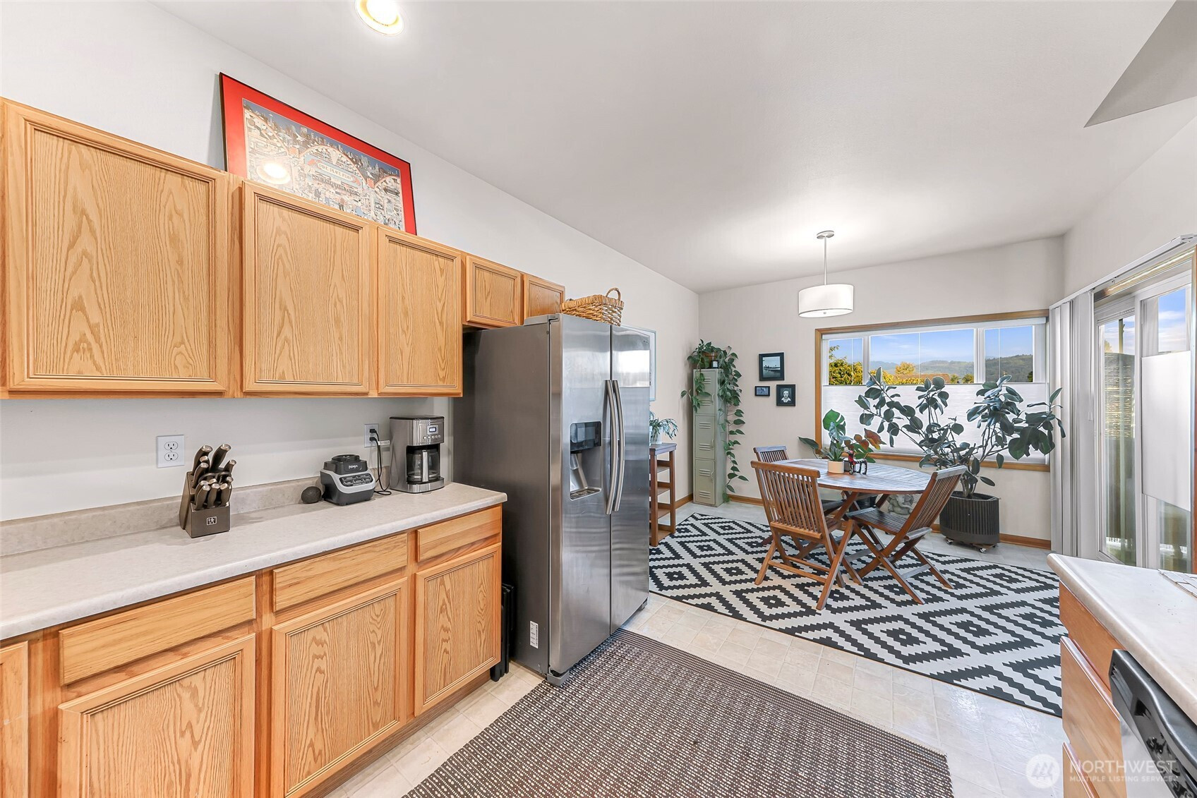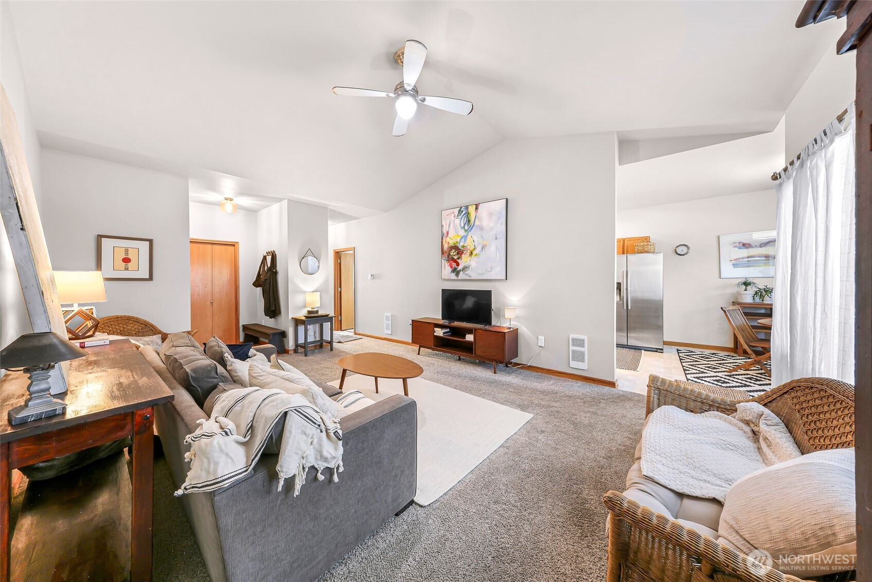 Updated Second Floor Condo in Sumas! New paint, carpet, light fixtures, window coverings, stove. Newer full size washer and dryer and refrigerator. Bright and airy space with vaulted ceilings. The open-concept layout has primary ensuite and 2 dedicated parking spaces. Covered patio has Mount Baker views. Located in a quiet community with low HOA dues that cover water, sewer, garbage, recycling, lawn care, and snow removal. Move in ready—ideal for downsizers, first-time buyers, or investors. Complex is eligible for VA/ FHA and USDA financing.