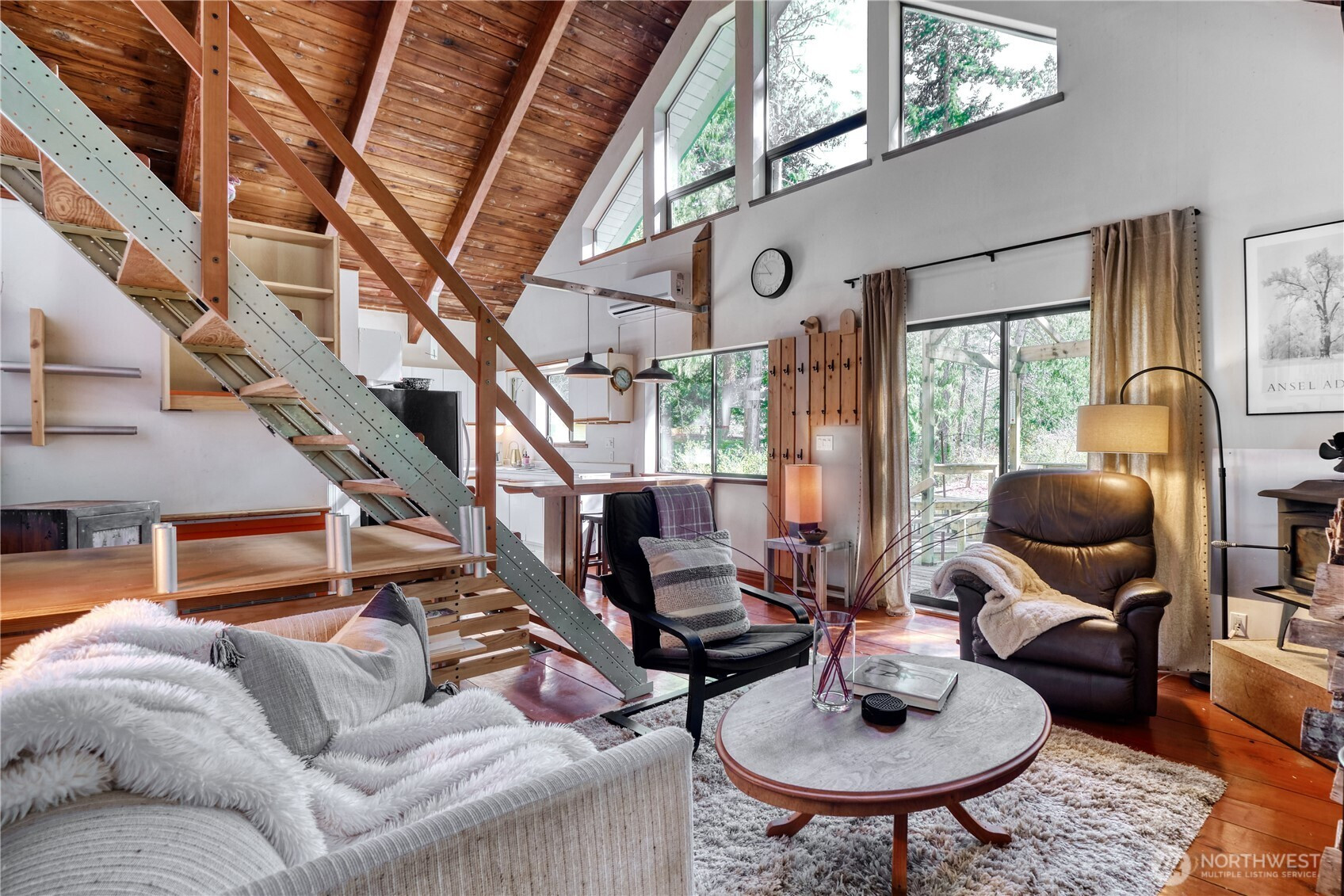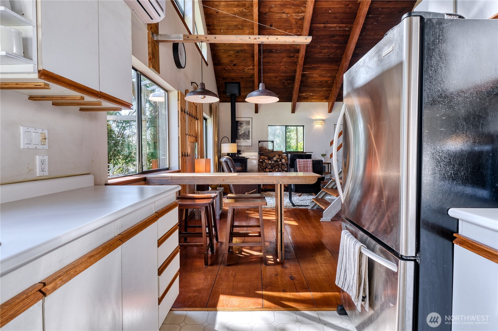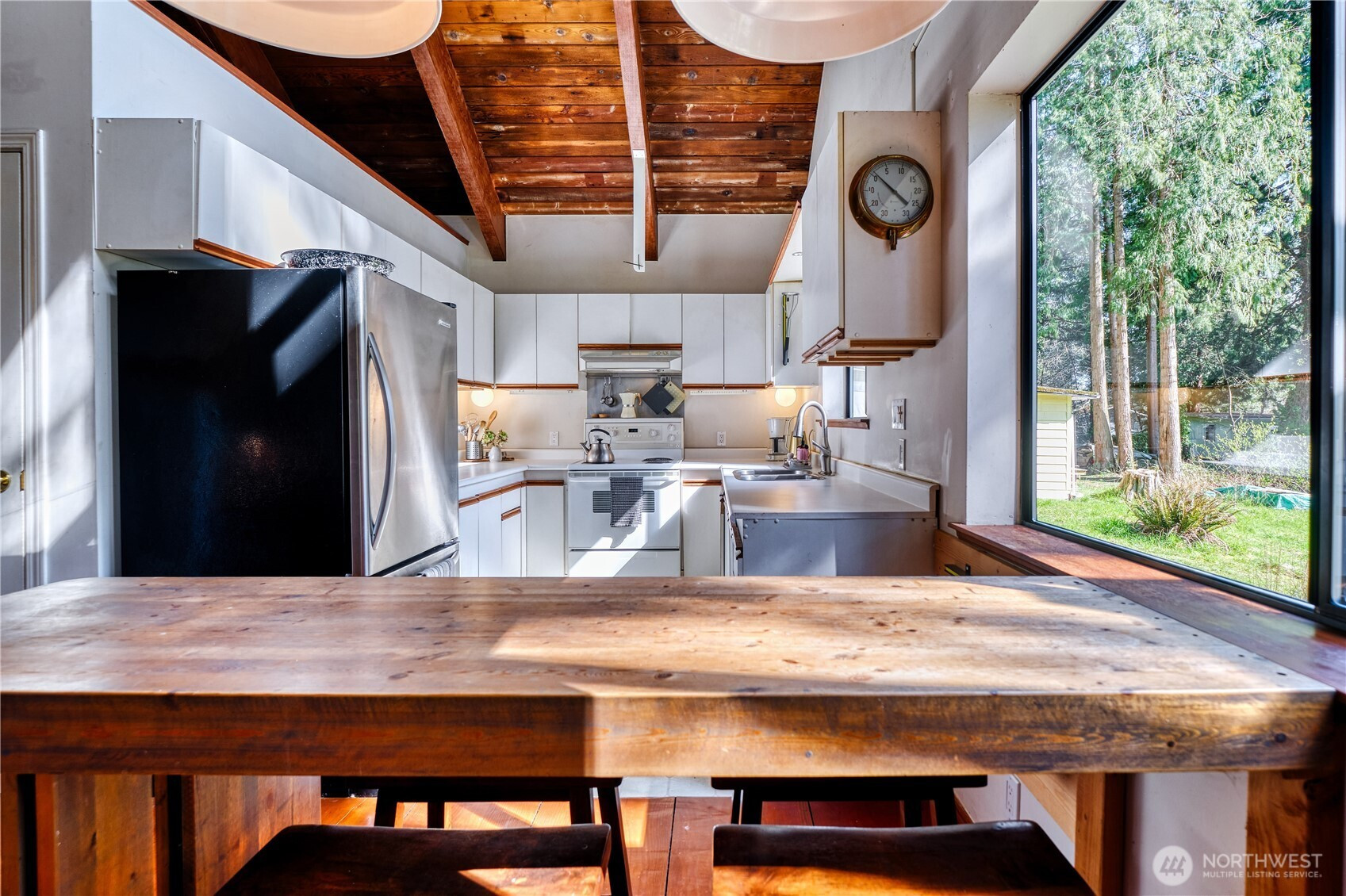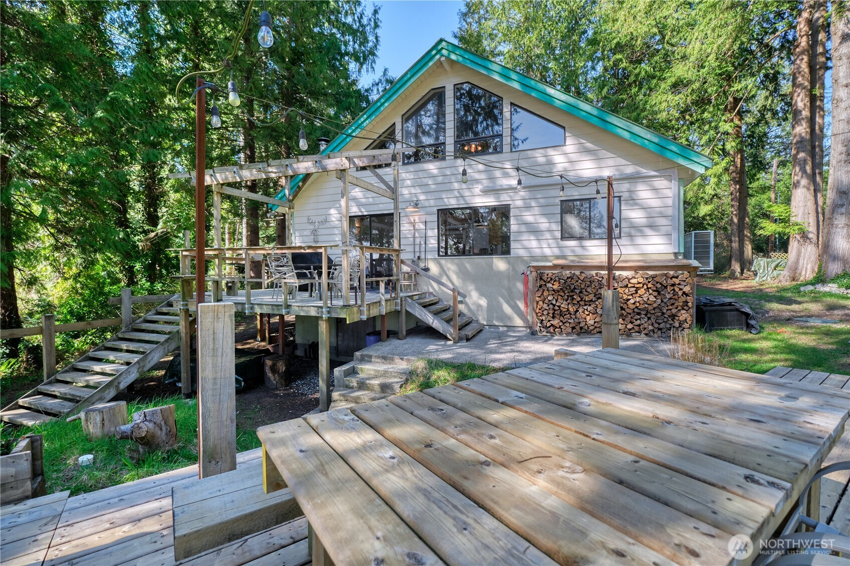 Built for full-time living in the heart of Point Roberts, this 2 bed + loft A frame offers beautiful southern exposure and a peaceful setting surrounded by evergreens. With 1,216 sq ft of thoughtfully designed living space, the home showcases classic Northwest character with soaring vaulted ceilings, exposed beams, and warm tongue-and-groove wood ceilings. Striking solid wood plank floors-milled from trees on the property during the original construction-bring natural warm history, and craftsmanship to the main living area. The open living space is bright and welcoming, with large windows that invite natural light and frame views of the surrounding trees. The loft overlooks the main living area and offers flexible space for guests, work , or cozy retreat while enjoying treetop views and open sky. Expansive decks extend the living area outdoors, crating ideal spaces for morning coffee, summer entertaining, or relaxing evenings in the quiet coastal air. Quality constructions includes a solid concrete foundation, durable cedar siding, double-pane windows, a wood stove for cozy winter nights, and a heat pump for efficient year-round comfort. Tucked into the unique seaside community of Point Roberts, the home offers a rare balance of tranquility and accessibility- approximately 45 minutes to Vancouver, BC and about two hours to Seattle.
