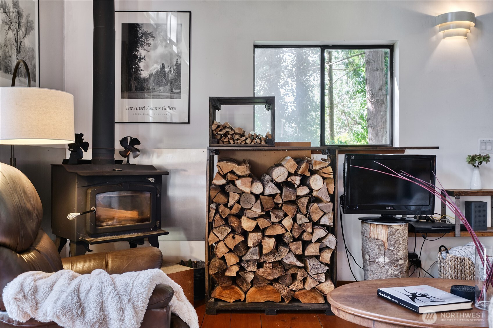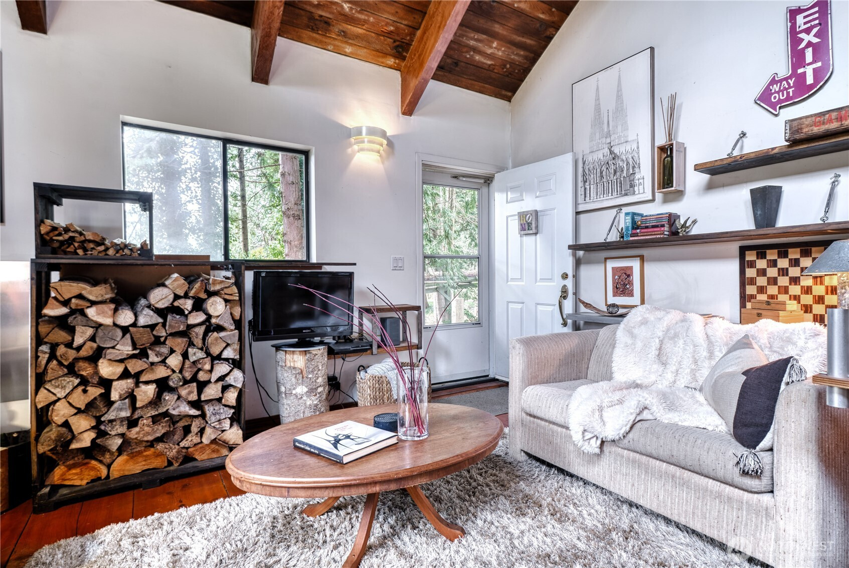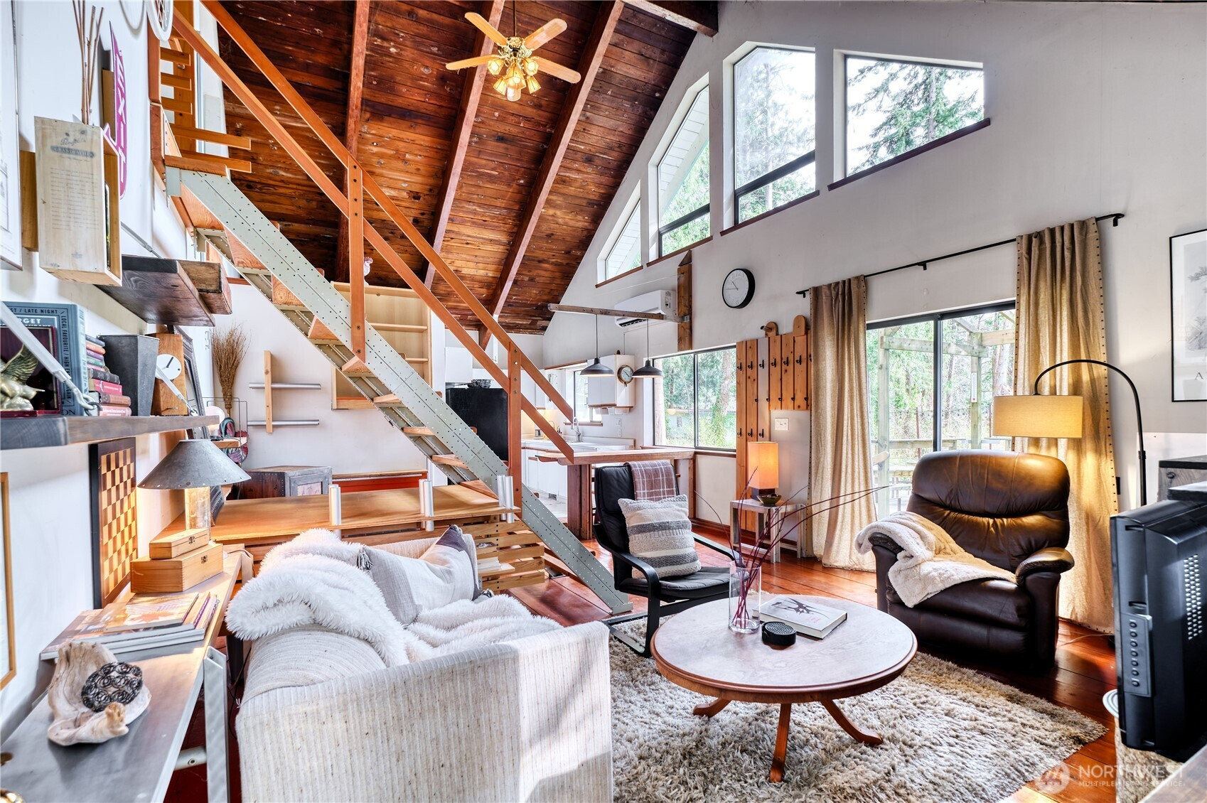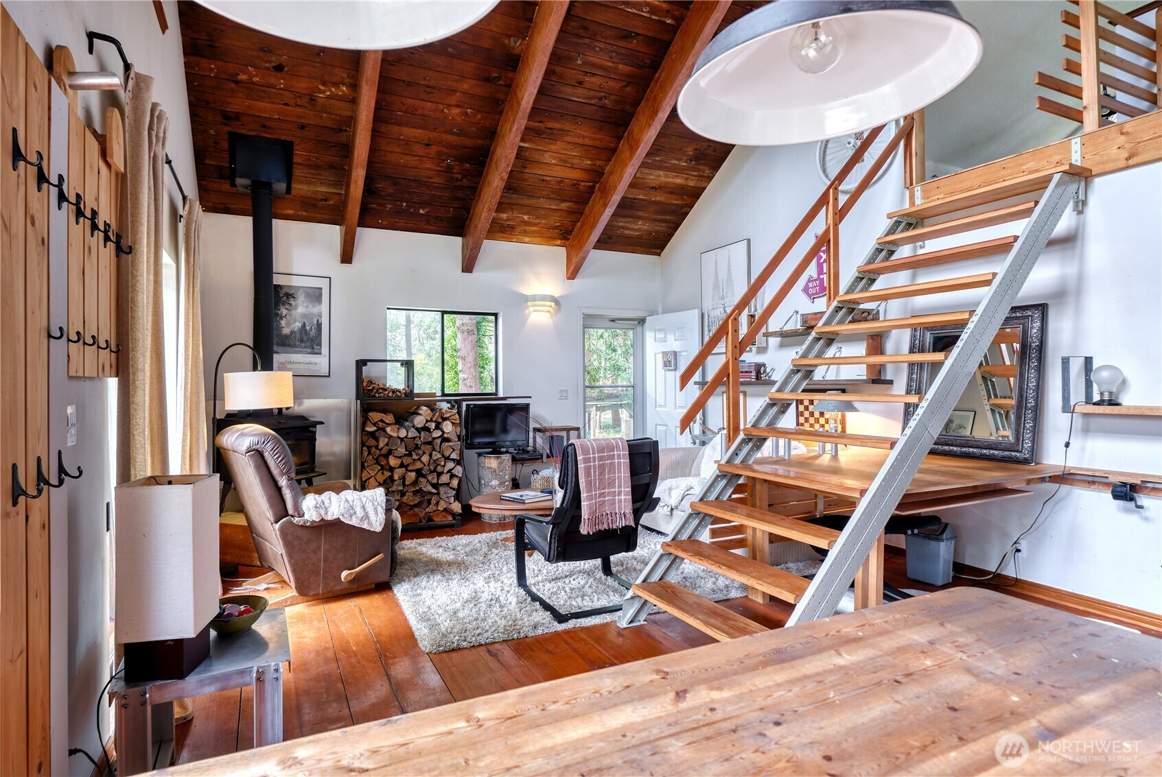 Built for full-time living in the heart of Point Roberts, this 2 bed + loft A frame offers beautiful southern exposure and a peaceful setting surrounded by evergreens. With 1,216 sq ft of thoughtfully designed living space, the home showcases classic Northwest character with soaring vaulted ceilings, exposed beams, and warm tongue-and-groove wood ceilings. Striking solid wood plank floors-milled from trees on the property during the original construction-bring natural warm history, and craftsmanship to the main living area. The open living space is bright and welcoming, with large windows that invite natural light and frame views of the surrounding trees. The loft overlooks the main living area and offers flexible space for guests, work , or cozy retreat while enjoying treetop views and open sky. Expansive decks extend the living area outdoors, crating ideal spaces for morning coffee, summer entertaining, or relaxing evenings in the quiet coastal air. Quality constructions includes a solid concrete foundation, durable cedar siding, double-pane windows, a wood stove for cozy winter nights, and a heat pump for efficient year-round comfort. Tucked into the unique seaside community of Point Roberts, the home offers a rare balance of tranquility and accessibility- approximately 45 minutes to Vancouver, BC and about two hours to Seattle.