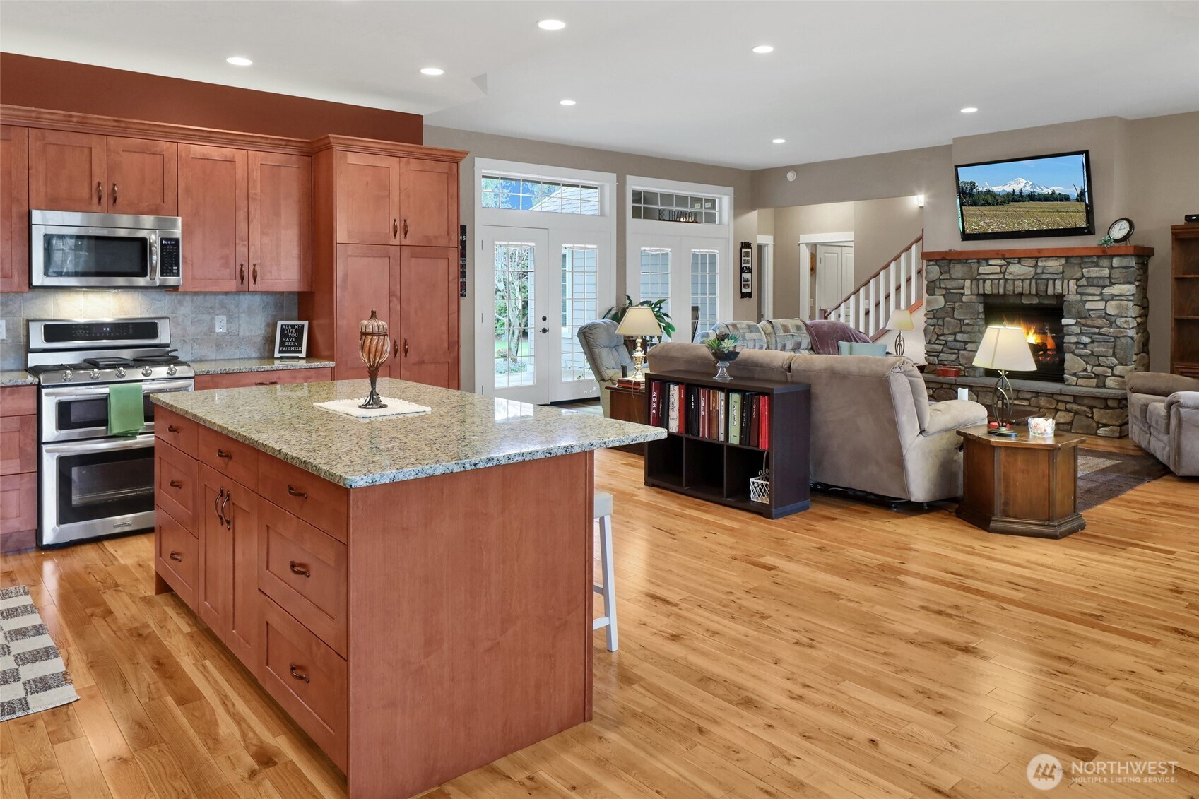 Tucked at the end of a cul-de-sac, this well-maintained home offers privacy, quality, and true main-level living. Backing to a greenbelt, the setting is quiet with a natural buffer behind the home. Zero-entry access from both the front door and garage provides practical functionality. This 2,335 SF, 3 bed, 1.75 bath home features an open, efficient layout with hardwood floors, tall ceilings, and custom cabinetry throughout. The kitchen, dining, and living areas connect seamlessly, creating a bright and functional space for everyday use and entertaining. The primary suite and all main living areas are on the main floor, with a bonus room above the garage for added flexibility. An oversized garage offers additional space for storage or workspace. Don't miss this one of a kind home!