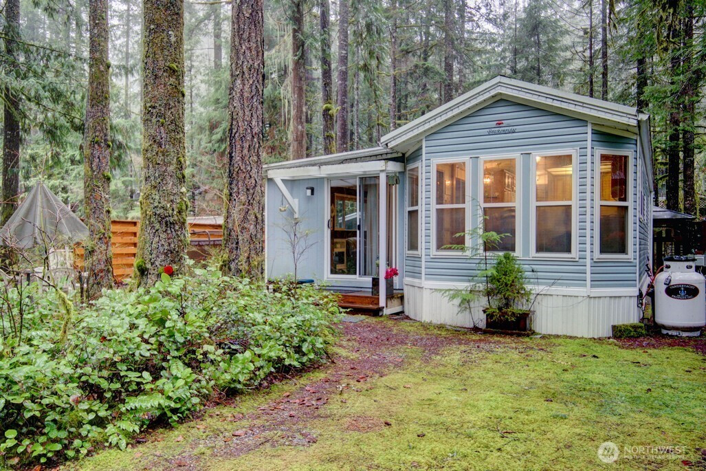 Rare one-acre lot in Div 7 at The Glen! This park model features a spacious sunroom and large addition. Fully furnished and ready to enjoy, it includes full-size appliances and is currently set up to sleep ten. The property also boasts a main shed with its own patio and dining area, a second storage shed, a wood shed, and a large fire pit tucked at the back for private gatherings. Winding paths through the trees add to the peaceful, secluded feel. A unique opportunity to own one of the largest lots in The Glen with all the comforts of home! Just 15 minutes from the base of Mt Baker, amenities include pools, hot tub, sauna, tennis & basketball, 24/7 security & more! Occupancy limited to 120/days per year. No rentals.