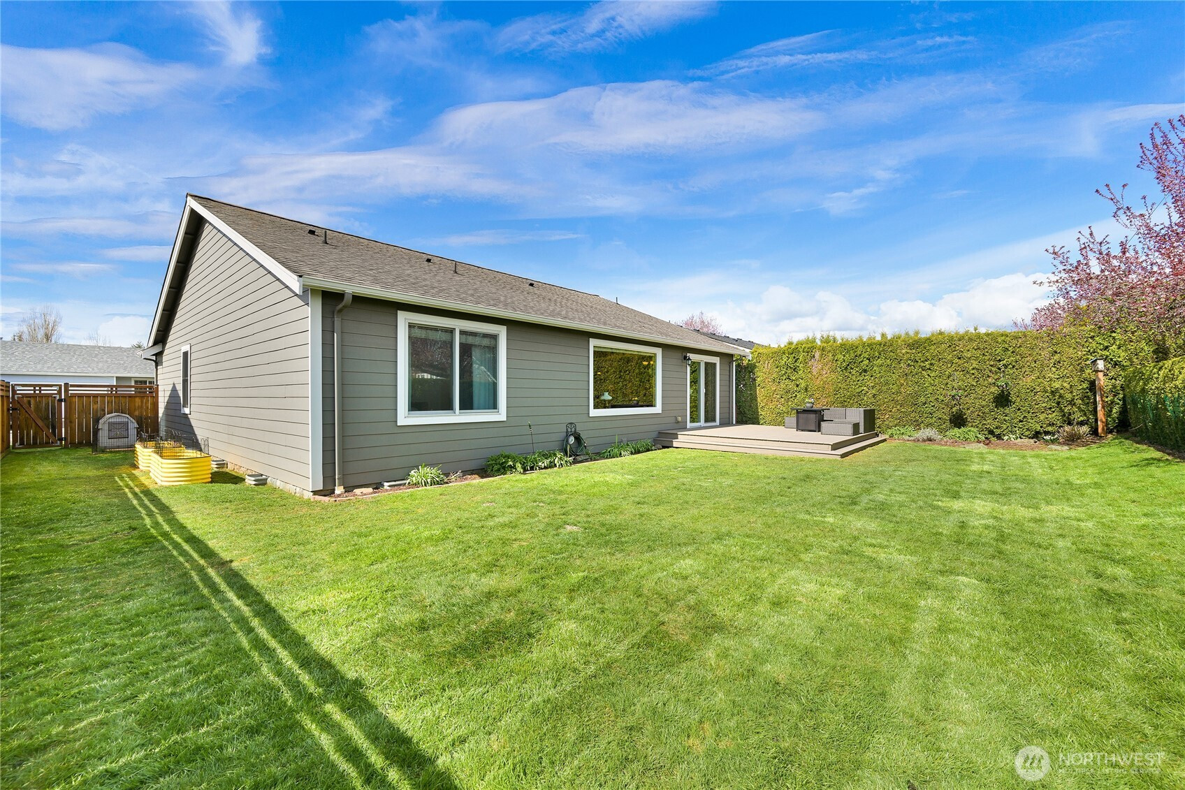 Ideal Lynden location for this very well kept single level home featuring an open layout, flooded with light, and beautiful fenced backyard with large deck. Vaulted ceilings and large windows make the main living space bright and open, flowing easily between the living room, dining area, and kitchen with eating bar. Nice primary with ensuite bath, and a walk-in closet, while two additional bedrooms offer flexibility for guests, office, or lifestyle needs. Outdoors, the spacious backyard provides room to relax, garden, or play, with a deck perfectly positioned to enjoy the sun and views of Mount Baker. Conveniently located near Bender Fields and nearby trails, this home also offers easy access to outdoor space and recreation. With a two-car garage and a layout designed for simplicity and comfort, this home is both practical and inviting. As an added plus a new roof is being installed this week!