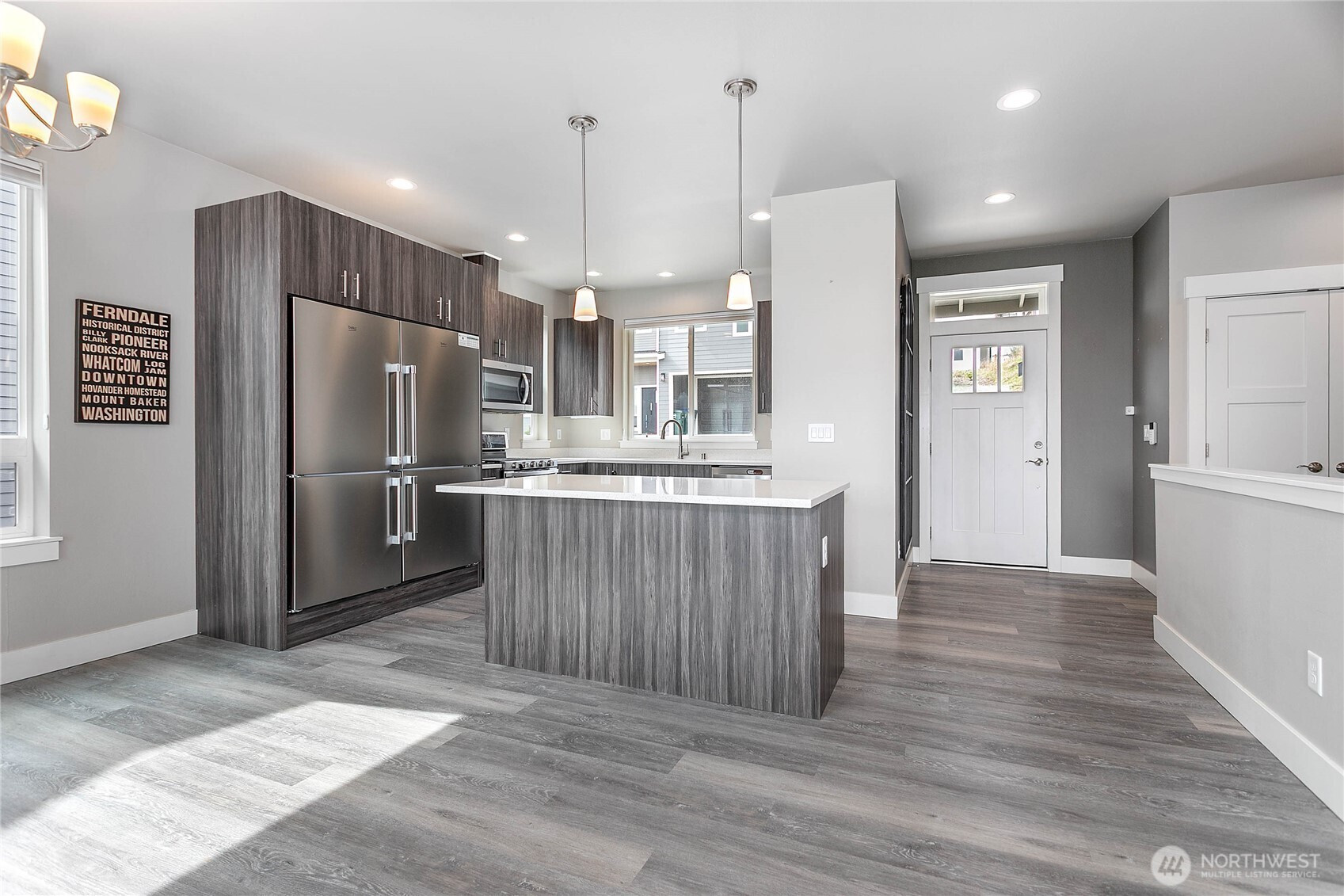 (503) 893-8874Discover modern luxury in Bakerscape, an intimate and upscale neighborhood just minutes from downtown Ferndale. This stunning 4-bedroom home features a sophisticated open-concept floor plan with extra-high ceilings and expansive windows that frame breathtaking, unobstructed views of Mt. Baker and the Twin Sisters. The chef-inspired kitchen serves as the heart of the home, boasting quartz countertops, premium stainless steel appliances with a double fridge/freezer, and a large island that flows seamlessly into the living area and a generous upper deck—complete with plumbing for a natural gas BBQ for effortless outdoor entertaining against a majestic mountain backdrop. Convenience meets elegance on the main floor, which hosts a primary suite with mountain views and a spa-like walk-in shower, plus an additional bedroom and full bath. The lower level offers incredible versatility with a large family room, workout area, two guest bedrooms, and massive dry storage. The property uniquely backs up to the school district fields, providing a sense of openness and direct trail access from the yard to the path around the field. Step outside to a flat, sunny backyard featuring a covered patio, a relaxing hot tub, and a dedicated gravel parking pad for an RV or boat, plus a spacious 2-car attached garage with a convenient mudroom entry. From the contemporary design to the prime location, every detail of this home is crafted for comfort and luxury.