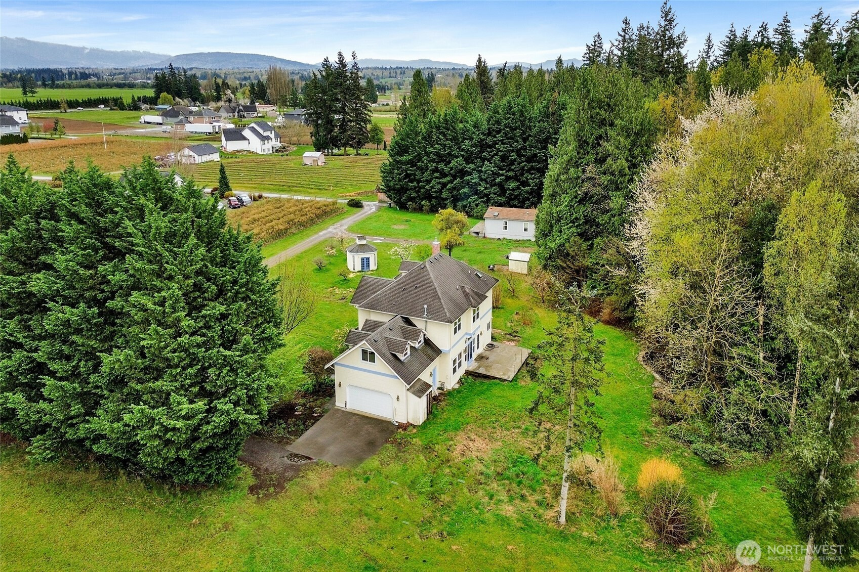 5 Acres down a private Paved drive, with 2 homes and a shop. Main home is 4 bedrooms, 2.5 bathrooms plus an office & Library with separate entry & a large covered front porch, Light and bright kitchen with walk in pantry and granite counter tops, stainless steel appliances & breakfast nook with doors to your back yard and formal dining with a wall of windows. Large living room with gas fireplace and bookcase built ins, upper floor has 4 large rooms , Main suite has a huge bathroom with jetted tub and walk in shower. Huge Bonus room over garage and laundry rooms with a plumbed shower basin. Pond in the back with electric for a fountains behind the house and trees into the back of your 5 acre property, so Peaceful. ADU is permitted with 3 bedrooms, 2 full bathrooms, large living room and open kitchen with lots of light. separate, septic & power. Large Shop behind the ADU.. lots of fruit trees and garden space