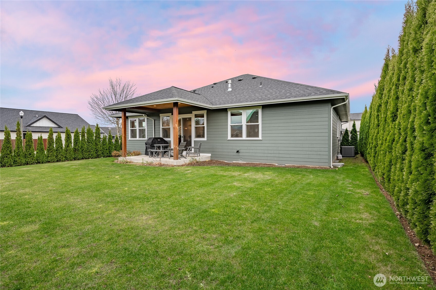 Welcome home! Located in pristine Lynden, this lovely single level home is quality construction from top to bottom. The elegant kitchen has abundant soft closed cabinetry, quartz counter tops, large island, black SS appliances, beverage cooler, tiled backsplash & walk-in butler's pantry. The floorplan is open between the kitchen, living & dining room, warmed by a gas fireplace. Many windows bring in lots of natural light & outdoor beauty. The primary has a huge walk-in closet, spacious bathroom w/a tub & walk-in tiled shower. Other items include AC, washer & dryer, under eve lighting, 10’ ceilings w/ 8’ doors throughout, tankless water heater, outdoor sprinklers & large, covered patio. Close to schools. This home is an entertainers' dream!