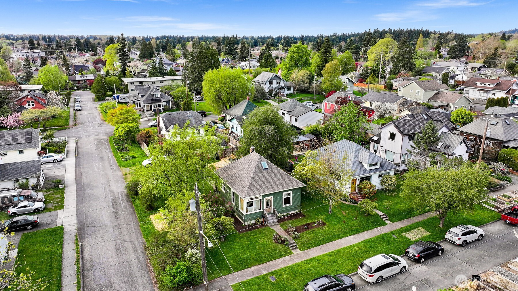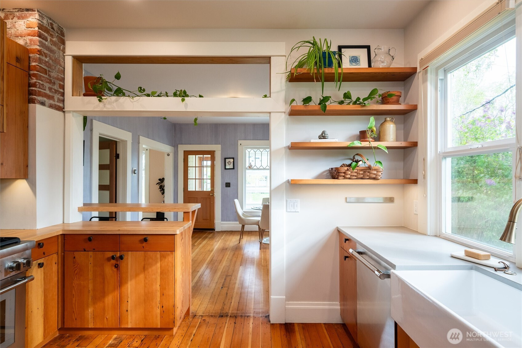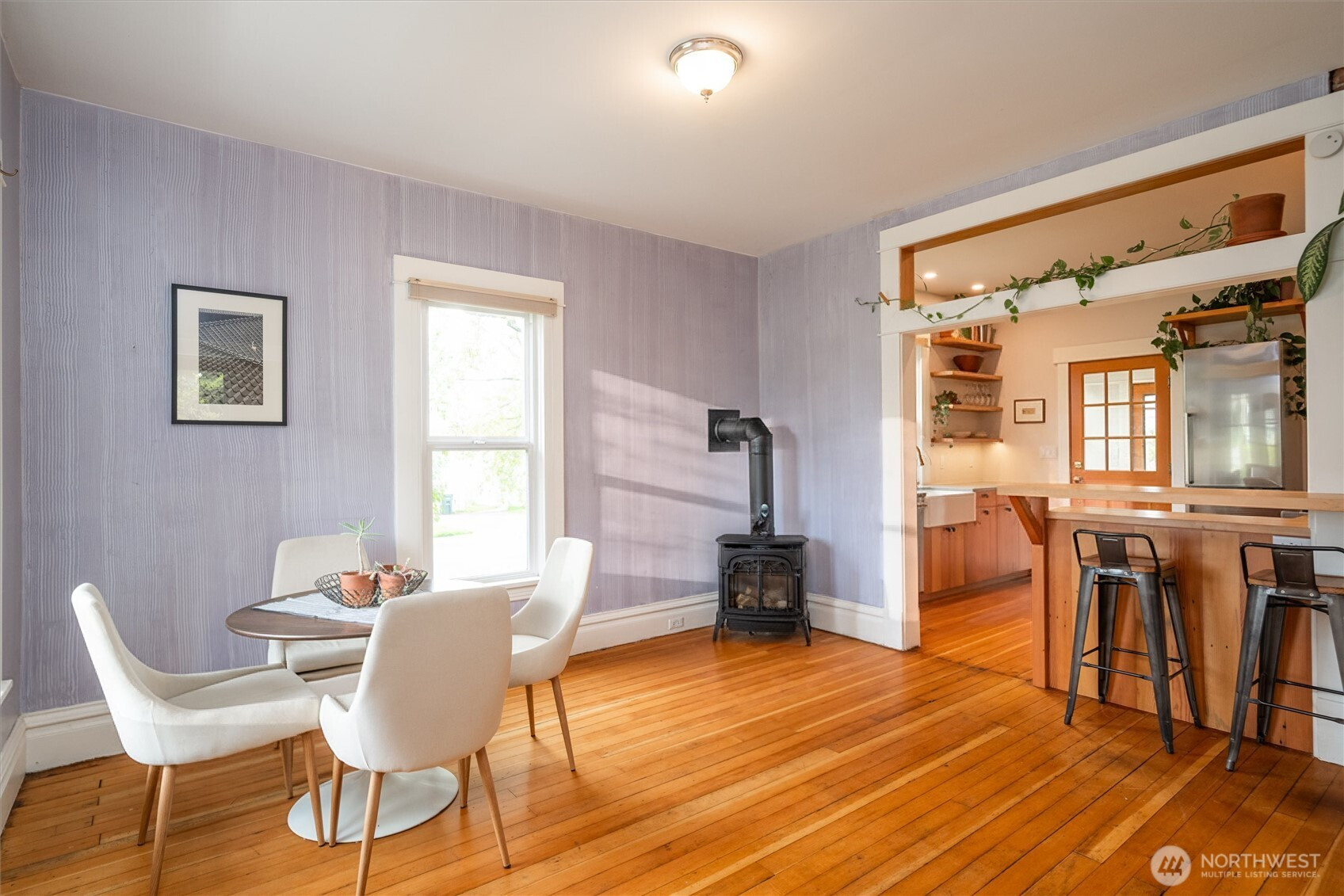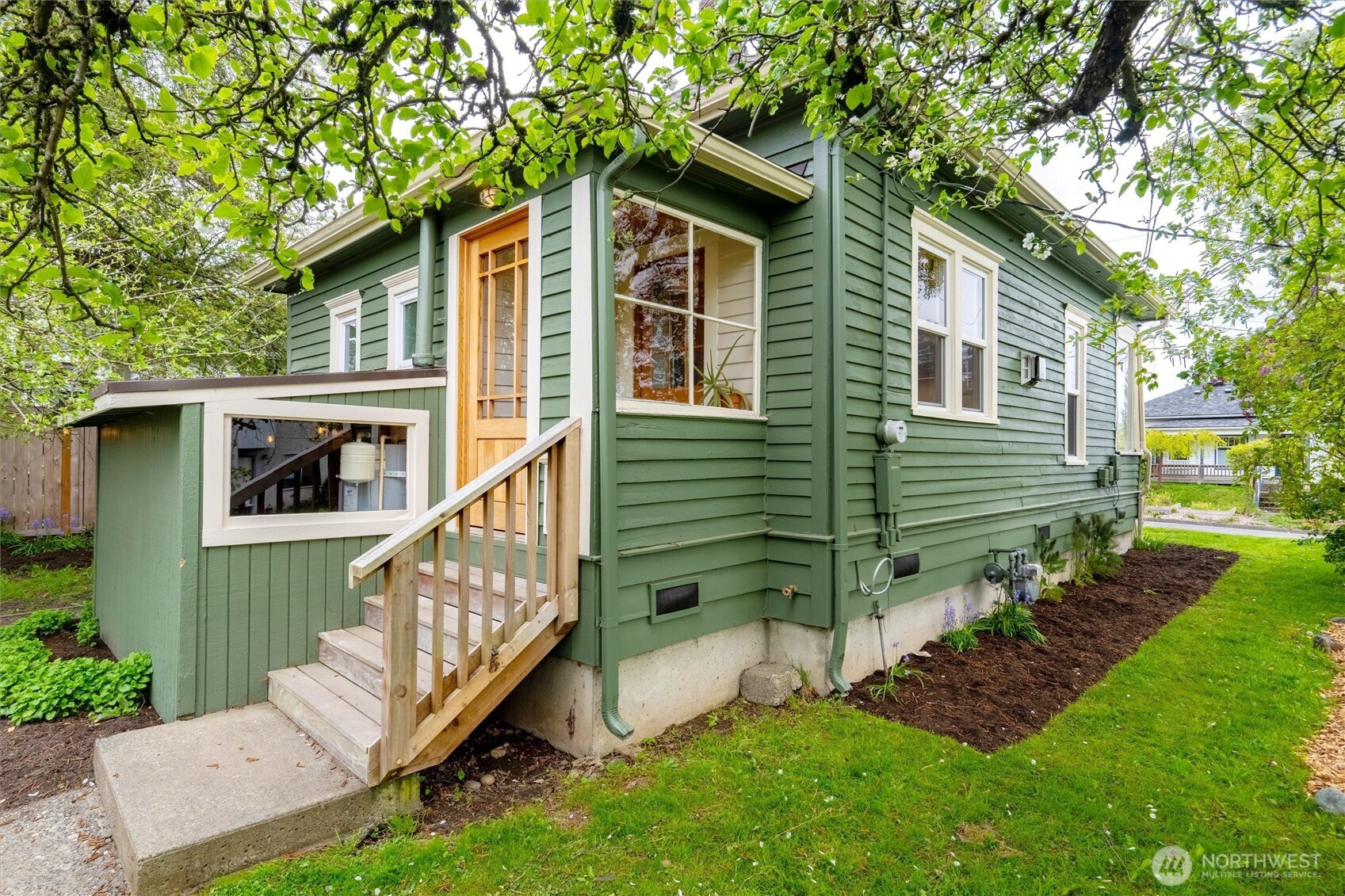Tucked into the heart of Bellingham’s beloved Lettered Streets neighborhood, this 1906 bungalow instantly feels special from the moment you enter the front door. Thoughtfully updated, it strikes that perfect balance between historic charm and elevated, design-forward living. Showstopper kitchen anchored by gorgeous custom cabinetry crafted from reclaimed wood from a barn in Whatcom County. Paired with high-end Thermador appliances, it's as artful of a space as it is functional. The remodeled bathroom preserved some vintage fixtures while updating tile and adding heated floors. Refinished fir floors and a freestanding gas stove (which efficiently heats the home) make this home feel grounded, cozy and comfortable. Upstairs, a converted attic creates a sweet and private guest bedroom or creative retreat, while the rest of the home lives comfortably with an easy, intuitive flow. Corner lot with wonderful outdoor space featuring an apple tree, raised garden beds, fire pit area, and plenty of room to soak up all-day sun. A true gardener's paradise! A storage shed keeps tools and gear neatly tucked away, and for those thinking ahead, previously drawn plans for a future garage/ADU can be shared. A home that lives beautifully from day one—one you’ll want to experience in person!
