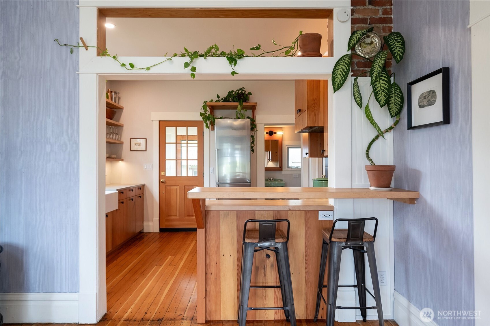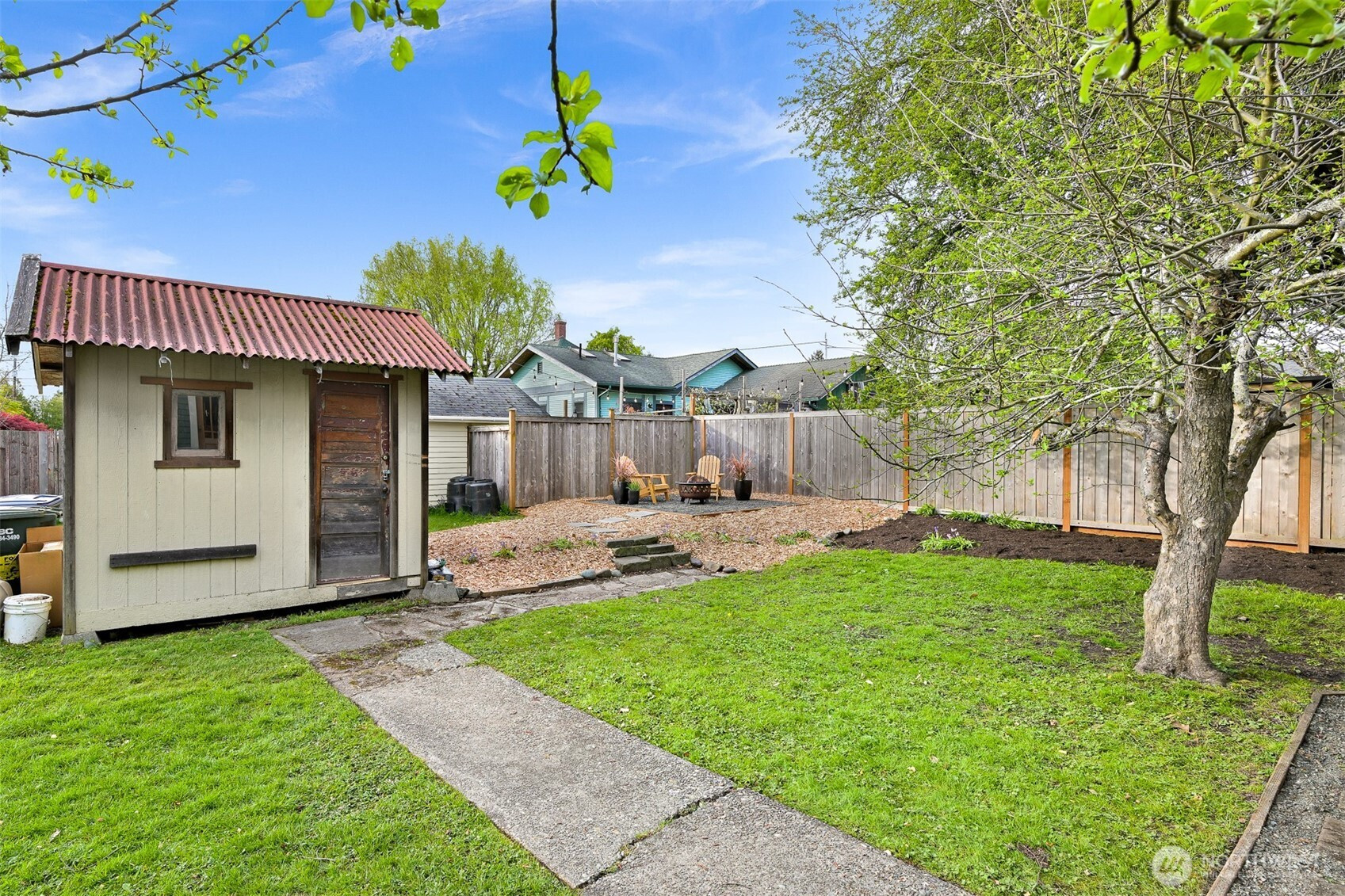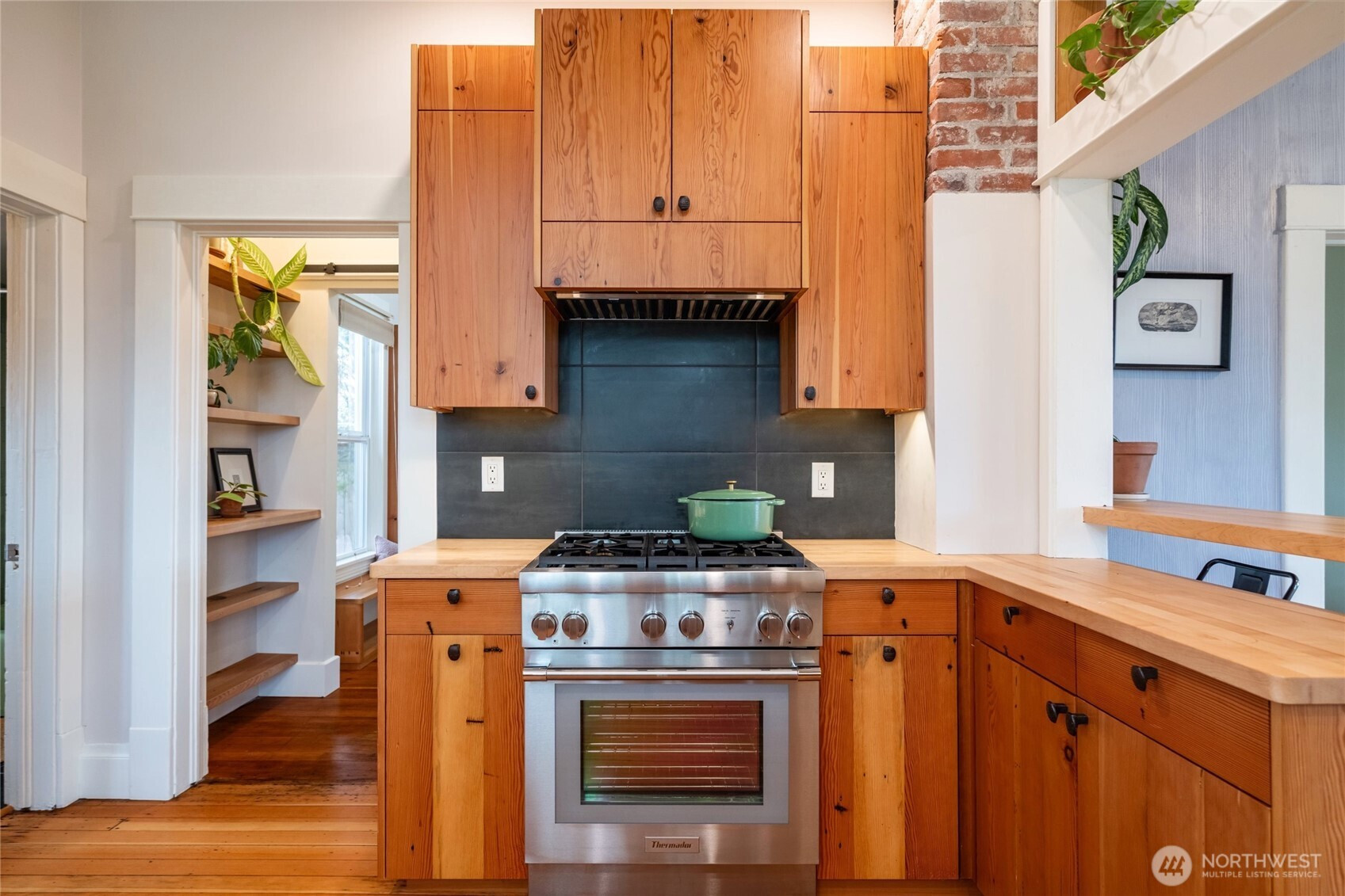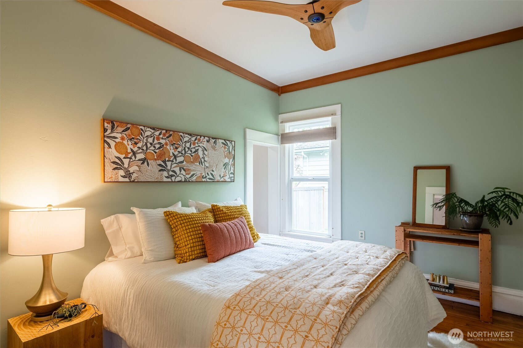 Tucked into the heart of Bellingham’s beloved Lettered Streets neighborhood, this 1906 bungalow instantly feels special from the moment you enter the front door. Thoughtfully updated, it strikes that perfect balance between historic charm and elevated, design-forward living. Showstopper kitchen anchored by gorgeous custom cabinetry crafted from reclaimed wood from a barn in Whatcom County. Paired with high-end Thermador appliances, it's as artful of a space as it is functional. The remodeled bathroom preserved some vintage fixtures while updating tile and adding heated floors. Refinished fir floors and a freestanding gas stove (which efficiently heats the home) make this home feel grounded, cozy and comfortable. Upstairs, a converted attic creates a sweet and private guest bedroom or creative retreat, while the rest of the home lives comfortably with an easy, intuitive flow. Corner lot with wonderful outdoor space featuring an apple tree, raised garden beds, fire pit area, and plenty of room to soak up all-day sun. A true gardener's paradise! A storage shed keeps tools and gear neatly tucked away, and for those thinking ahead, previously drawn plans for a future garage/ADU can be shared. A home that lives beautifully from day one—one you’ll want to experience in person!