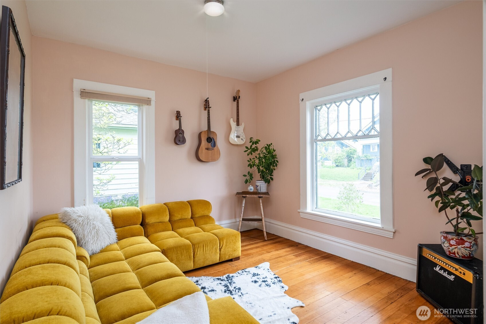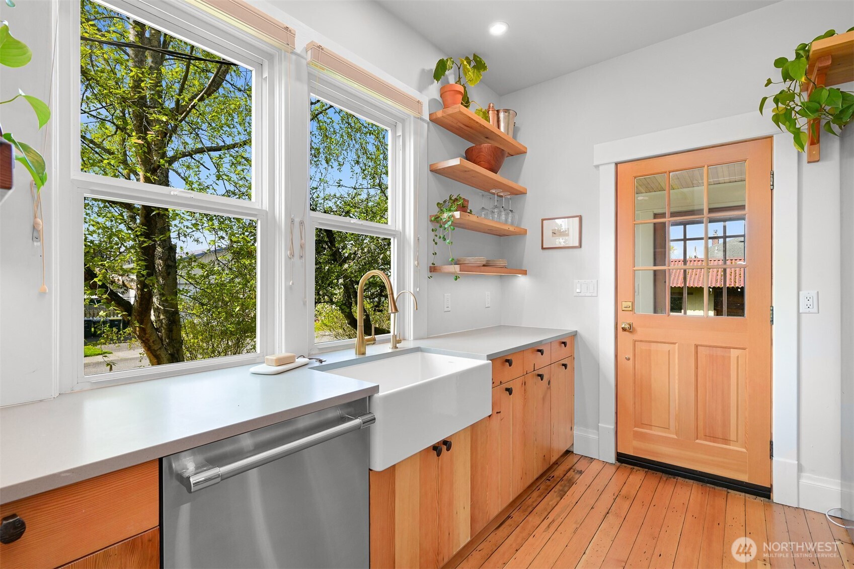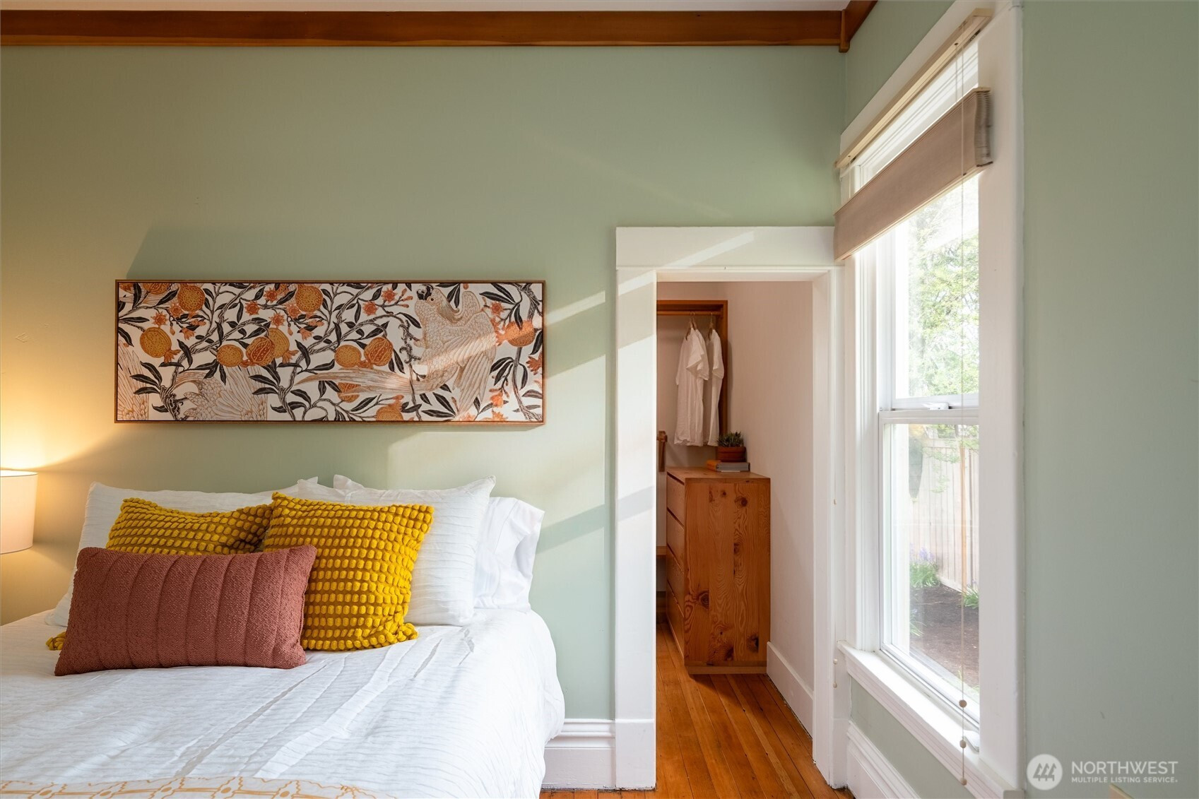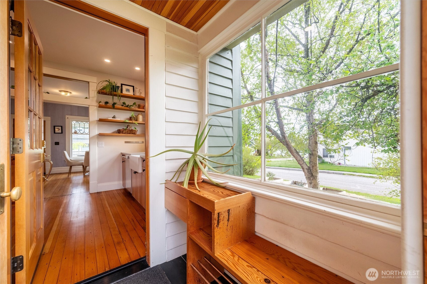 Tucked into the heart of Bellingham’s beloved Lettered Streets neighborhood, this 1906 bungalow instantly feels special from the moment you enter the front door. Thoughtfully updated, it strikes that perfect balance between historic charm and elevated, design-forward living. Showstopper kitchen anchored by gorgeous custom cabinetry crafted from reclaimed wood from a barn in Whatcom County. Paired with high-end Thermador appliances, it's as artful of a space as it is functional. The remodeled bathroom preserved some vintage fixtures while updating tile and adding heated floors. Refinished fir floors and a freestanding gas stove (which efficiently heats the home) make this home feel grounded, cozy and comfortable. Upstairs, a converted attic creates a sweet and private guest bedroom or creative retreat, while the rest of the home lives comfortably with an easy, intuitive flow. Corner lot with wonderful outdoor space featuring an apple tree, raised garden beds, fire pit area, and plenty of room to soak up all-day sun. A true gardener's paradise! A storage shed keeps tools and gear neatly tucked away, and for those thinking ahead, previously drawn plans for a future garage/ADU can be shared. A home that lives beautifully from day one—one you’ll want to experience in person!