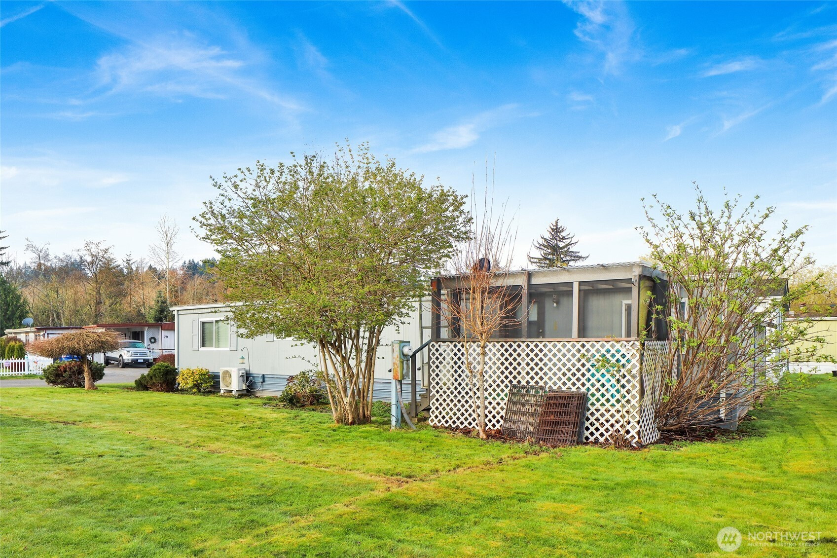 Located in Happy Valley on the South Side of Bellingham in the beloved Fairhaven neighborhood with territorial Lookout and Chuckanut Mountain views. This home has had some nice updates including the tall sturdy carport for a convenient covered parking area for keeping dry while you come and go. The heat pump provides energy efficient heating and cooling in the main living area. This is in addition to the forced air furnace which is ducted to each room. There is easy care flooring and brand new carpet in the bedrooms. The covered back deck has nice territorial views and the yard was set up with fencing for a pet and could be again. The fencing is stacked and waiting next to the deck. This is the nicest stretch of the park near Padden Creek and the Gate 3 entrance from 24th Street. The clubhouse available for your use and mailboxes are just around the corner. This is moments from the Peacehealth Fairhaven Primary Care Clinic, the Fairhaven Veterinary Hospital, book stores, coffee shops, restaurants, gas stations & I-5 access at Old Fairhaven Parkway. The Padden Creek Trail connects to nearby Fairhaven Park and goes all the way to the 4th St access to the Fairhaven Dog Park and Maritime Park. The Fairhaven Transportation terminal hosts bus, train & Alaska ferry services & numerous community events. You can't put a value on nice neighbors. Here they are priceless, including one who will be happy to mow the lawn for you. Park Manager Patty is helpful and keeps people informed.