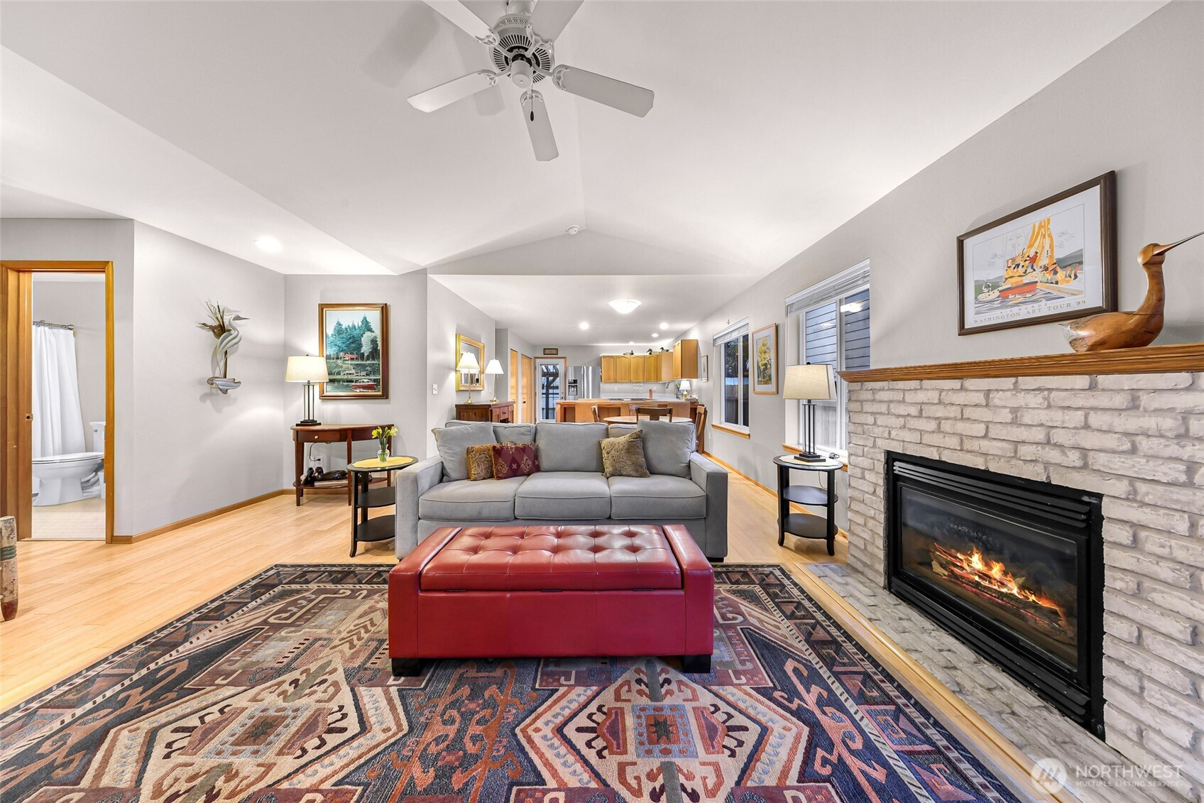 Tucked into a highly sought-after neighborhood near Barkley Village, this well cared for rambler offers effortless single-level living with unbeatable access to the city’s award-winning trail system. Step inside to an open, light-filled living space where vaulted ceilings create an airy feel and a gas fireplace anchors the room, making it the perfect place to gather or unwind. Durable bamboo flooring runs throughout the main living areas, adding warmth while offering a sustainable and easy-care finish. The spacious kitchen is designed for both function and entertaining, featuring large wrap-around counters that provide abundant prep space and storage. A newly extended bar top creates additional seating, while the Jenn Air stove with gas range and newer refrigerator make cooking a pleasure. Fresh interior and exterior paint give the home a crisp, updated feel. Two bedrooms feature skylights that flood the rooms with natural light, complete with blackout shades and new carpet for restful evenings. The primary bedroom includes a private ¾ en-suite bath, while a full bathroom serves guests and the second bedroom. Outside, enjoy a new roof, fully fenced yard with new fencing and a new covered back patio that captures the afternoon sun, perfect for relaxing or hosting friends. Located just steps from the Railroad Trail and directly connected to Bellingham’s renowned trail system, enjoy close proximity to Barkley Village shopping, dining, grocery stores & the theater.