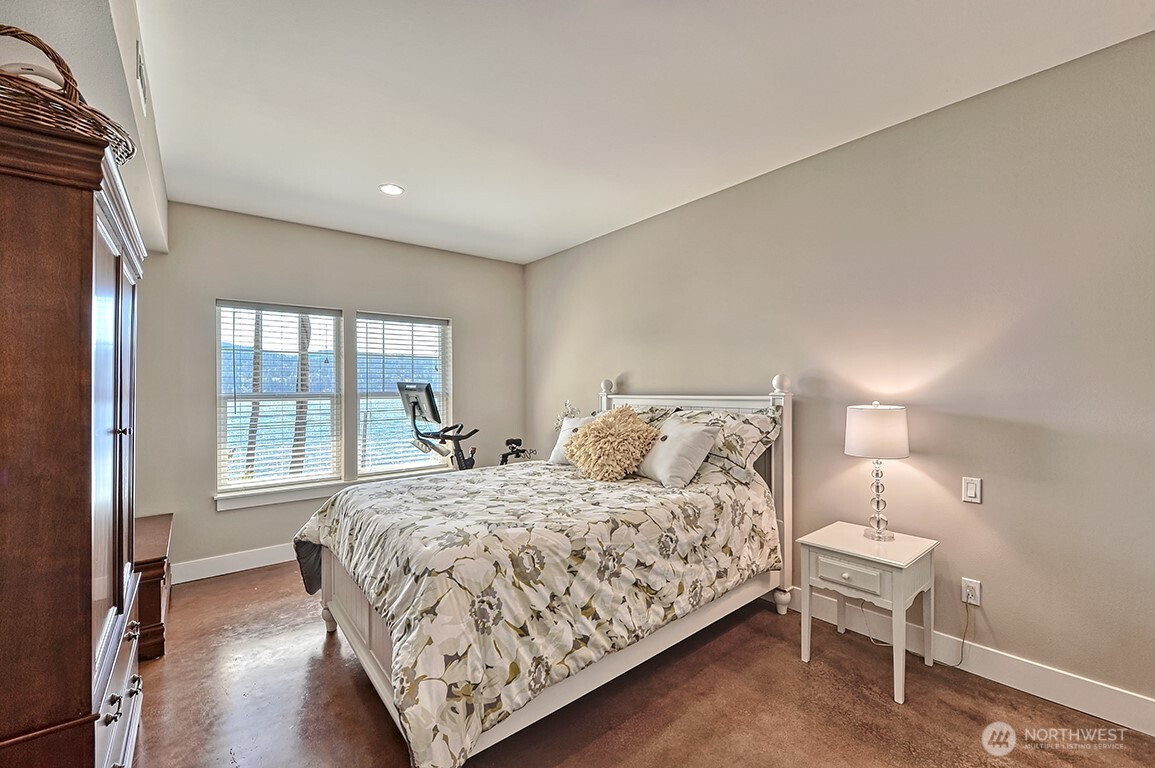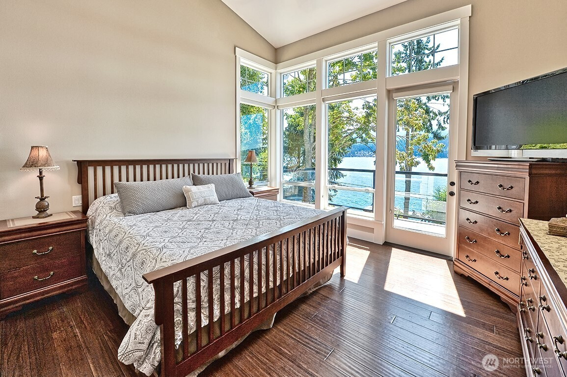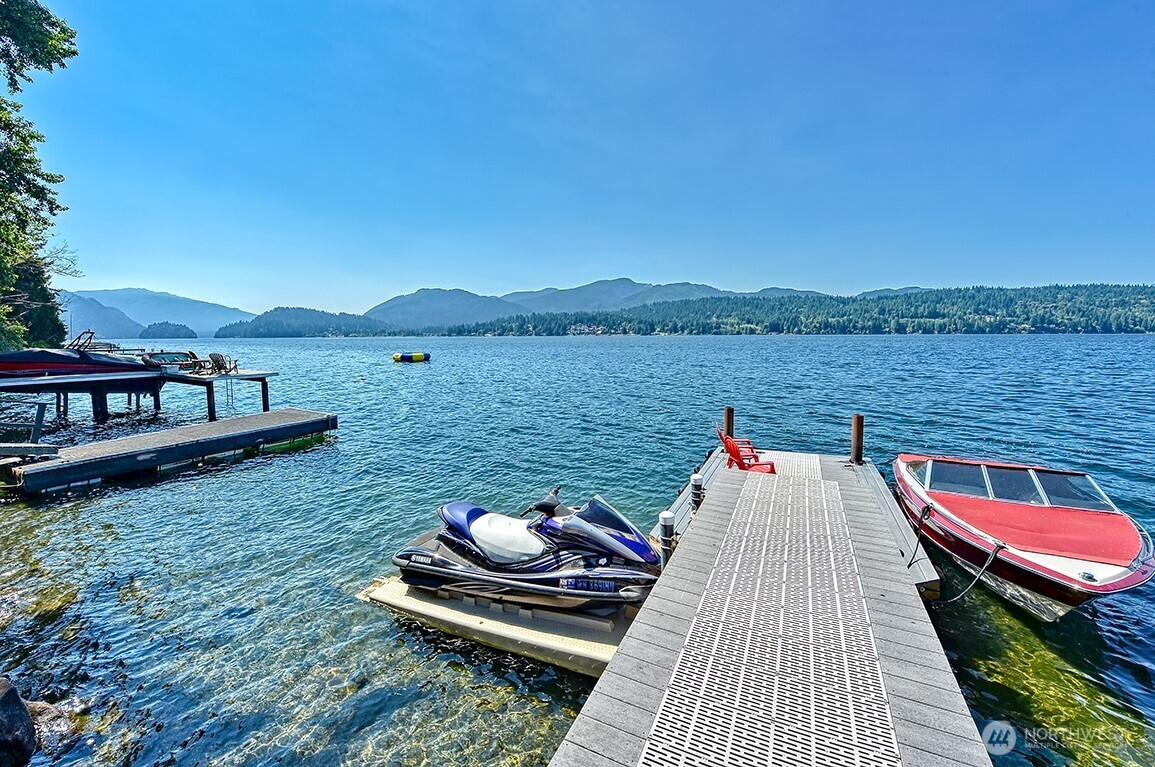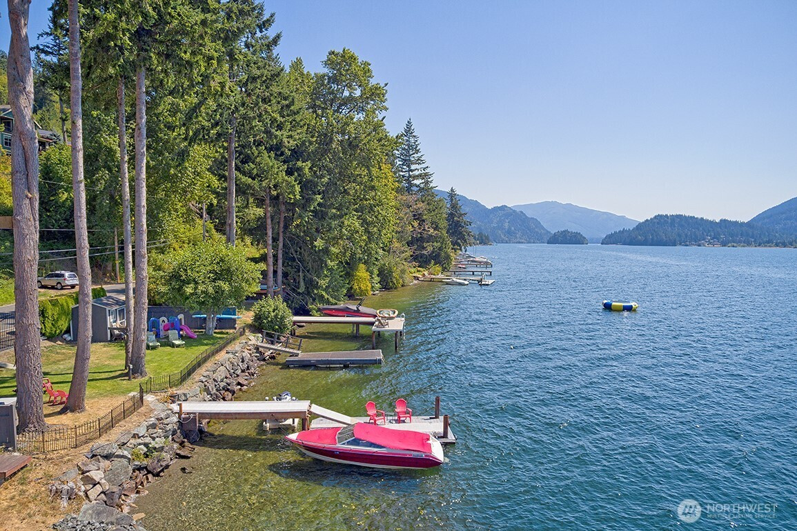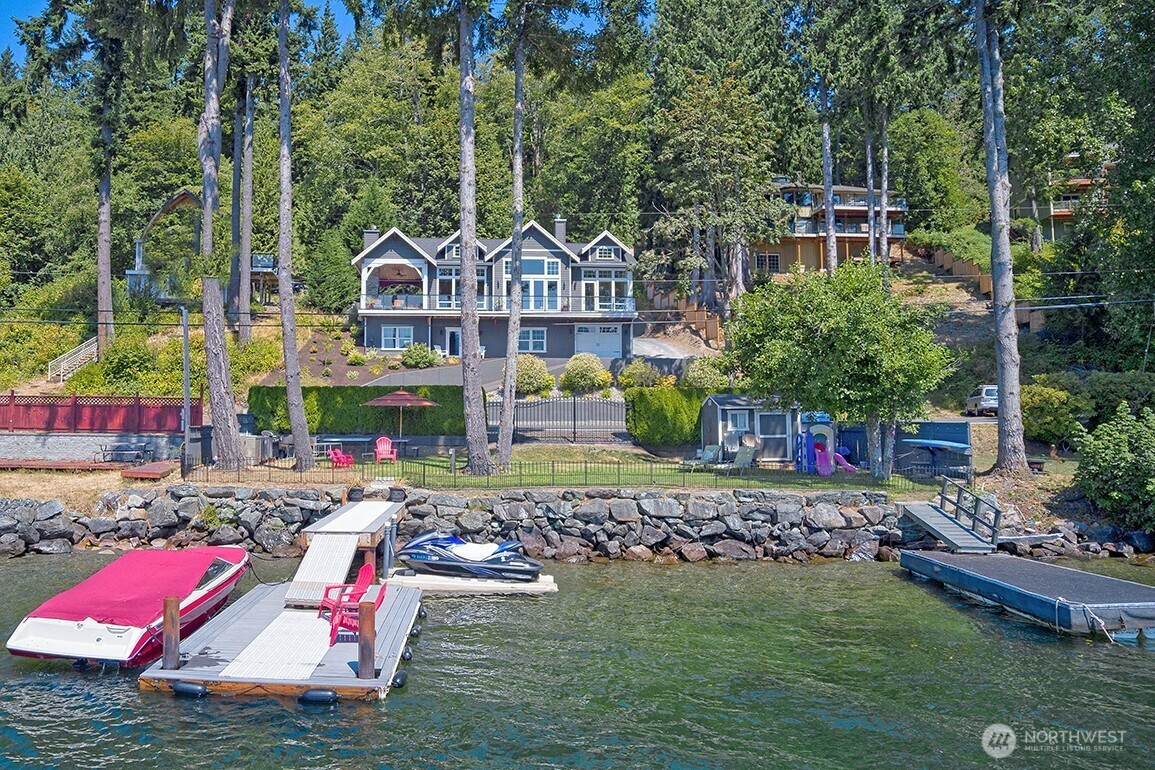 Luxury living on Lake Whatcom! Experience refined waterfront living with sweeping lake views from nearly every room in this stunning contemporary residence on the sunny side of Lake Whatcom. Set on a private 0.56-acre lot with 80 feet of pristine shoreline, the property offers expansive parking and potential for building expansion. The main floor features a thoughtfully designed open layout with floor to ceiling windows, spacious living room, dining room and chef's kitchen with a large island. Custom cabinetry and Butler's pantry. All flowing through a custom-built pass-through window to the large covered outdoor living area. With a statement fireplace and a separate hot tub deck, all overlooking the water. The main floor primary suite provides a peaceful retreat with gorgeous views. The lower level offers 2 spacious bedrooms, full bath, versatile flex room, Second kitchen and laundry room. Lower area is ideal for guests, extended living or potential rental use. The waterfront is equipped with two docks, propane, power, hot and cold water, irrigation and beach storage All creating a Turnkey Opportunity for Summer Fun, Recreation and Relaxation.