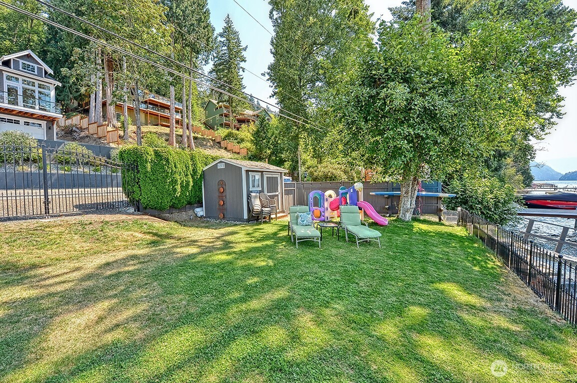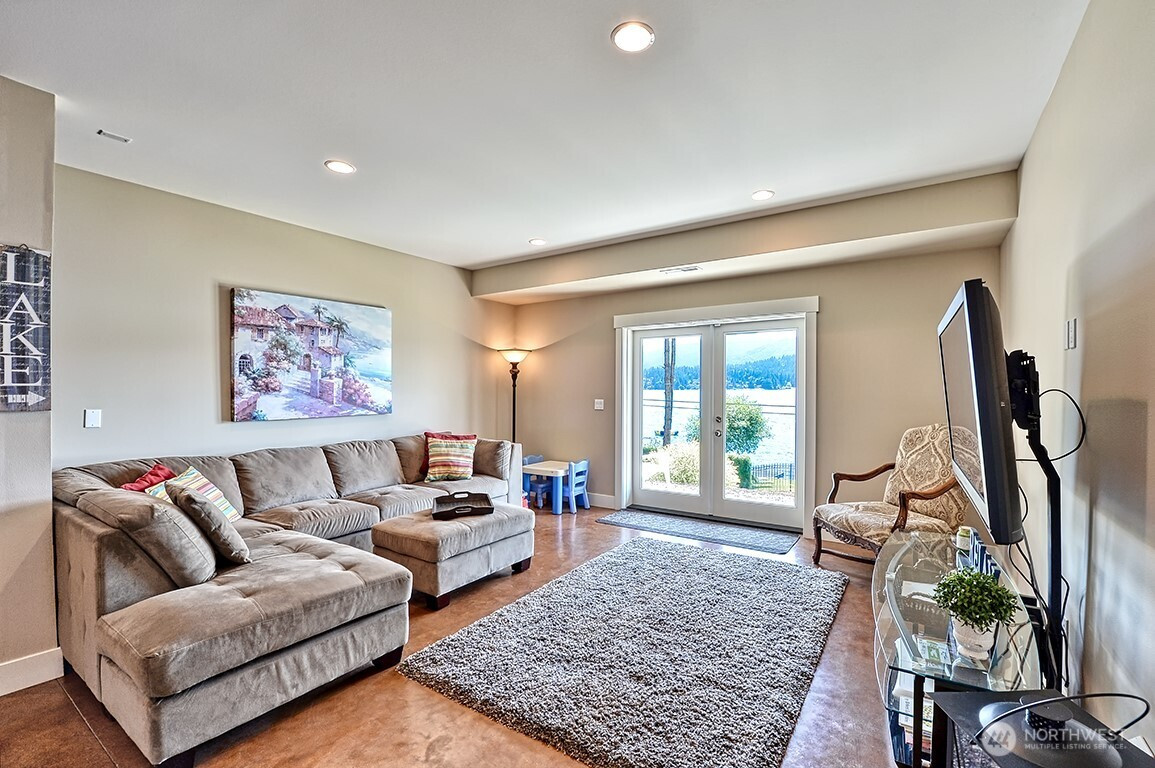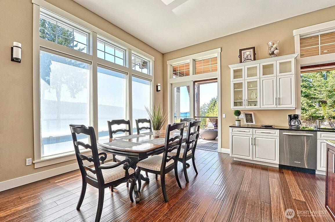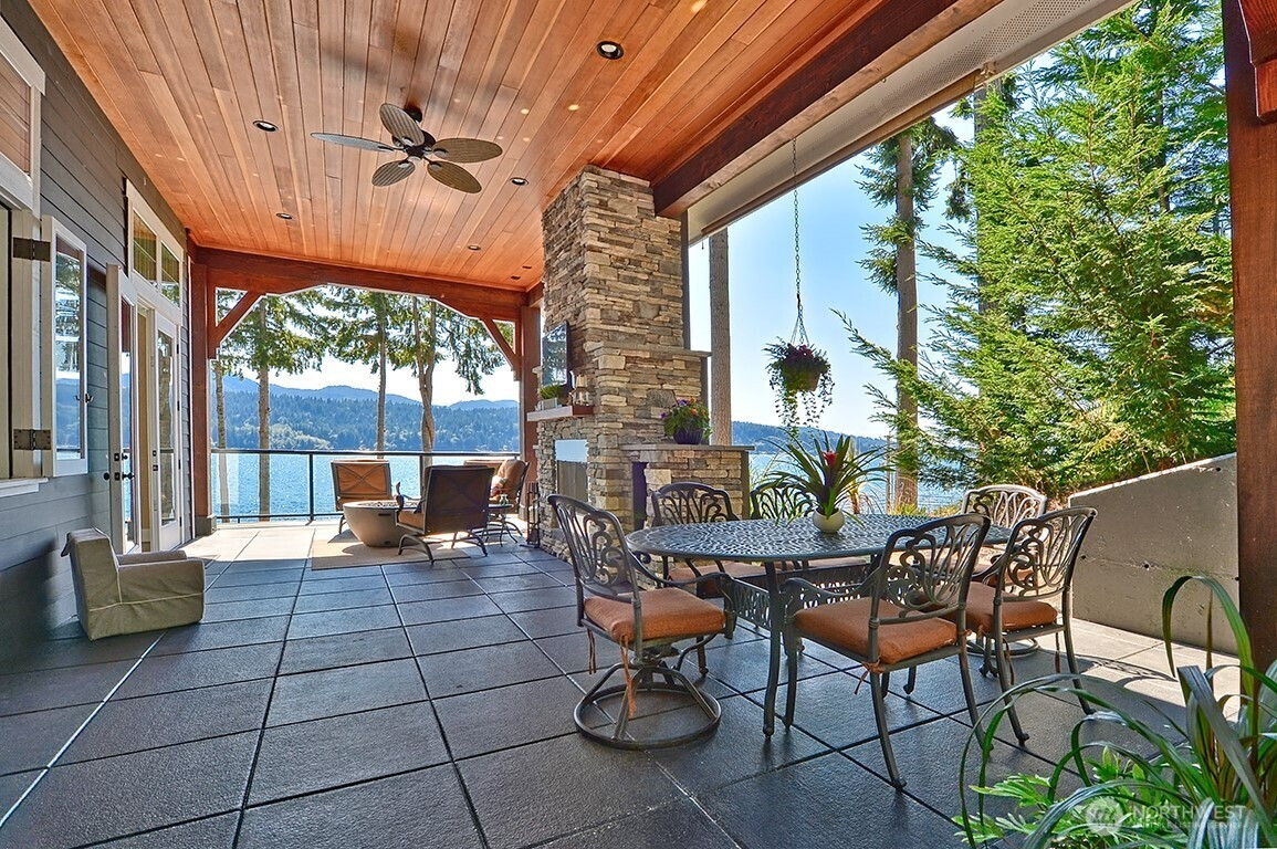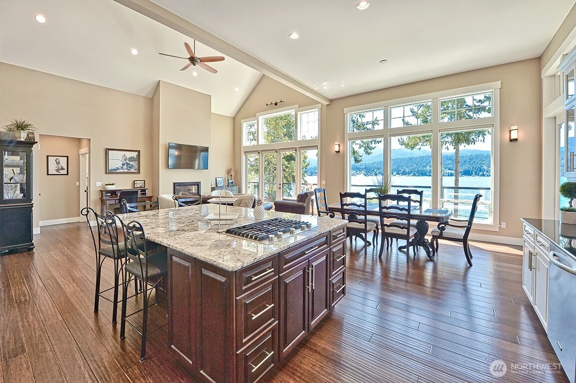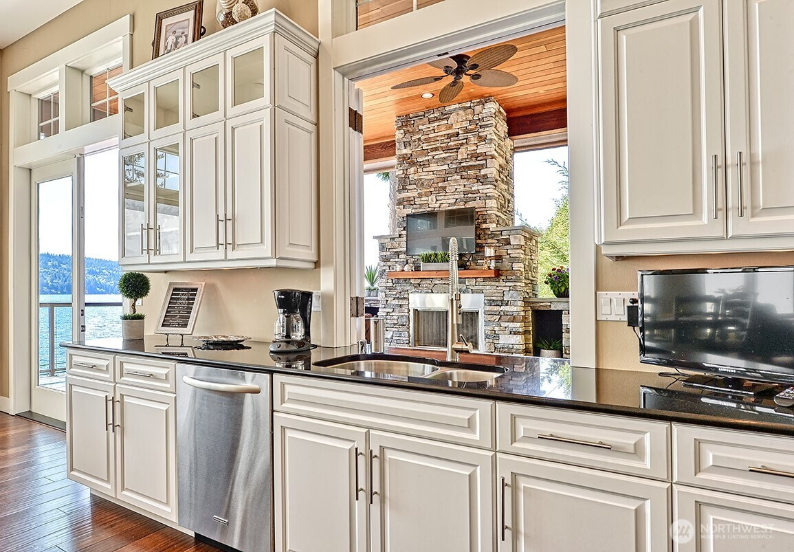 Luxury living on Lake Whatcom! Experience refined waterfront living with sweeping lake views from nearly every room in this stunning contemporary residence on the sunny side of Lake Whatcom. Set on a private 0.56-acre lot with 80 feet of pristine shoreline, the property offers expansive parking and potential for building expansion. The main floor features a thoughtfully designed open layout with floor to ceiling windows, spacious living room, dining room and chef's kitchen with a large island. Custom cabinetry and Butler's pantry. All flowing through a custom-built pass-through window to the large covered outdoor living area. With a statement fireplace and a separate hot tub deck, all overlooking the water. The main floor primary suite provides a peaceful retreat with gorgeous views. The lower level offers 2 spacious bedrooms, full bath, versatile flex room, Second kitchen and laundry room. Lower area is ideal for guests, extended living or potential rental use. The waterfront is equipped with two docks, propane, power, hot and cold water, irrigation and beach storage All creating a Turnkey Opportunity for Summer Fun, Recreation and Relaxation.