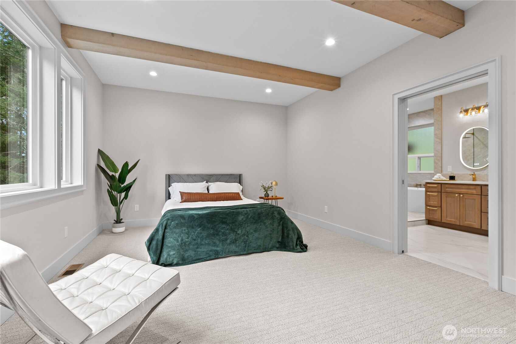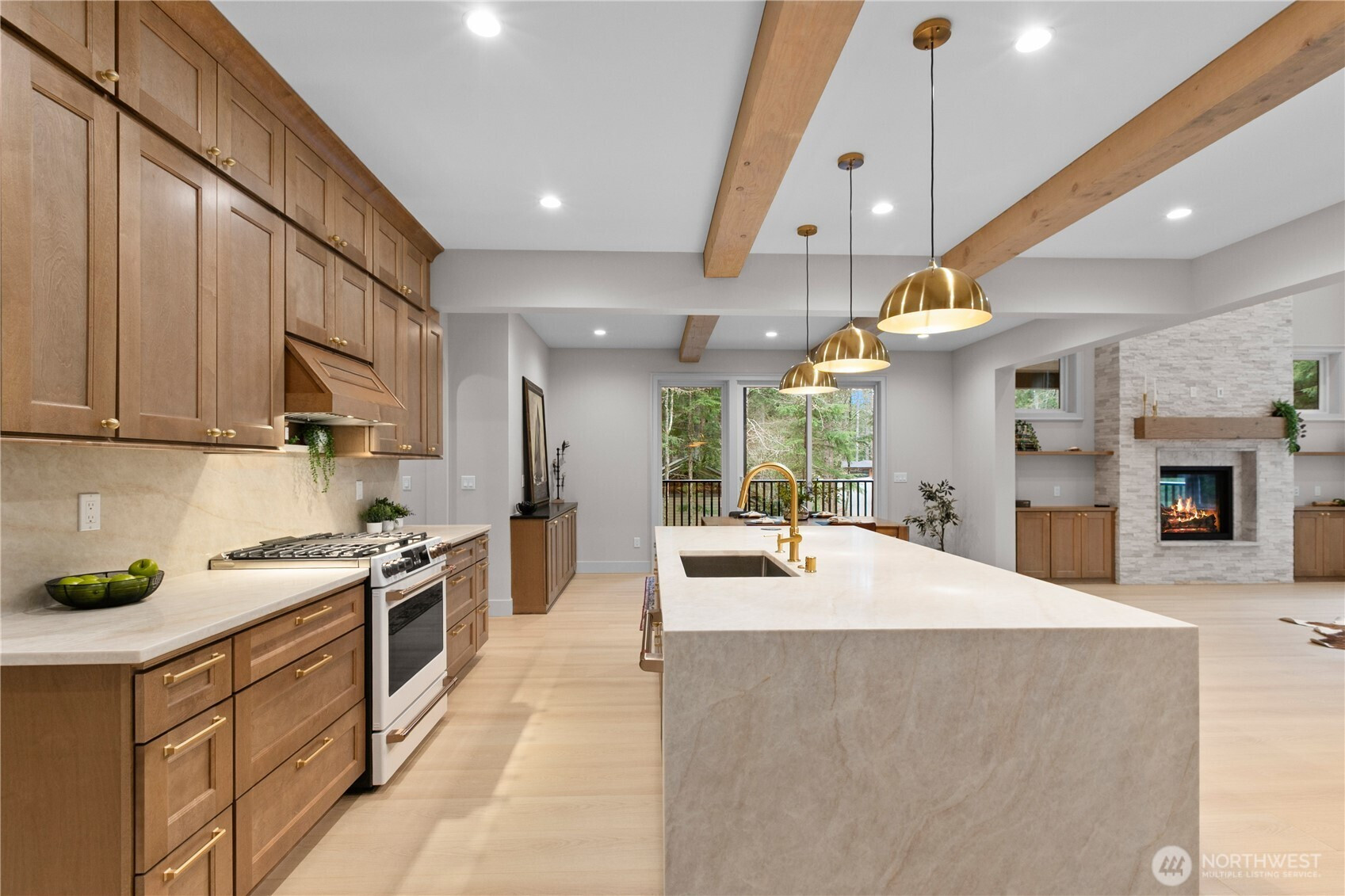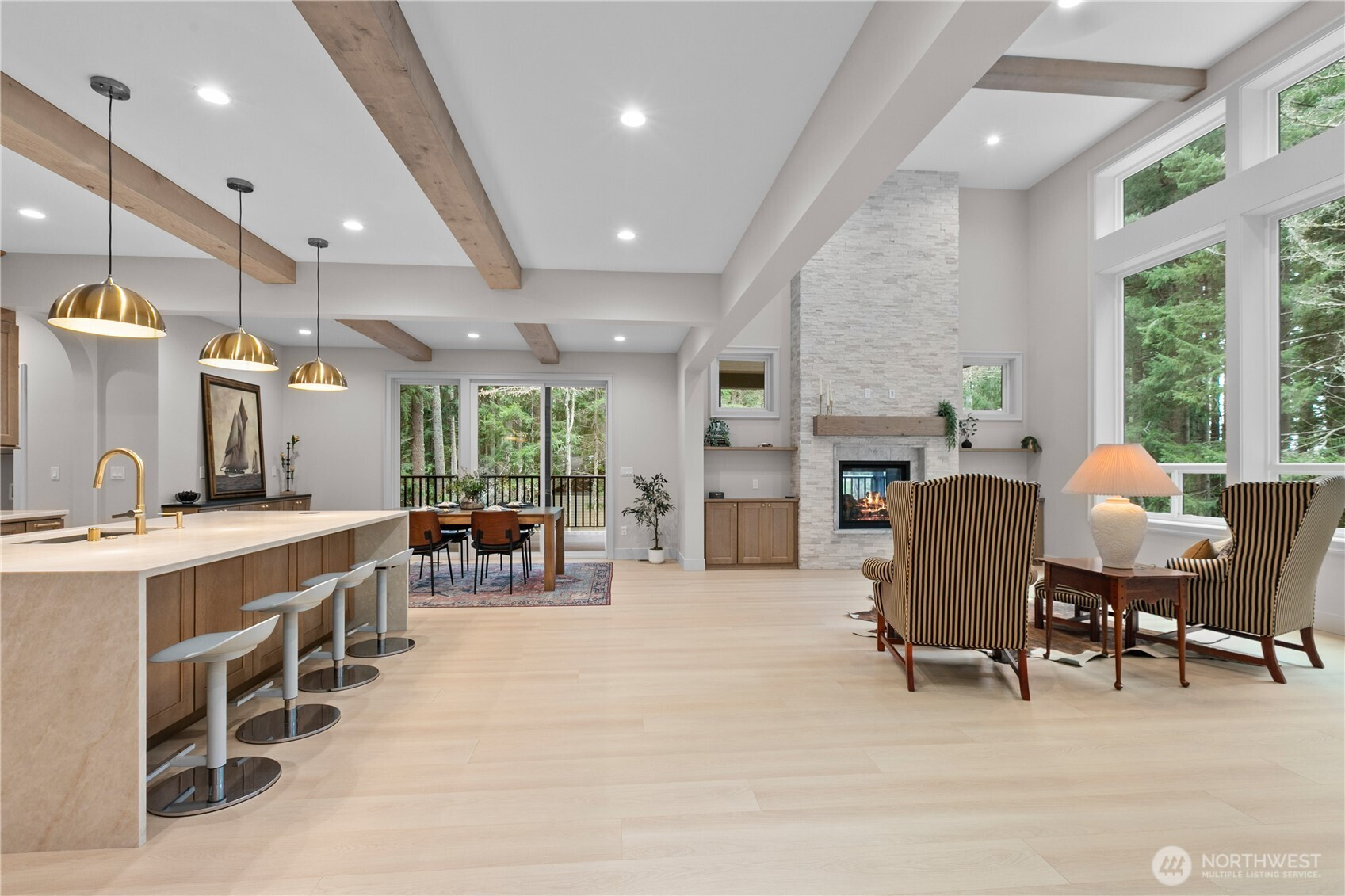 Experience luxury living in this stunning 5 bed, 3 bath custom home with a 2-car garage, surrounded by peaceful greenbelt views . The home features soaring 16-ft ceilings in the living room, exposed natural fir beams, and a striking natural stone fireplace. The chef’s kitchen offers quartz countertops, premium Café appliances, and a gorgeous luxury walk-in pantry with its own sink. Enjoy high-end finishes throughout including LVP flooring, custom built-in cabinetry, a spa-style custom tile walk-in shower, and a relaxing soaker tub. From Douglas fir framing to solid core interior doors and fully wrapped windows throughout, this home is built with quality materials and true craftsmanship. Additional highlights include a metal roof, natural stone exterior, T&G pine soffits, wiring for a generator, glass garage doors, and an EV charger . A dual-sided gas fireplace connects the living room to the covered wrap-around deck, creating seamless indoor-outdoor living. Located in the highly desirable Sudden Valley community, you’re just minutes from town yet next to the lake in your own private paradise. Sudden Valley offers incredible amenities including community parks, private beaches, scenic trails, lake access, a community pool, playgrounds, clubhouse, and restaurant—perfect for enjoying the best of the Pacific Northwest lifestyle.