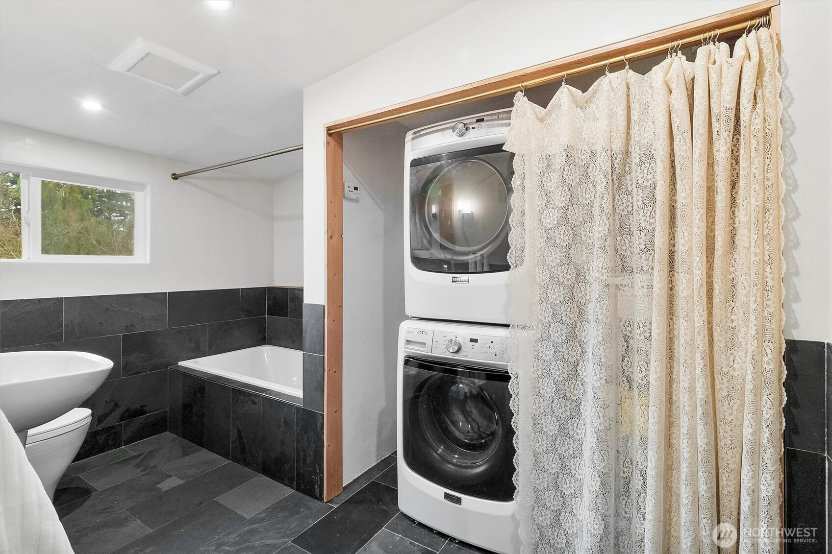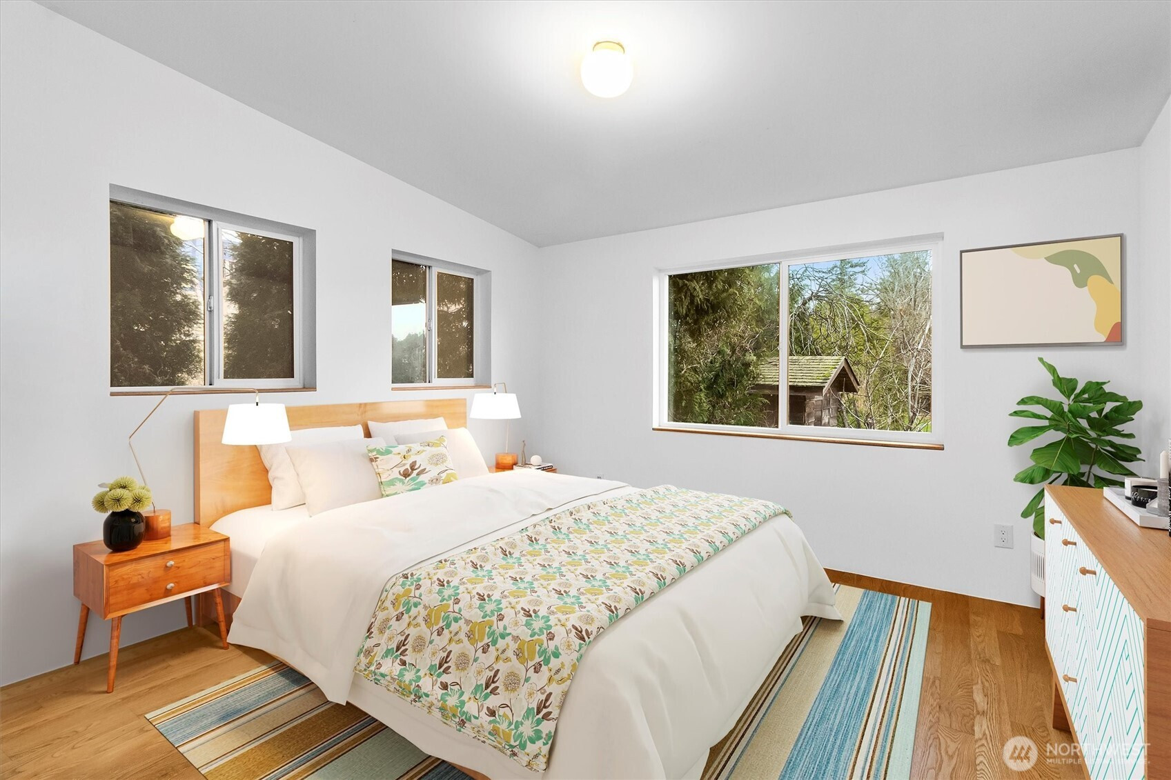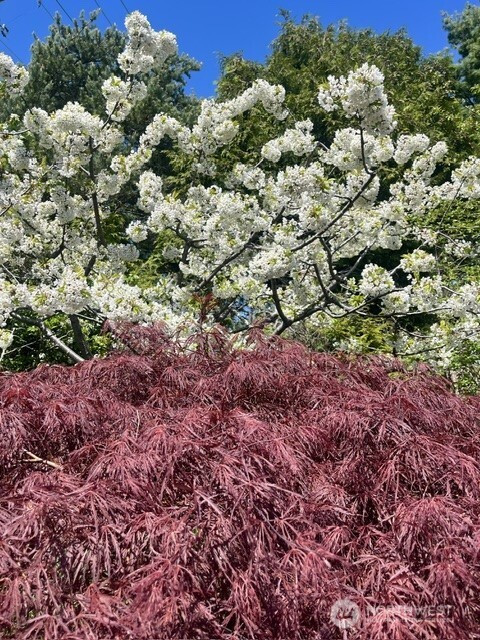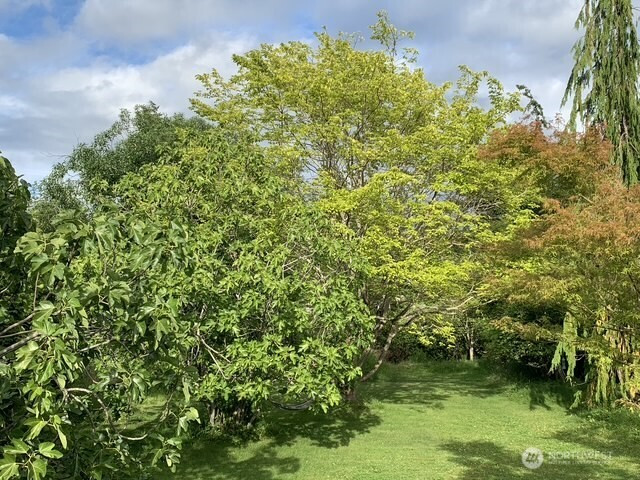 Rare opportunity for privacy & space with city services & county flexibility. Set behind mature landscaping on nearly half an acre, this light-filled Bellingham bungalow offers serene green views from nearly every window. Clerestory windows and a lofted living room bring in abundant natural light, while white oak floors and thoughtful updates prioritize quality, comfort and ease of daily living. The remodeled kitchen features quartz counters, walnut cabinetry, and induction cooking; the bath includes heated slate floors. A detached garage connects to a finished, skylit space insulated, wired, and plumbed with ADU completion in mind. Lush grounds with mature fruit trees and abundant wildlife create a true sanctuary, minutes from downtown.