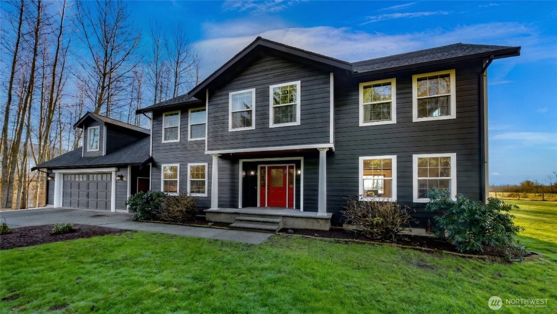 Set just outside Everson, this 2005 NW Contemporary two-story offers over 2,800 square feet with 4 bedrooms and 2.5 baths on 9.9 acres of level open space. Fresh new exterior paint sets the tone, and inside you’ll find hardwood floors, abundant natural light, and a gas fireplace anchoring the main living area. The open main floor keeps the kitchen, dining, and living areas connected, with granite countertops, custom cabinetry, stainless appliances, and a new range. Upstairs includes the primary suite plus three additional bedrooms, while a large bonus room above the garage adds flexible space for work, hobbies, or recreation, and the main-level laundry room adds everyday convenience. Morning coffee feels quieter here, with open-sky light across the acreage and the fireplace waiting when the sun drops behind the mountains. Step out to the spacious deck that captures big-sky sunsets over territorial and mountain views. Expect daily nature moments: Anna’s and rufous hummingbirds working the honeysuckle in the backyard, cedar waxwings sweeping through the trees, and great horned owls calling at dusk. The acreage offers room to garden, keep animals, and enjoy a quiet rural setting. Property is currently in an Open Space designation that may provide tax benefits; buyer to verify eligibility and continuation. The attached garage and wide gravel drive provide plenty of parking, including space for RVs and additional vehicles.