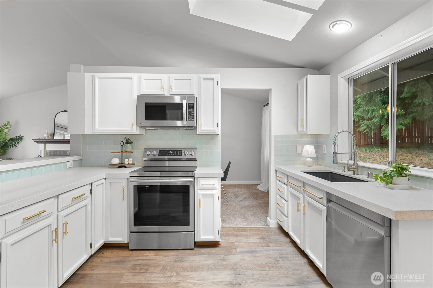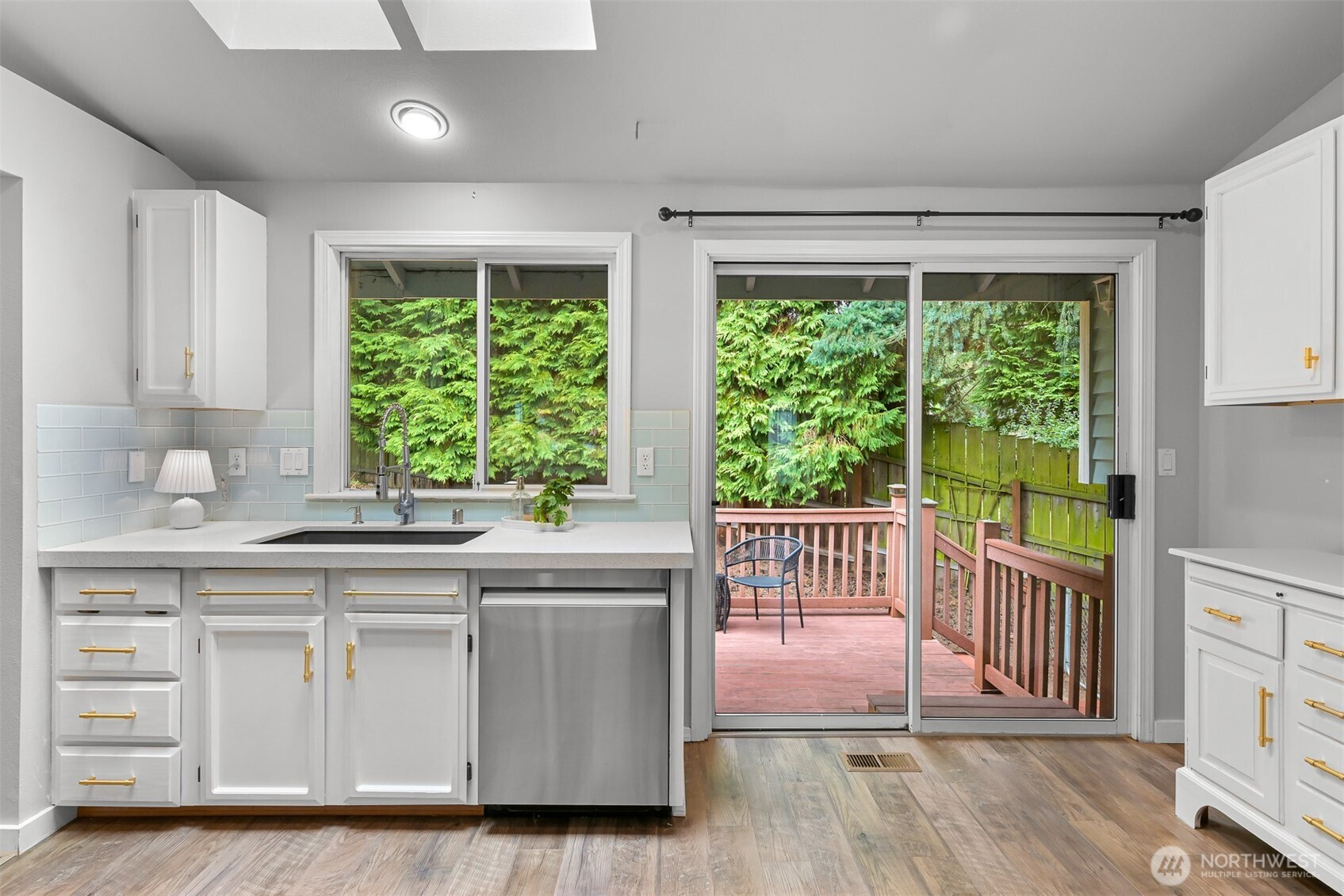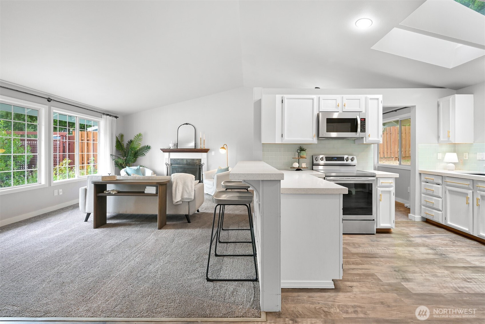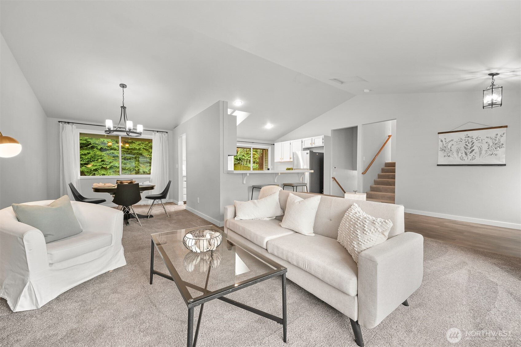 Welcome to this beautifully laid out home in the sought after Tweed Twenty neighborhood. The updated open kitchen features quartz countertops and vaulted ceilings, flowing into a bright dining and living area filled with natural light. Upstairs, the spacious primary suite includes a full bath, with two additional generous bedrooms nearby. The lower level offers a versatile family room or home office with slider access to the fully fenced yard. Recent updates include a brand new hot water tank for added peace of mind. Enjoy a sunny patio, deck off the kitchen, large shed, and gorgeous low maintenance native garden. With plenty of parking plus trails and parks close by, this home has it all.