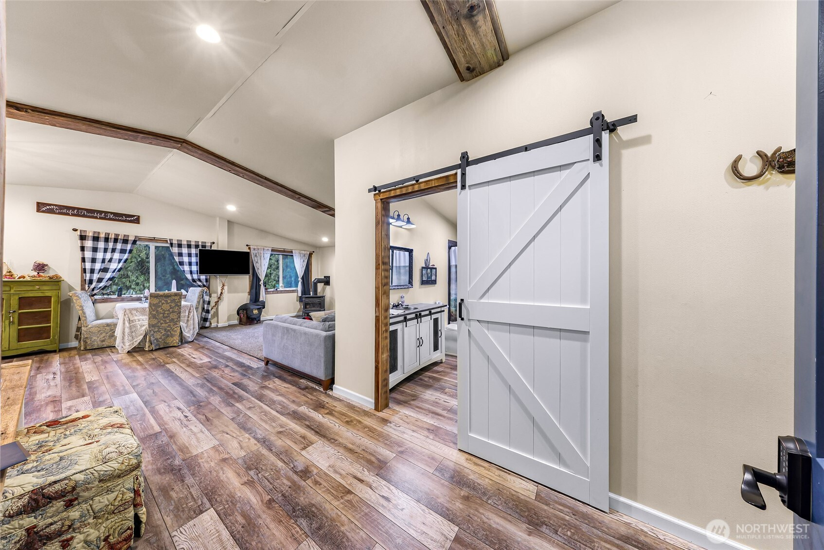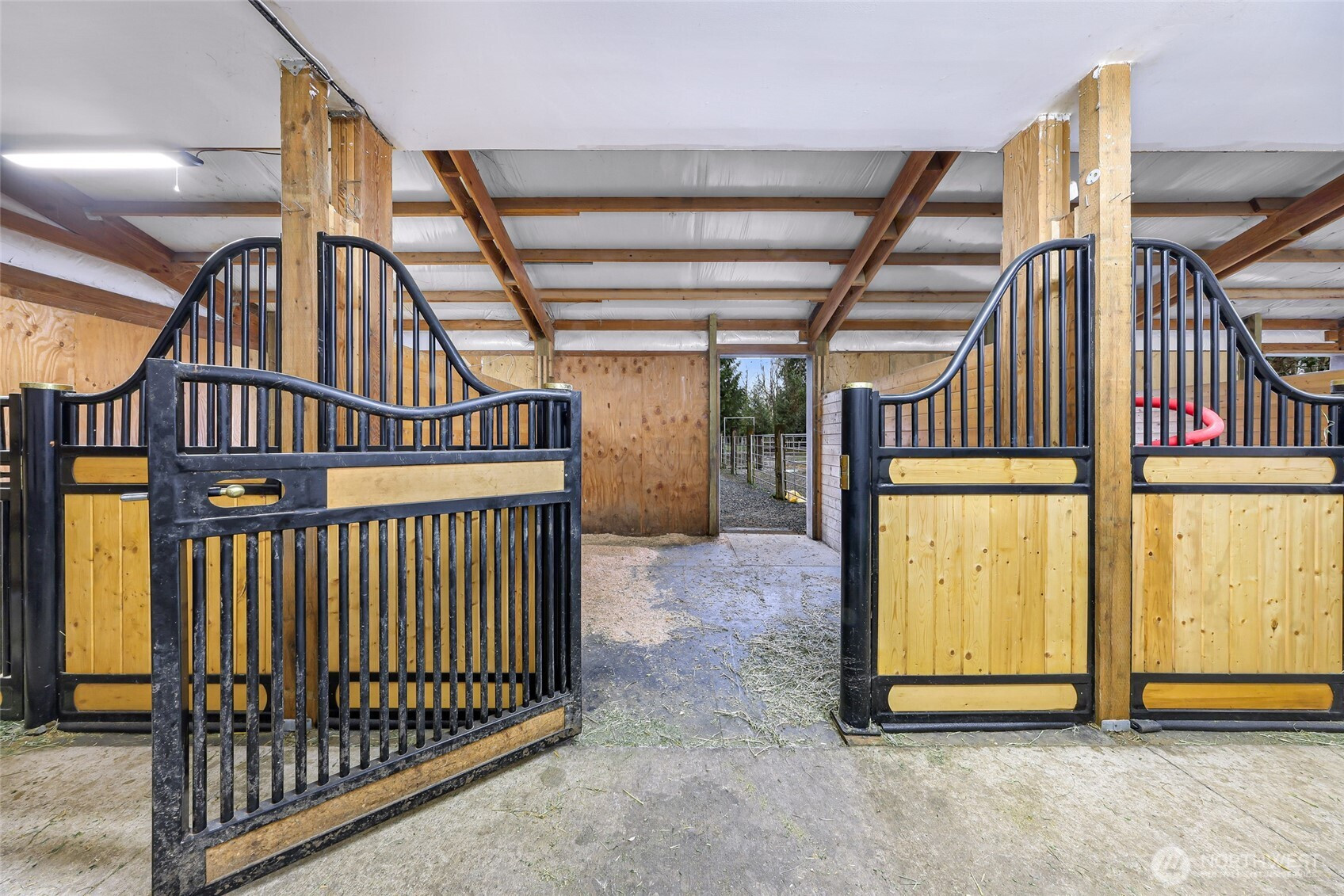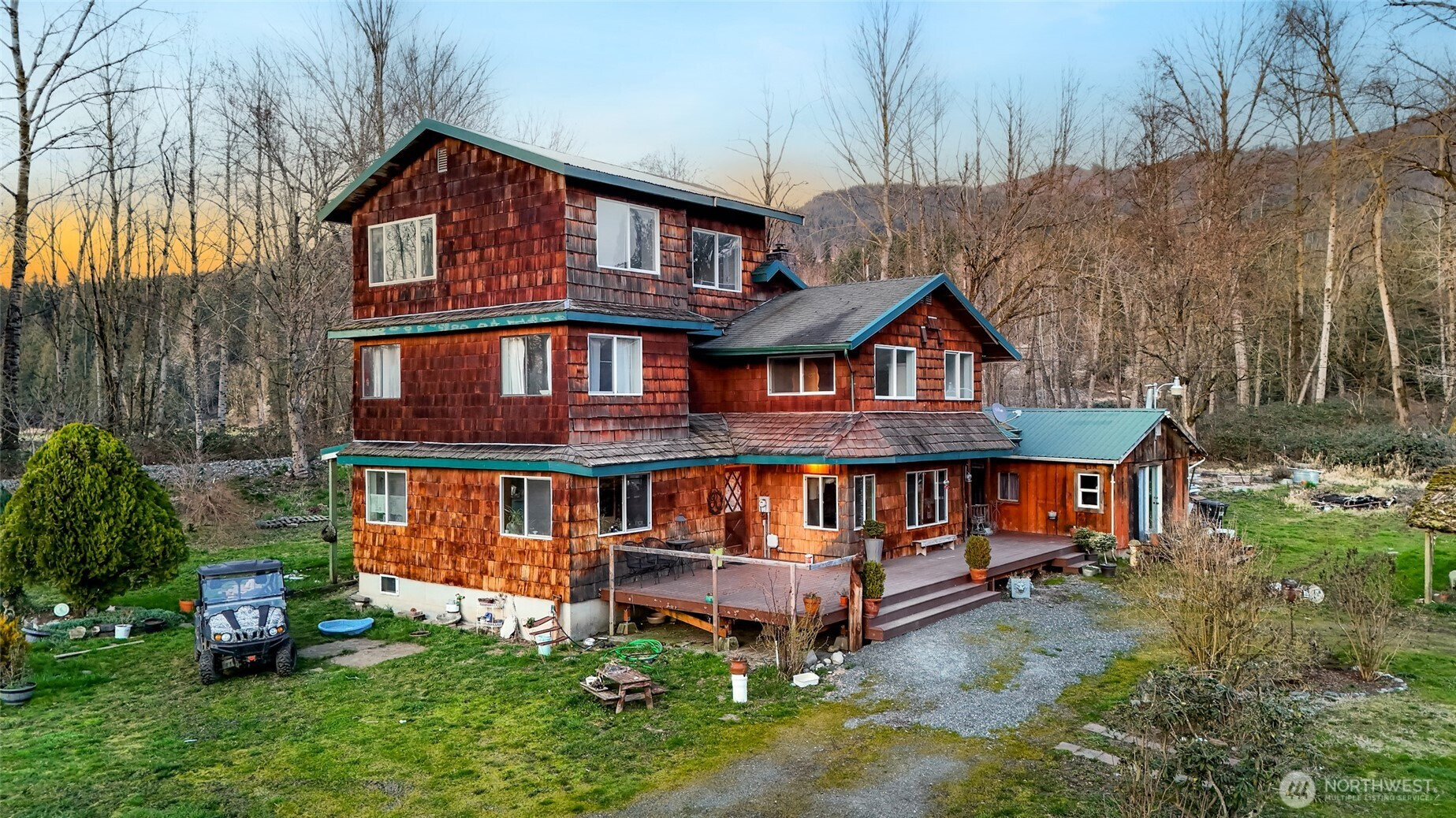 Set on 5 private acres with views of Sumas Mountain, this distinctive property offers space, versatility, and a peaceful natural setting. The main home features 2,678 sq ft with 4 generously sized bedrooms, wide hallways designed for accessibility, and abundant windows bringing in natural light throughout. The open-style kitchen creates an inviting central gathering space and includes a large pantry. Recent improvements include fresh interior paint, new carpet installation, and a refreshed Trex deck. A durable metal roof adds long-term value and low maintenance. Ruby Creek runs behind the property and provides irrigation water rights, enhancing both the beauty and functionality of the land. The grounds feature mature landscaping with apple, plum, and fig trees along with a greenhouse for year-round gardening. Equestrian amenities include a well-built 4-stall horse barn featuring classic European-style stall fronts, wide aisle access, turnout areas, no climb fencing, metal fencing, and upgraded gravel footing. The barn also includes a 2-car garage for equipment, vehicles, or additional storage. Above the barn is a 1,440 sq ft barndominium/ADU with 3 bedrooms, kitchen, and walk-in pantry, offering flexibility for guests, rental income, or multi-gen living. Multiple outbuildings provide additional storage and workspace, while unique cedar stump structures add character. A rare opportunity for private acreage living with mountain views and equestrian infrastructure.