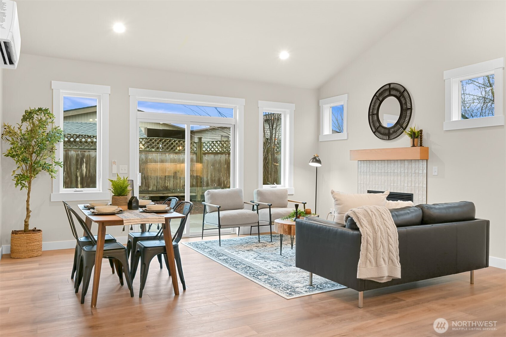 Brand New 55+ living! Single-level luxury with absolutely ZERO steps, situated at the end of a dead-end street. Intelligent design captures the essence of true Northwest architecture with a modern flair. Generously sized windows & vaulted great room ceilings create a light & airy atmosphere. Magnificent chef's kitchen fully loaded with quartz counter tops, stainless appliances, soft close drawers & under cabinet lighting. Spacious vaulted primary bedroom & a spa-like ensuite. Enjoy your own backyard with a patio & privacy fence, plus the convenience of an attached garage—all in a serene, quiet location, in a gated secure neighborhood. Efficient heating & A/C. Oversized 1 car garage with a lot of storage capacity & pre-wired for EV charger.