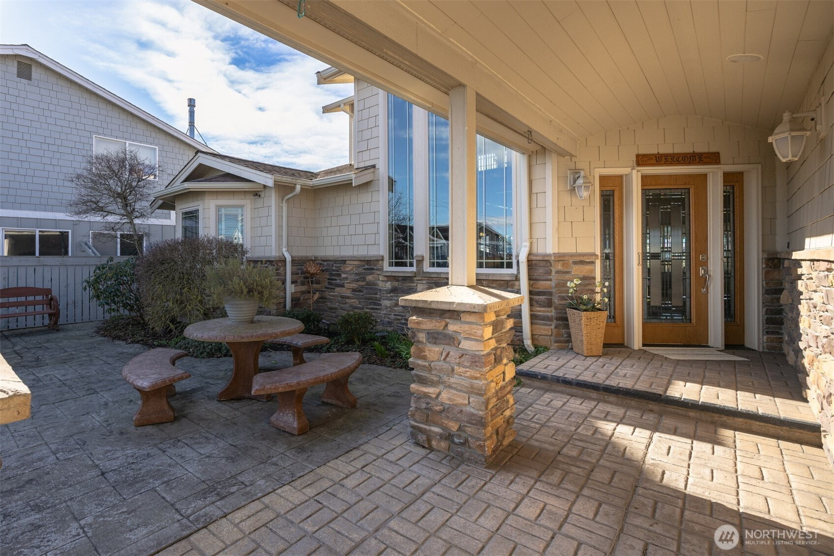 This exquisitely crafted home showcases beautiful, thoughtful details throughout, making it truly one of a kind. The elegant curved staircase is bathed in natural light from dramatic double-height windows. The expansive living room features a striking beamed ceiling & a full-width accent wall with a warm fireplace & recessed TV nook. An incredible all-season sunroom is surrounded by windows on 3 sides & offers lovely canal views, a fireplace & built-in cabinetry—perfect for entertaining. Cooking is a pleasure in the refined kitchen that is equipped with a new gas cooktop, abundant custom cabinetry & pull-out storage. Keep visual clutter to a minimum with hidden outlets that are perfect for small appliances & electronics. There are 2 primary bedrooms, each w/ a spacious en-suite bath, that offer exceptional water views & flexibility for varying mobility needs. There is another main floor bedroom & full bath perfect for guests. Relax outside in the cozy courtyard beside the entry or around the fire pit overlooking the canal. Spread your wings & launch your kayak or boat off the private ramp to explore the coastline. Additional features include a new high-efficiency furnace, newer on-demand water heater, security system, built-in speaker system, central vacuum, an extra-large garage & abundant storage. Enjoy all that the Sandy Point community has to offer: boating, golf, pickleball, swimming pool, clubhouse amenities, exceptional birding, peaceful views & waterfront life!!