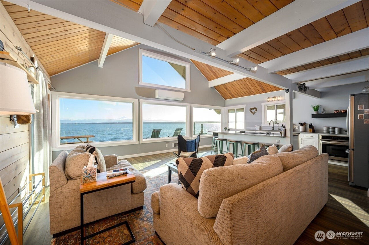 Welcome to this beautifully maintained 2 bed + open loft, 1 bath waterfront home in the desirable Sandy Point community! Enjoy fiery sunrises from the freshly stained deck overlooking 62' of waterfront with low bank access for easy kayak & SUP launch. East-facing with gorgeous backdrop of Mt. Baker & Twin Sisters, this charming, updated beach house features soaring tongue & groove ceilings, an updated kitchen w/ new refrigerator, an updated bath, and a spacious loft that accommodates 4–6. Other features include new W/D, new roof in May, newer siding & windows. Community amenities include private golf course, marina, pickle ball & tennis courts, clubhouse & pool. Operating as an active Airbnb/short-term rental with all furnishings included.