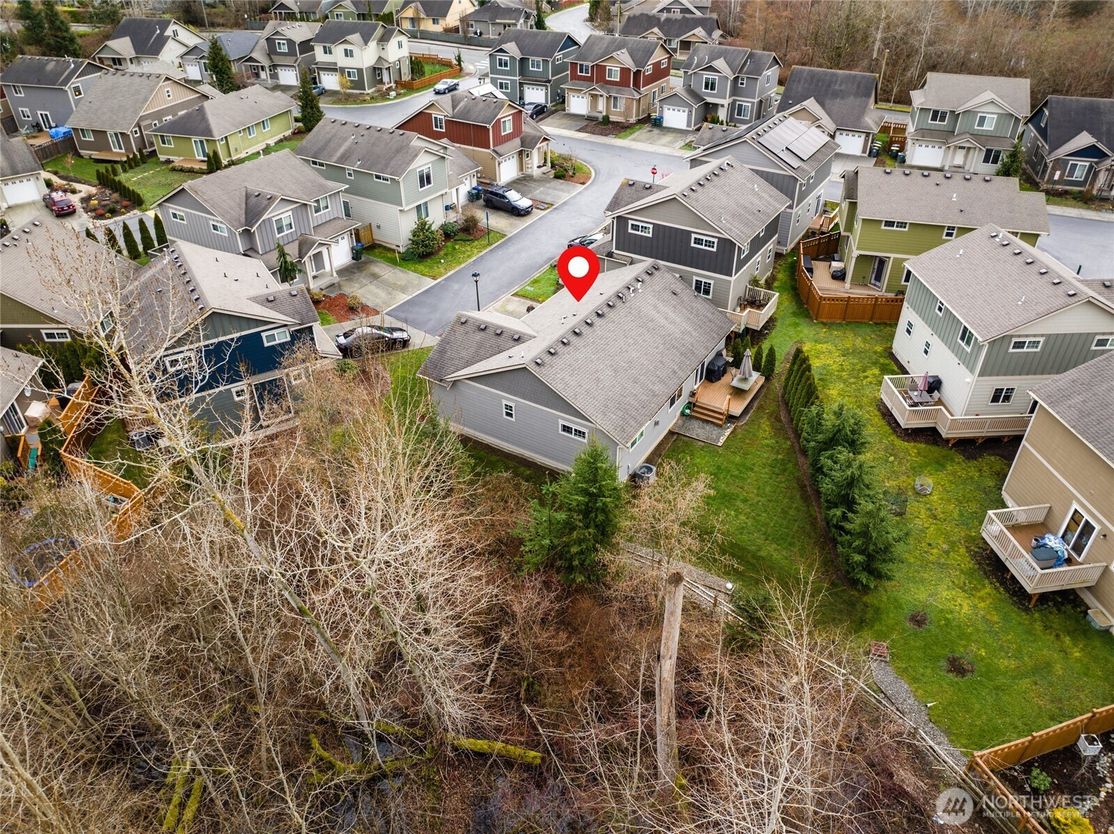 Investor alert! House has an amazing tenant paying $2650 per month who would love to stay in house. It's currently managed by Utopia. Best location in June Road Cottages at the end of Gale Ln with a large back yard abutting a greenbelt. Lot size is 5227 SF which the largest in the entire development. House is one level and laid out in a manner that makes it feel larger than it is. Open concept living, kitchen and dining with vaulted ceilings and backyard access. Bedrooms stretch back down a hallway with 2 guest rooms and a full bath then terminates at the large primary suite with vaulted ceilings. 1 car garage is attached to home through laundry and mudroom. Very efficient layout. House has been meticulously kept and feels like new. Harwood floors, chef's kitchen and a back deck perfect for BBQing. Once inside the home you feel as if you have complete privacy. Views over yard into greenspace.