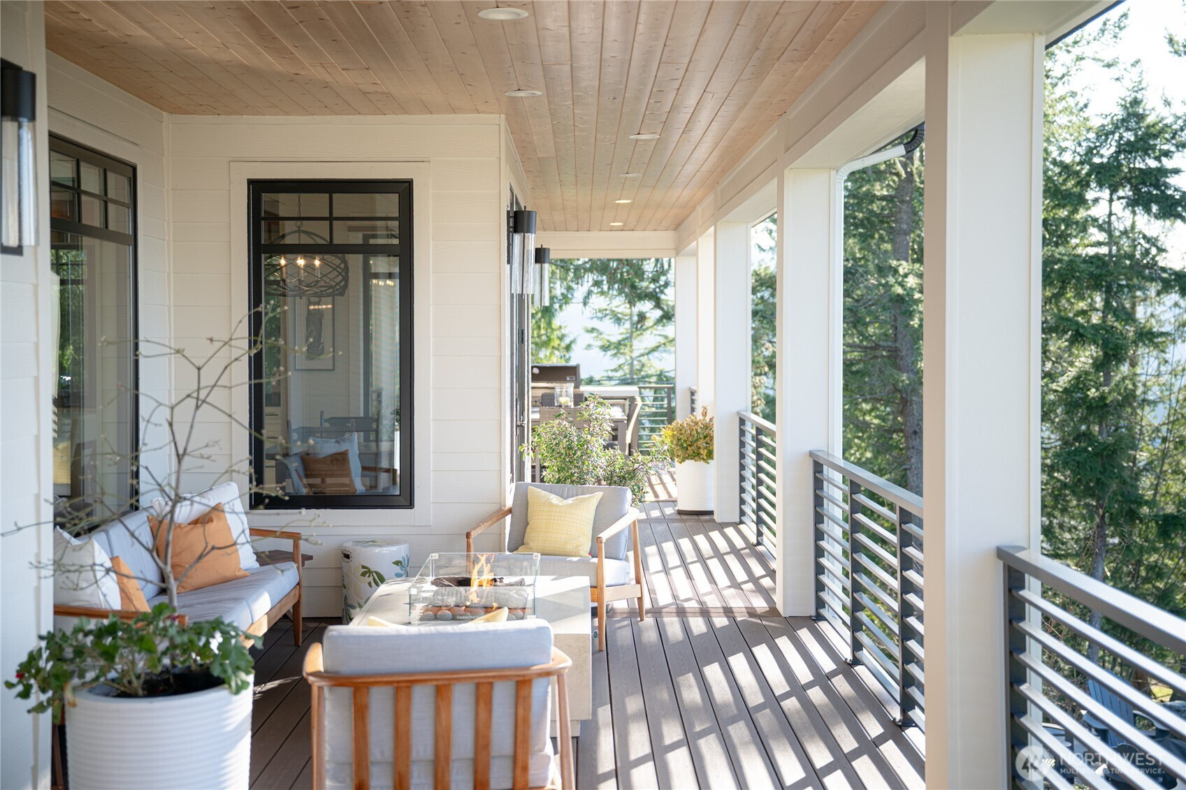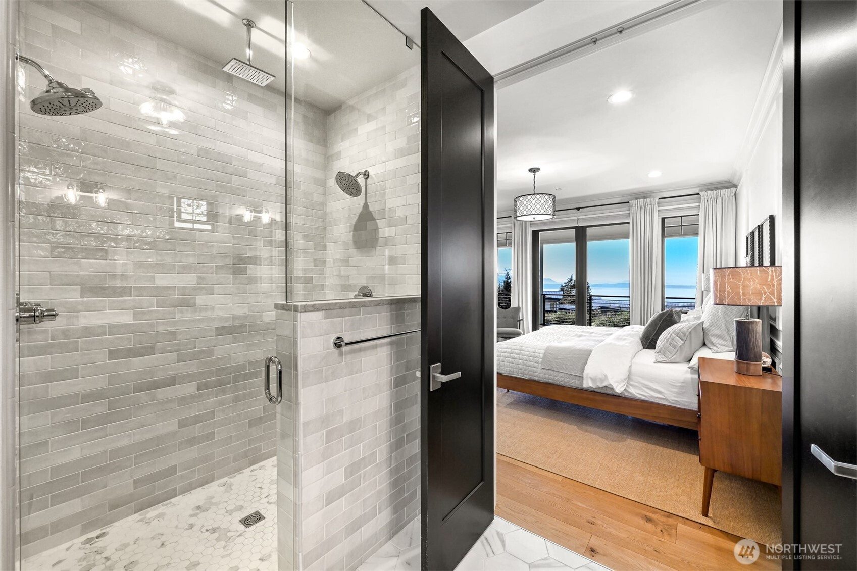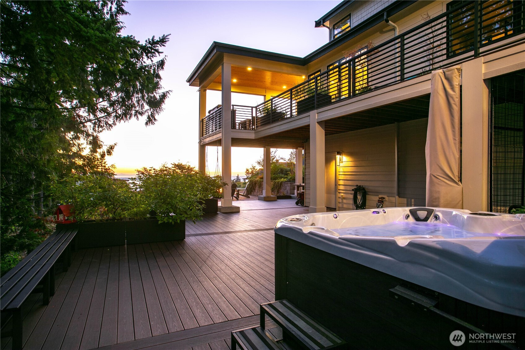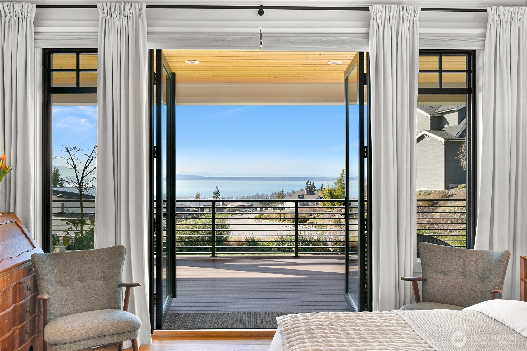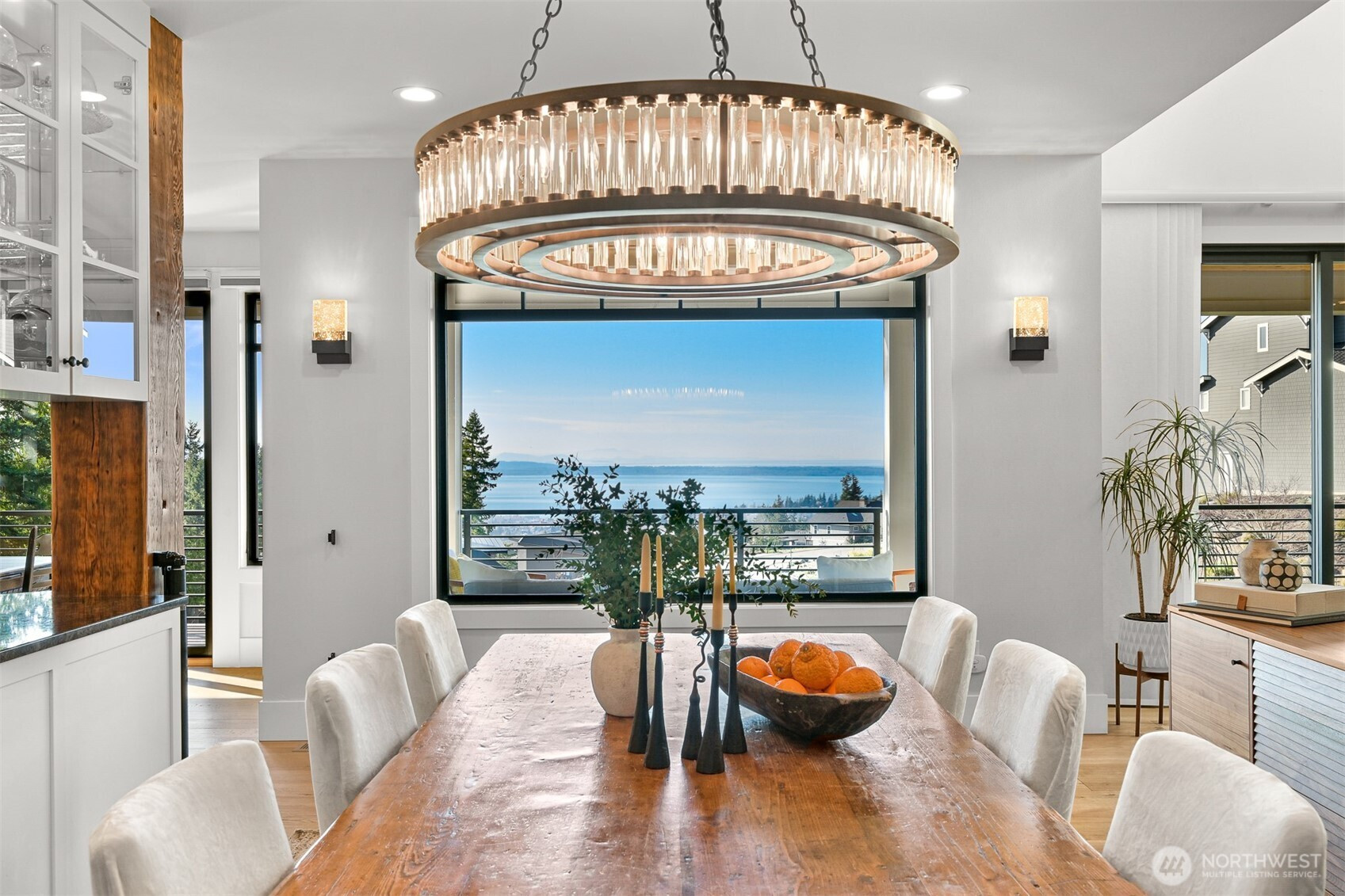Perched above Bellingham with sweeping vistas of the San Juan Islands, Bellingham Bay, and beyond, this extraordinary residence blends architectural craftsmanship with modern PNW elegance. Designed to capture breathtaking views from every room, the home showcases a dramatic 28' vaulted fir ceiling & reclaimed beams salvaged from a historic Seattle pier. The main living area is anchored by an elegant 6' tile-surround gas fireplace w/ a honed granite hearth, while walls of glass open to the wraparound covered deck w/ 80' of west-facing frontage for sunset views & seamless indoor-outdoor living. The kitchen makes an immediate impression, with a generous quartz island, honed black granite countertops, and premium Thermador appliances. The main-level primary suite offers serene water views, a walk-in closet with Bosch washer/dryer, radiant floors, and a soaking tub. Upstairs, 3 bedrooms each feature a private en suite, along w/ a media room complete w/ a wet bar, bathroom, & private balcony. The main floor office, generous radiant-heated mudroom, finished 4 car garage, & additional parking enhance functionality. Motorized window treatments, whole-house AC, and generator provide year-round comfort and peace of mind. TimberTech decking, an 8-person hot tub, and extensive hardscape and landscaping complete the setting. Custom millwork, curated tile accents, and striking designer lighting elevate every space, creating timeless luxury in one of Bellingham’s most coveted settings.