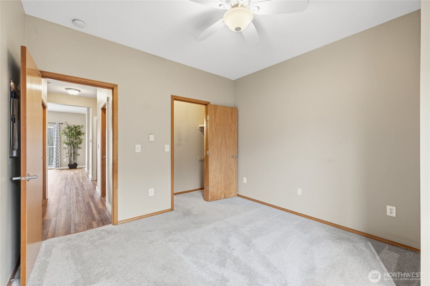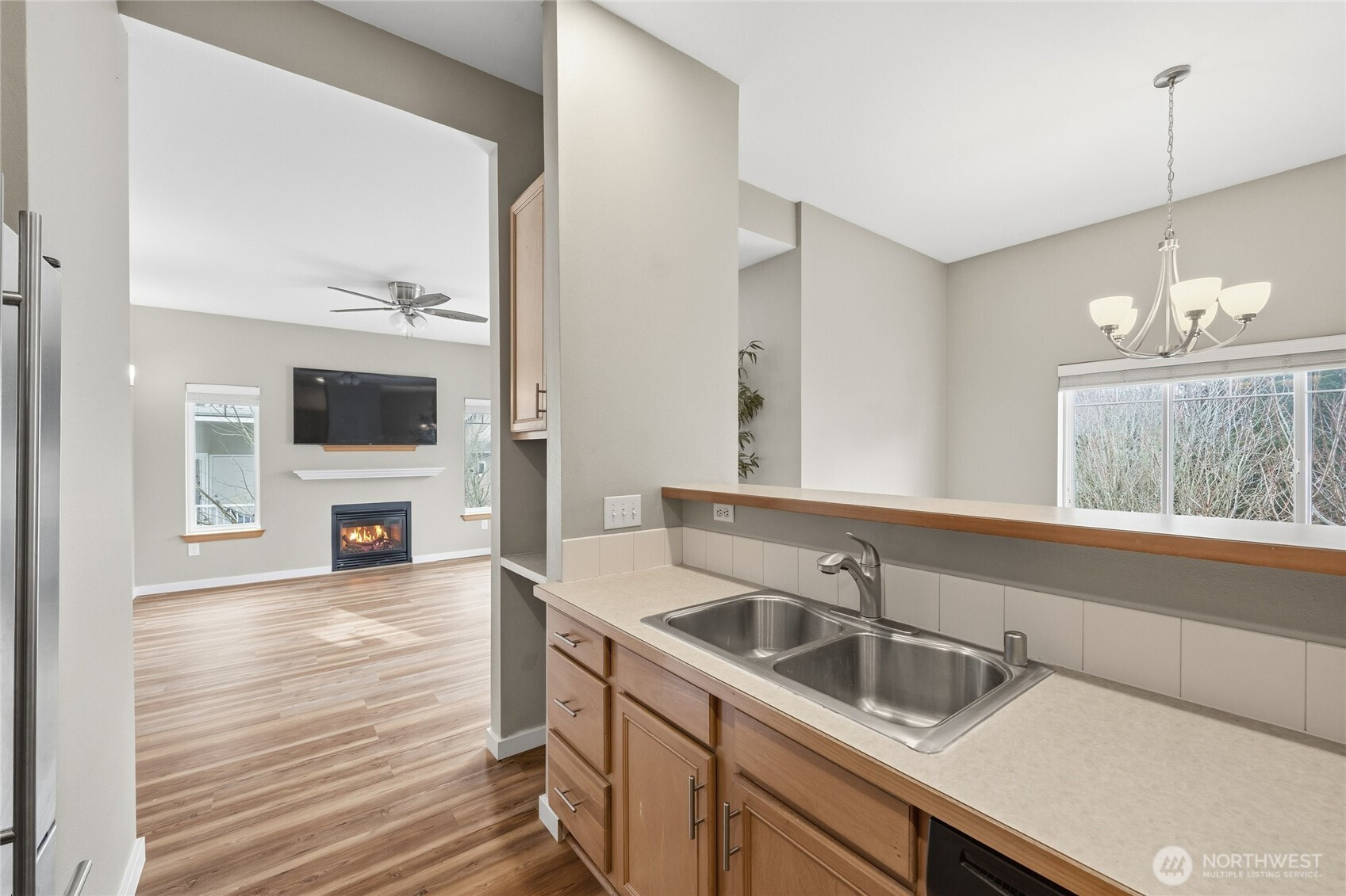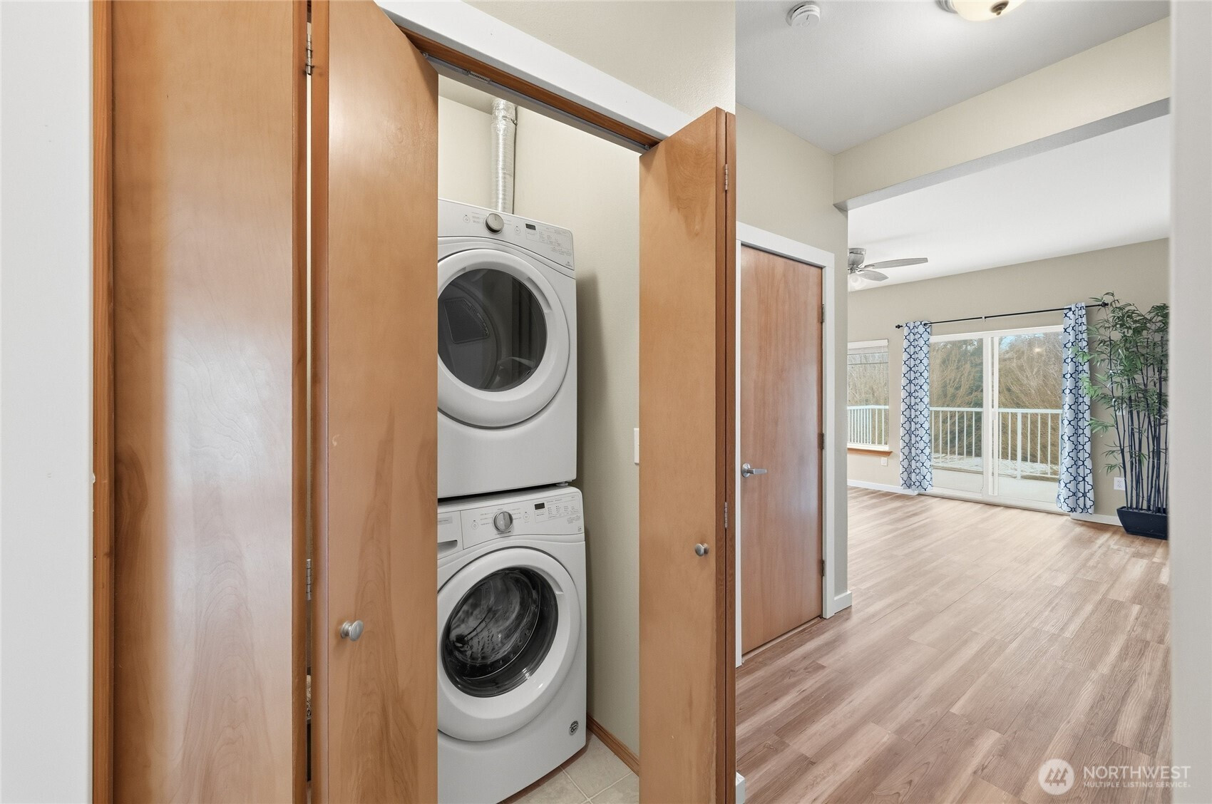 Beautiful top-floor 2-bedroom, 1.75 bath condo offering 1,130 sq ft of comfortable living space. Enjoy tall ceilings and abundant natural light that create an open, airy feel throughout. Updated flooring adds a modern touch, while the cozy gas fireplace brings warmth and charm to the large living room. The private deck is perfect for relaxing or entertaining and includes an additional storage closet for your goodies. Convenient in-unit washer and dryer, covered designated parking, and HOA dues that cover water, sewer, and garbage make for easy, low-maintenance living.