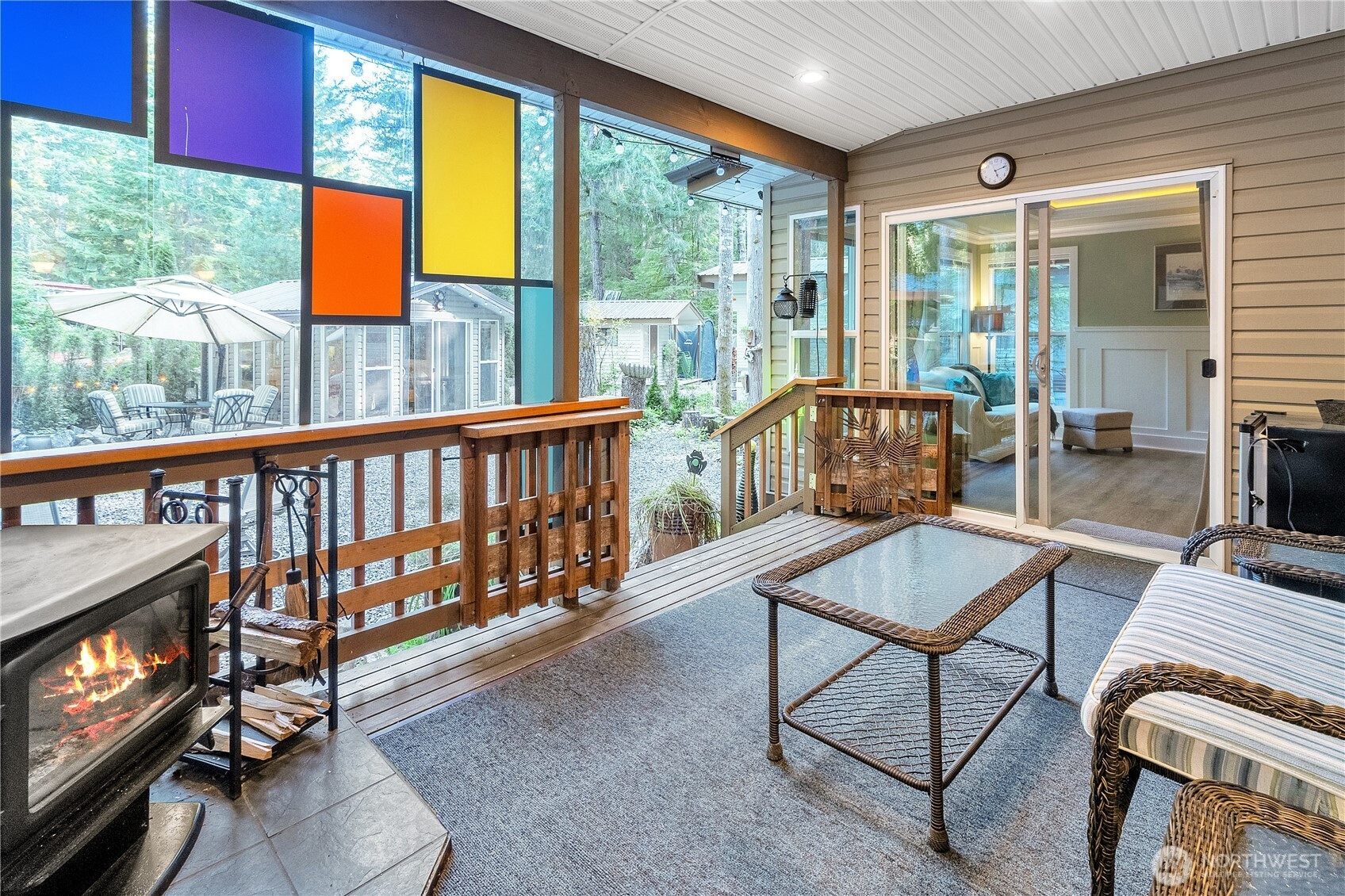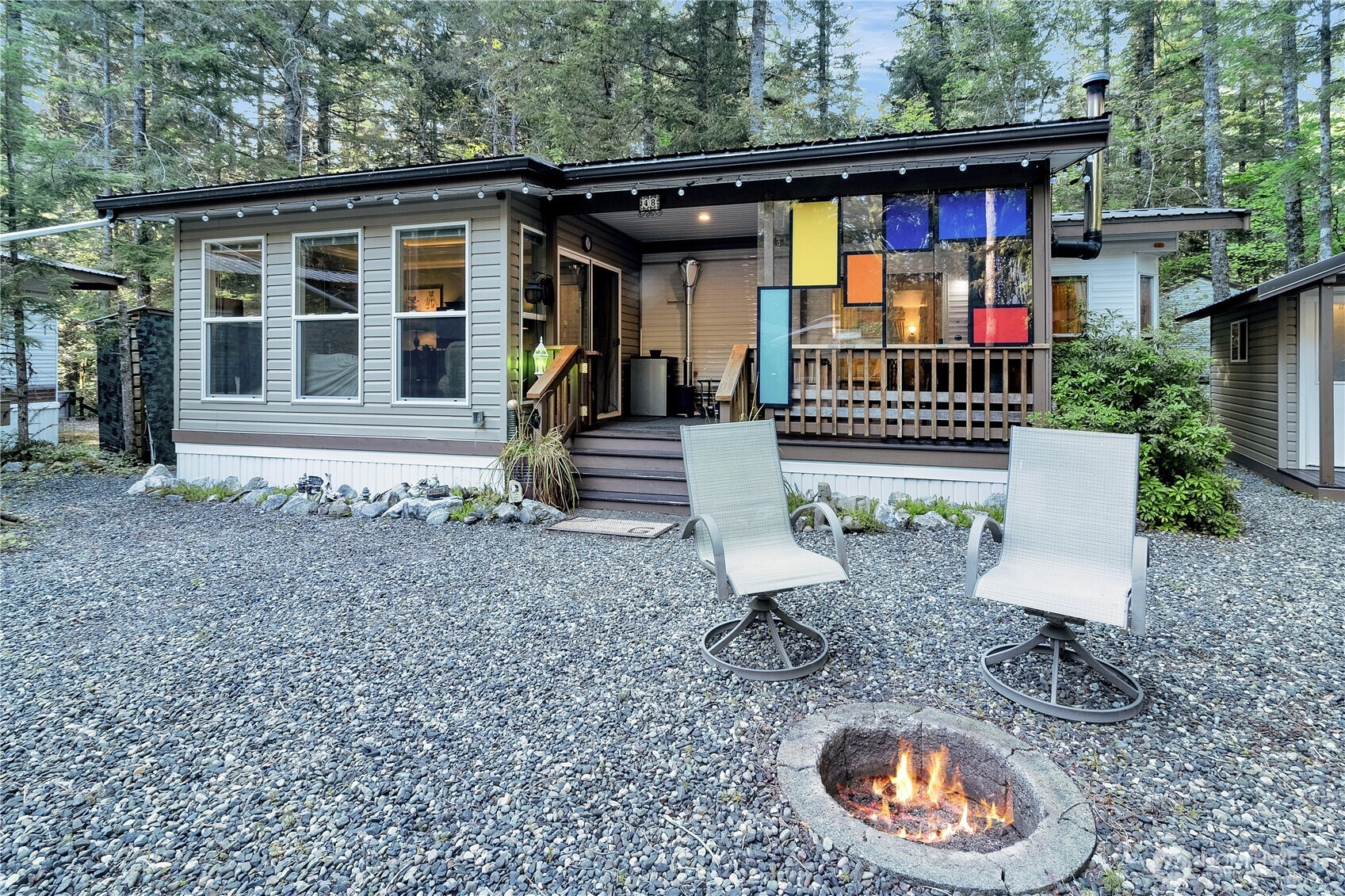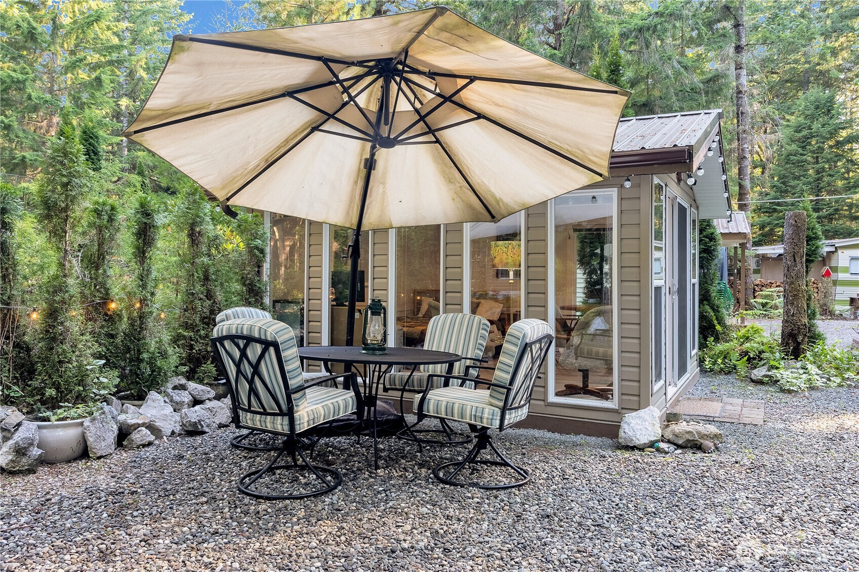 Backing greenbelt for extra privacy, this well cared-for park model has room to spread out and relax. The large add-a-room features wainscoting and a cove ceiling, and the freshly updated gazebo (new paint and flooring) gives you even more space to hang out. There’s also a storage shed for the practical stuff. Inside you’ll find full-size stainless appliances, a bathroom with tub/shower combo, and a spacious dining area that actually works for gathering. The partially enclosed deck with wood stove makes it easy to enjoy in cooler months, and outside you’ve got a fire pit plus umbrella-covered seating and swing chairs for long summer evenings. It comes thoughtfully furnished and comfortably sleeps 8+, making it a great adventure home base year-round. Community amenities include pools, hot tub, sauna, tennis & basketball, 24/7 security & more! Occupancy limited to 120/days per year. No rentals.