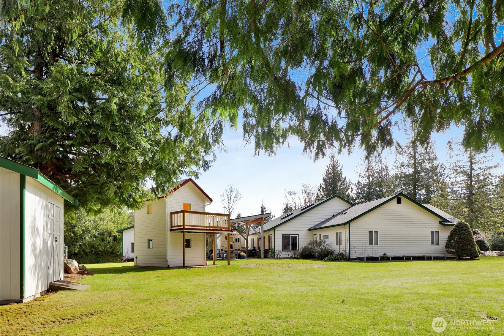 Private 4+ acre retreat offering space, versatility, and room to truly enjoy the outdoors. This beautifully maintained 4-bedroom rambler is designed for entertaining, featuring an inviting layout that flows seamlessly to a spacious covered back deck—perfect for year-round gatherings. Thoughtfully designed, the primary suite is privately situated at one end of the home, creating a peaceful retreat, while the additional bedrooms are located on the opposite side for ideal separation and functionality. The expansive, flat property is fully landscaped and meticulously cared for, creating a serene and highly usable setting. A standout feature is the impressive 2,100 sq’ fully equipped shop with ample space for an RV, large boat, and all your toys—ideal for hobbyists, storage, or workspace needs. The 800 sq’ two-level casita offers incredible flexibility for guests, multi-generational living, or potential rental income. Enjoy endless outdoor fun with a charming playhouse, zipline, and private trails winding through the property. Tucked away in a quiet setting, yet just 10 minutes to central Bellingham and located in the desirable Meridian School District, this property delivers the perfect blend of privacy, functionality, and lifestyle.