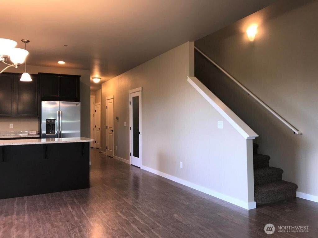 Step inside this Charming Home and you are welcomed by an open, airy kitchen and living room with abundant natural light. The kitchen is large and spacious, outfitted with top-notch appliances. Dark wood cabinets and hardwood floors are in balance with the white granite countertops. A bonus is the walk-in pantry (with door) tucked underneath the staircase. The Kitchen and Dining area provide an ideal space for meals and gatherings. Down the hall you will find a bathroom and the entrance to a large two car garage. All three bedrooms are located upstairs. The Primary bedroom is spacious, high ceilings providing a light & airy feel, with its own private en-suite walk-in closet. There are two additional bedrooms upstairs, one of which also features a walk-in closet. A large laundry room includes washer and dryer, and best of all another full bathroom upstairs! Fresh paint and brand new carpeting throughout the home! This property features a fully fenced backyard and a wooden deck off the living room to enjoy some privacy and the view of trees and skyline. Quiet neighborhood, yet within walking distance of Shops, Restaurants, Entertainment and other services at Bellis Fair Mall. Quick and easy access to I-5