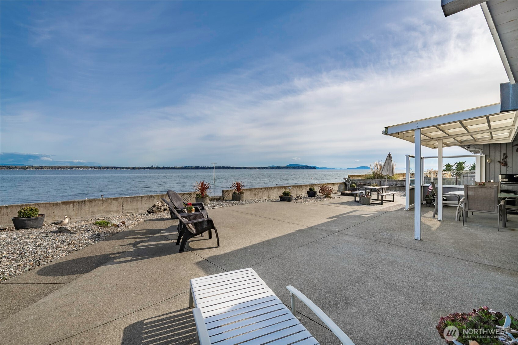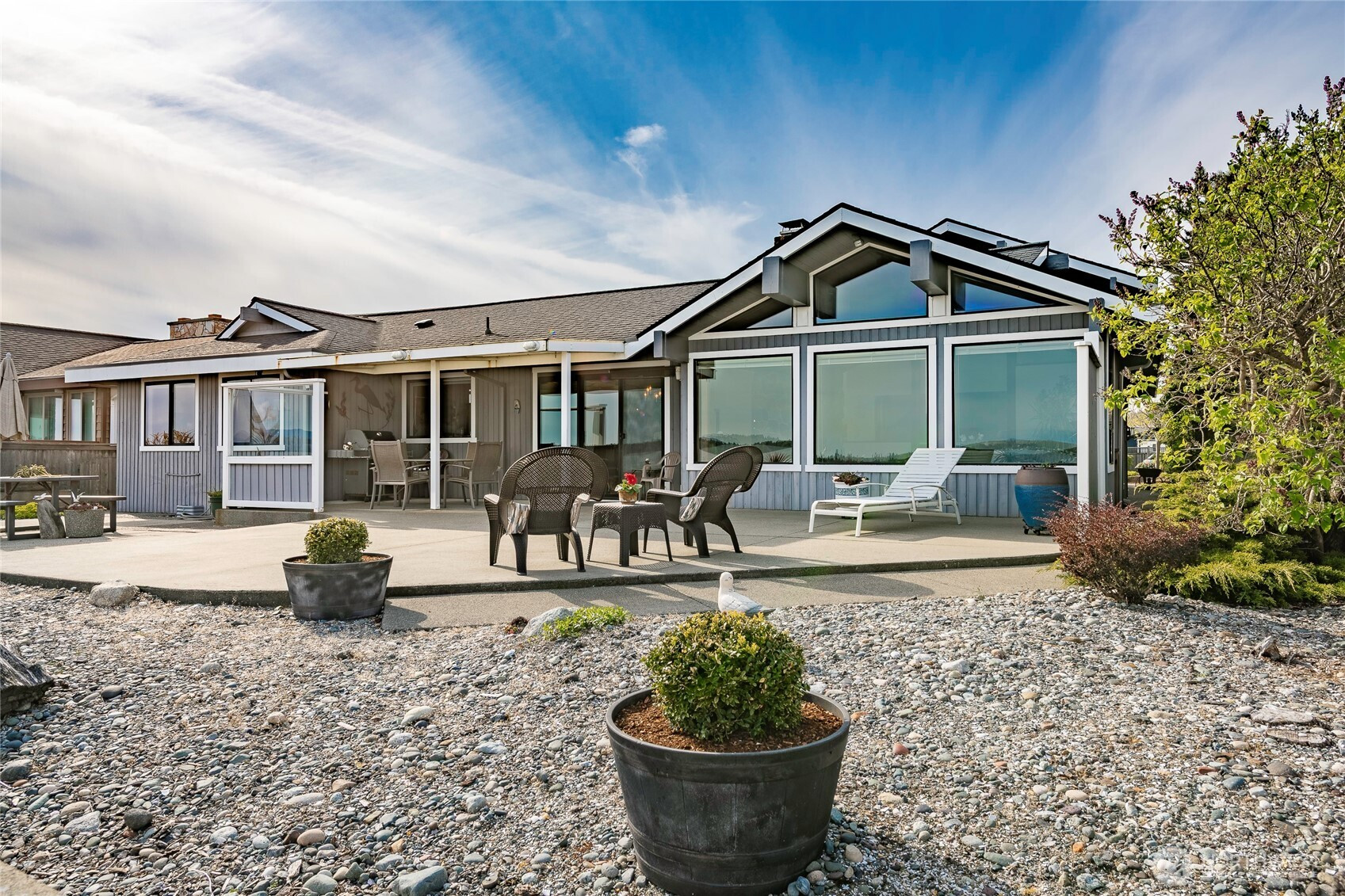On the beach in sought-after Birch Bay Village, this 2,971 sq. ft. rambler offers 70 feet of low-bank, walk-out waterfront w/sweeping sunrise views over Mt. Baker & Birch Bay right from your home—this is coastal living at its best. The light-filled great room, framed by expansive windows, captures panoramic water scenes & perched bald eagles, while charming design elements add timeless character throughout. The single-level layout flows effortlessly, featuring a water-view primary bedroom w/ensuite bath, plus two bedrooms & two baths. Main space offers a spacious kitchen & dining area that opens to an oversized patio, ideal for all gatherings. Relax by the formal living room fireplace or in the versatile flex room, perfect for a media or game room with a wet bar. An airy loft awaits as your dream office/art studio, or creative haven. The sprawling floor plan connects to a private-entry guest suite complete with its own kitchen/living/bedroom & bath…ideal for multigenerational living or visitors. Outside, the property features a four-car garage, boat and RV parking (w/ hookups), a lush private courtyard & permanent concrete bulkhead. Birch Bay Village, a gated community, offers 24/7 security, marina, golf course, clubhouse, pool, pickleball & tennis courts, beaches, parks, and a golf cart-friendly community. This waterfront treasure is more than a home—it’s a gateway to a vibrant yet serene lifestyle. Make this slice of paradise your own and create lasting memories!