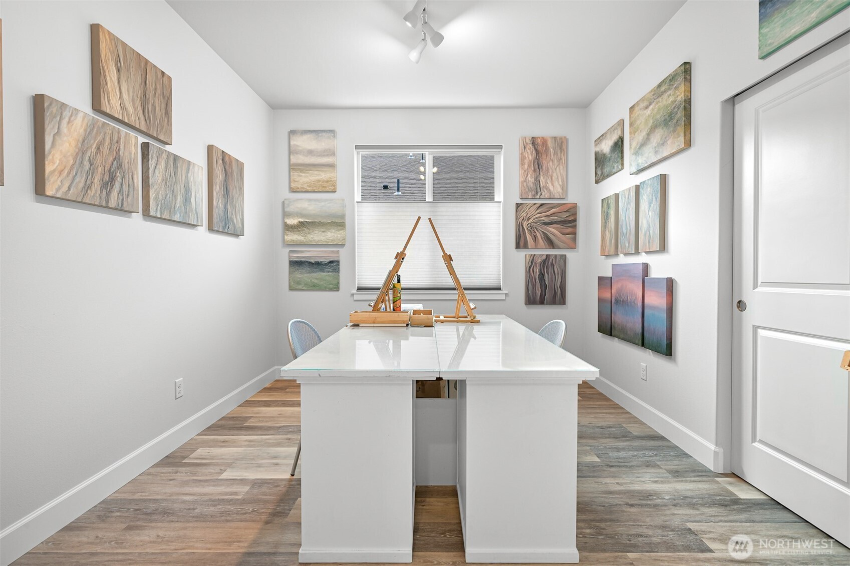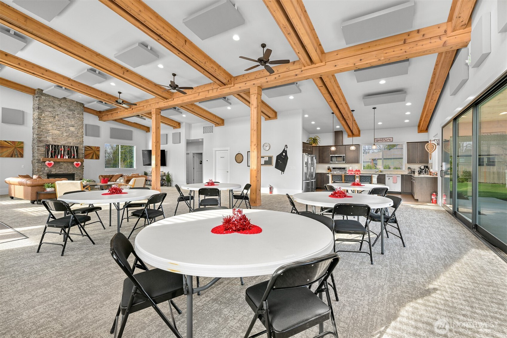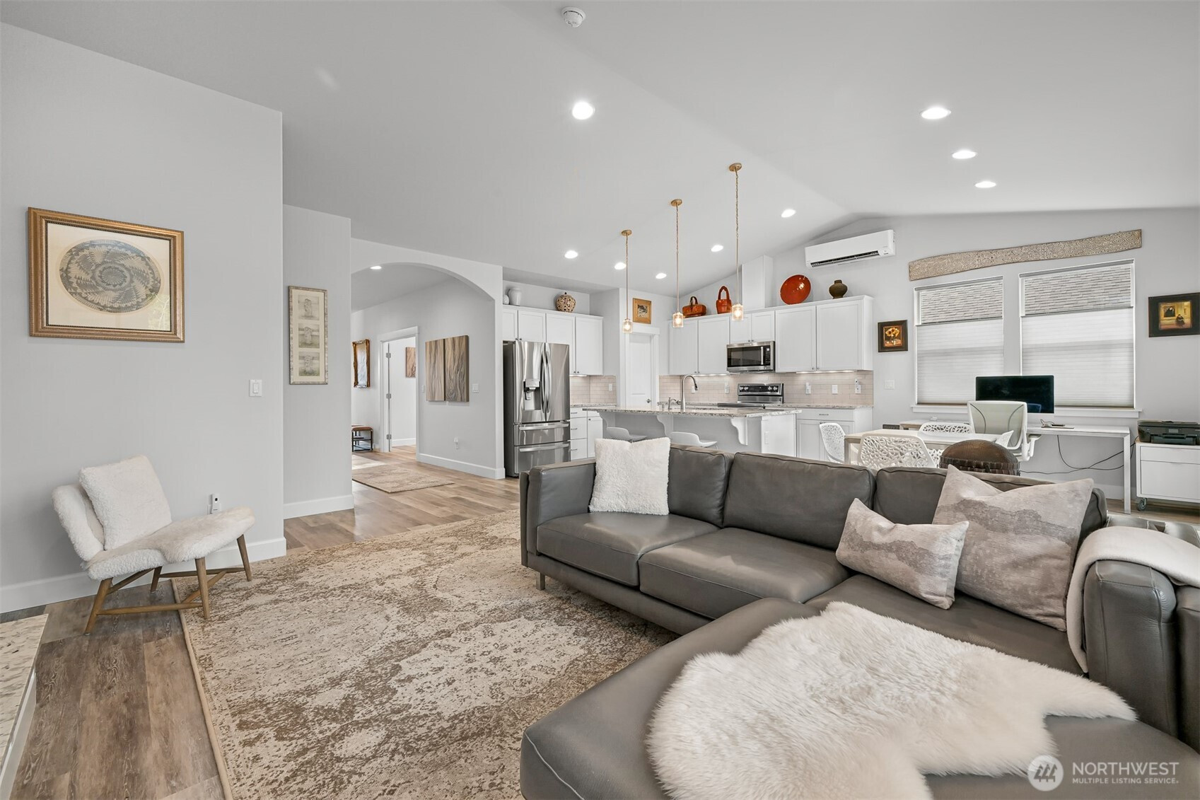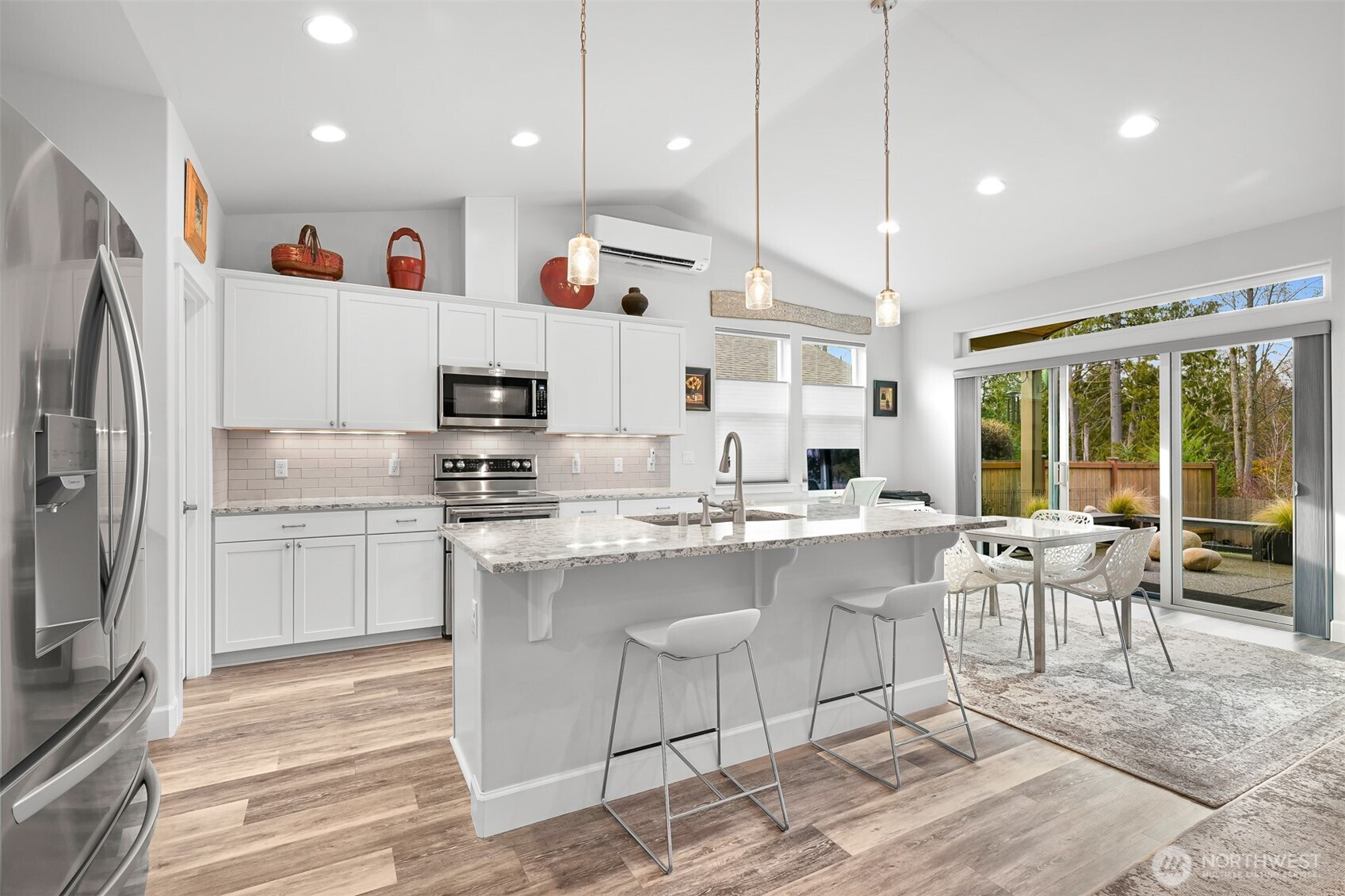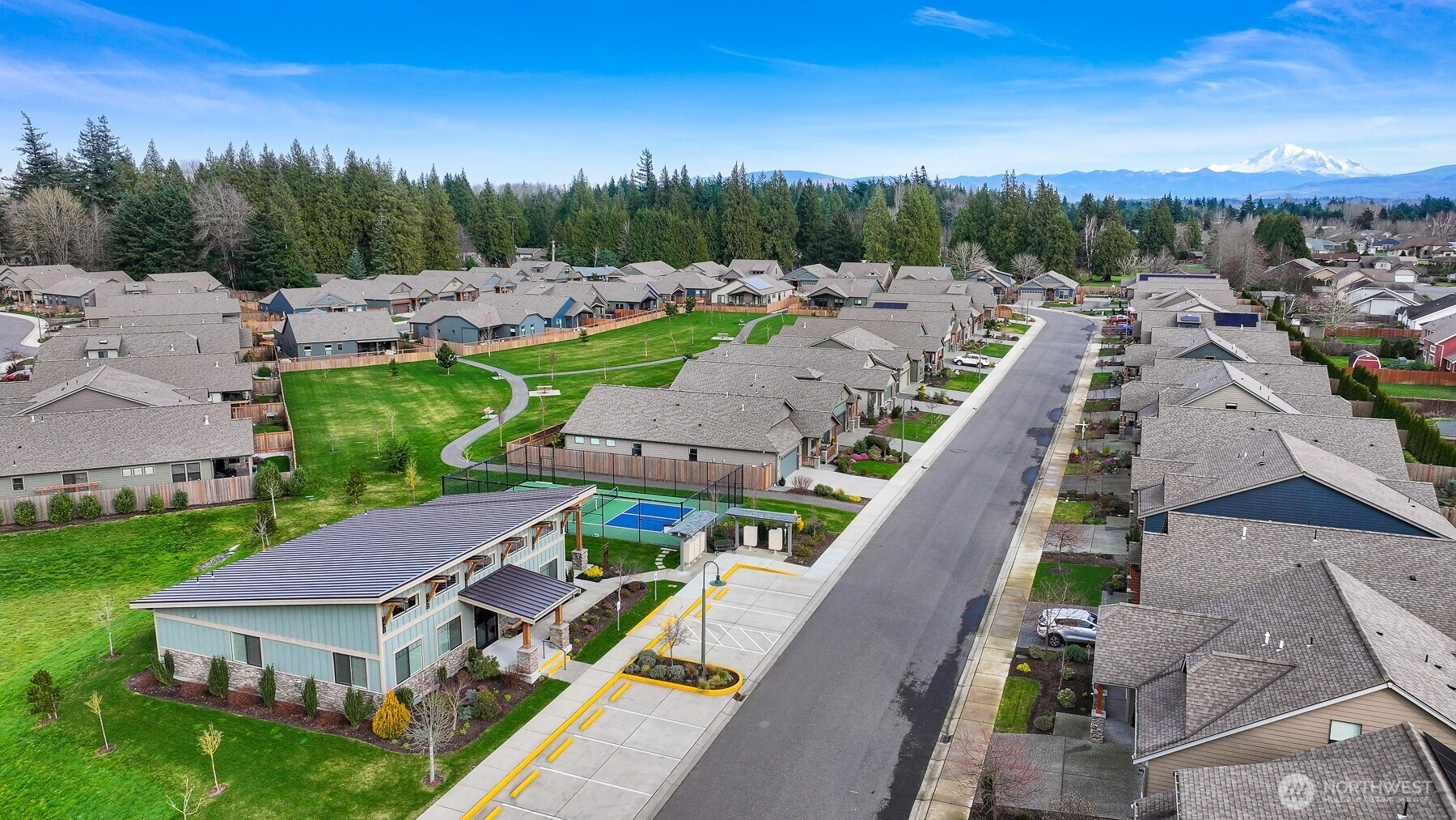 Nestled in the sought-after Woods Point 55+ gated community, this stunning one-level home offers comfort, privacy and convenience just minutes from Bellingham’s shopping, dining, entertainment, and medical facilities. Close to charming Ferndale and I-5 for easy travel, this community boasts many amenities, including a stylish clubhouse, scenic walking trails and a pickleball court and covered patio. Perched on a premium lot with no rear neighbors, the west-facing fenced backyard is a serene retreat with lush lawns, gardens, and tranquil greenspace views—all with landscape maintenance included. An expansive covered patio complete with a gas fireplace is perfect for year-round relaxation and entertaining. This outdoor haven seamlessly connects to the dining space by a large slider; multiple windows flood the area with natural light and fresh air. A no-step entry connects to an impressive open-concept layout, replete with natural light, vaulted ceilings and luxury vinyl plank floors. The great room features a gas fireplace and flows into a gourmet kitchen with white cabinetry, quartz countertops, a large island and a pantry. The split-bedroom design offers privacy with a primary suite showcasing a spa-like tiled shower, double vanity, walk-in closet and separate water closet. Extras include motorized shades, a heat pump with A/C and a spacious laundry room. With sidewalks, streetlights, and a welcoming neighborhood vibe, this exceptional home affords serenity, comfort and charm.