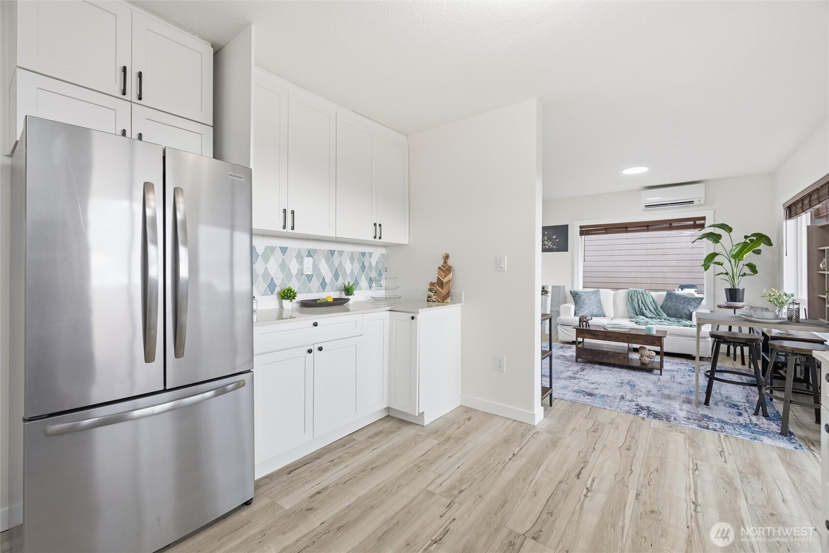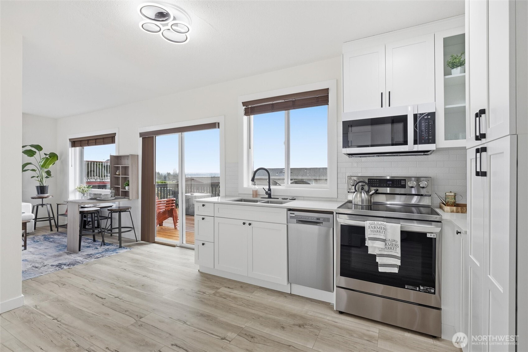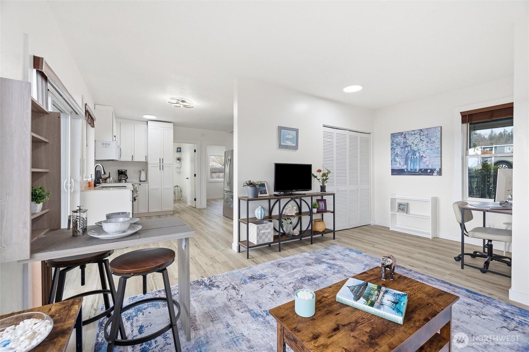 This stick-built home was completely renovated from top to bottom. The 2-bed, 2-bath home offers modern comfort in a quiet neighborhood with stunning water views. Enjoy peace of mind with all-new plumbing, updated siding with fresh exterior paint, a brand-new deck, LVP flooring, new lighting, and excellent insulation throughout. The redesigned kitchen features quartz countertops, soft-close cabinetry, a dishwasher, a garbage disposal, and a washer/dryer combo for convenience. Newer mini-split system offering efficient heating and AC. Outside has an impressive collection of fruit trees—apple, plum, and cherry—plus raspberries, blackberries, and rhubarb for your own backyard harvest. A truly move-in-ready home with thoughtful upgrades and picturesque surroundings.